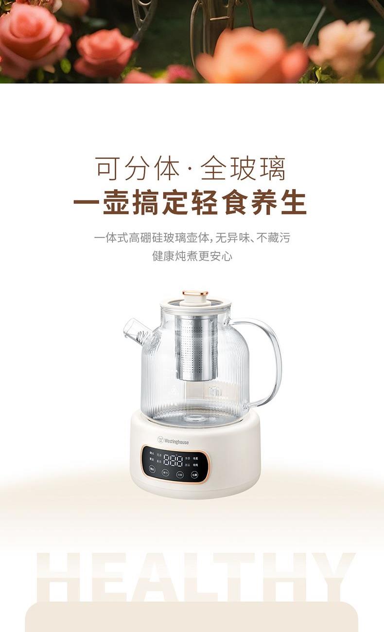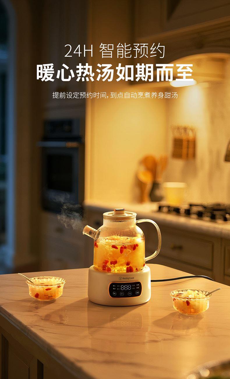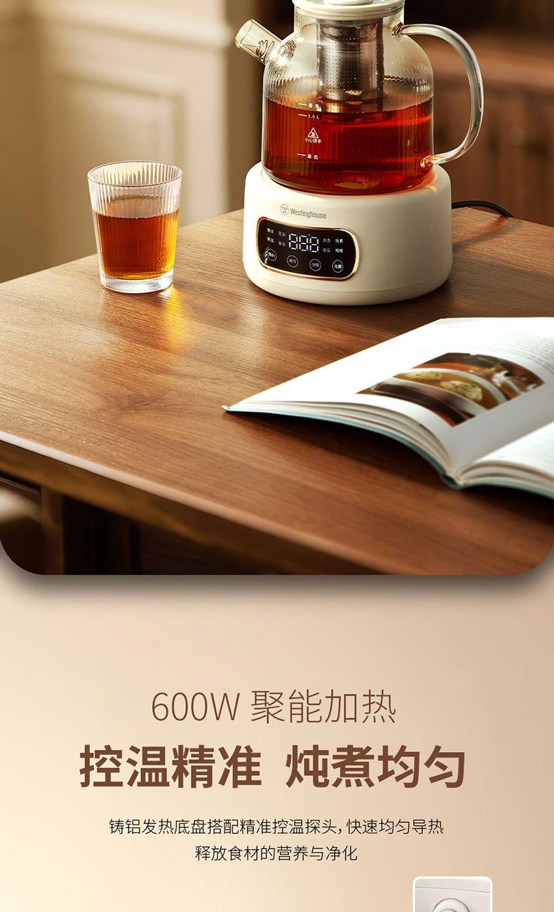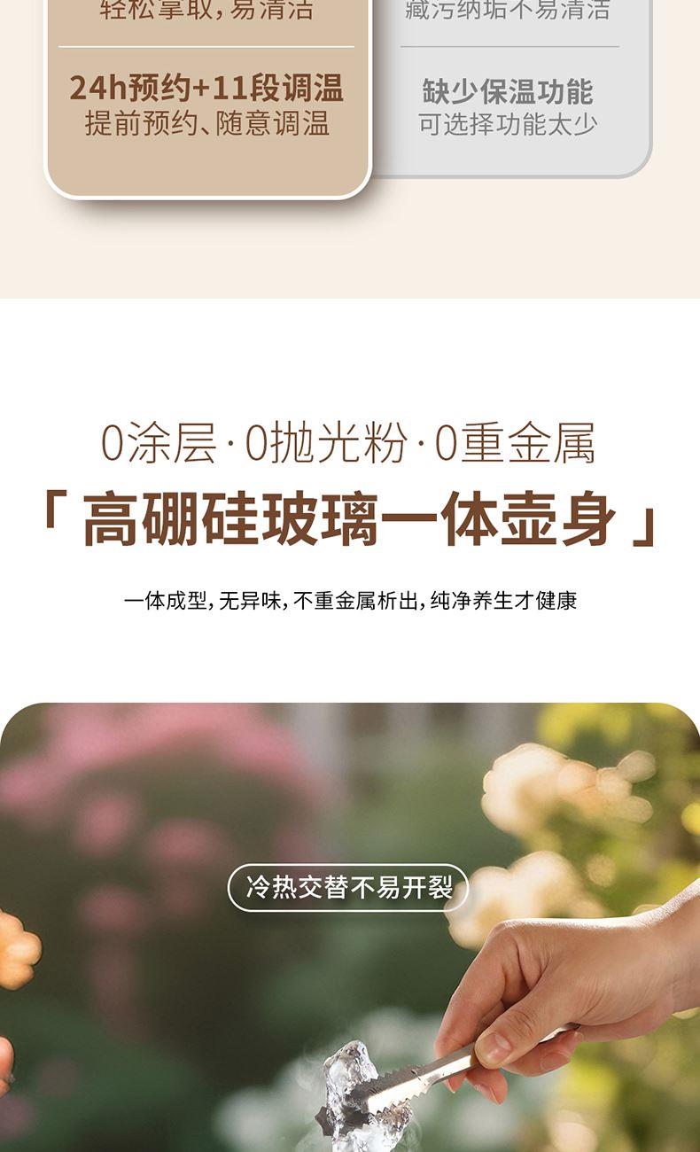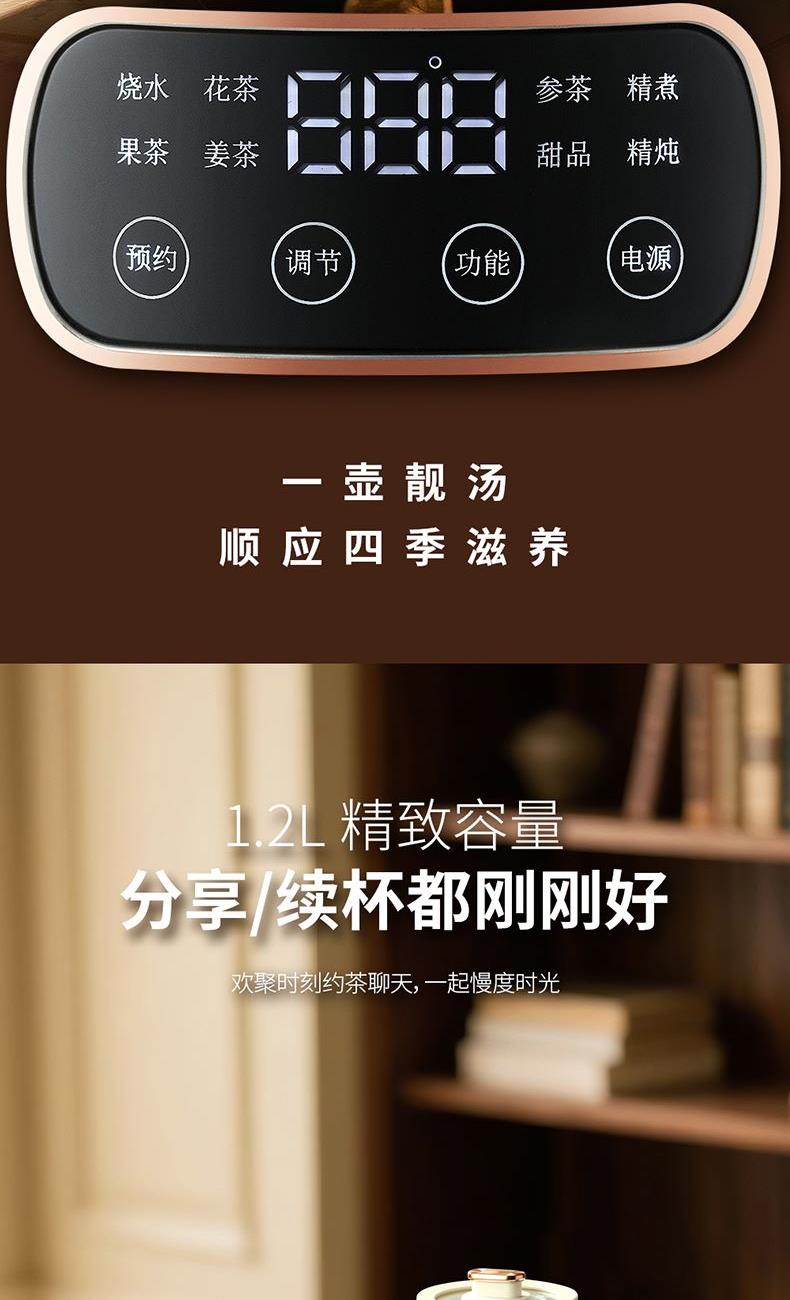 产品规格: 1、额定电压:220V~50Hz 2、额定功率:600W 3、额定容量:1.2L 4、壶体材质:高硼硅玻璃 5、操作方式:触控式 6、产品颜色:米白色 产品特点: 1、高硼硅玻璃一体壶身,安全卫生耐高温; 2、八大养生菜单,11段控温系统,适配多种饮品烹煮; 3、24h智能预约,暖心热汤如期而至; 4、防干烧过热保护,使用更安心; 5、滤嘴滤网双重搭配,细腻隔渣; 6、分体式壶身,拿取更方便。