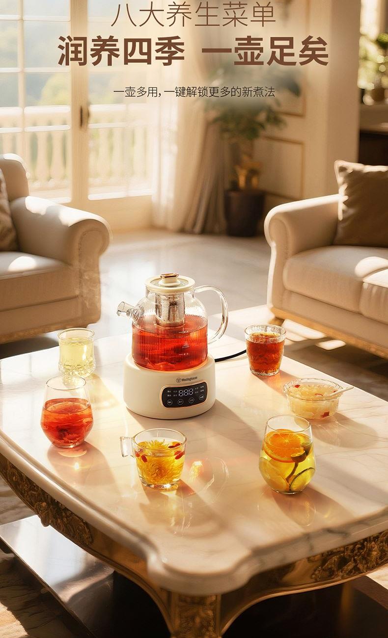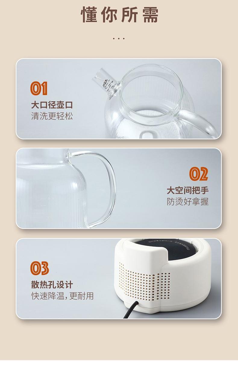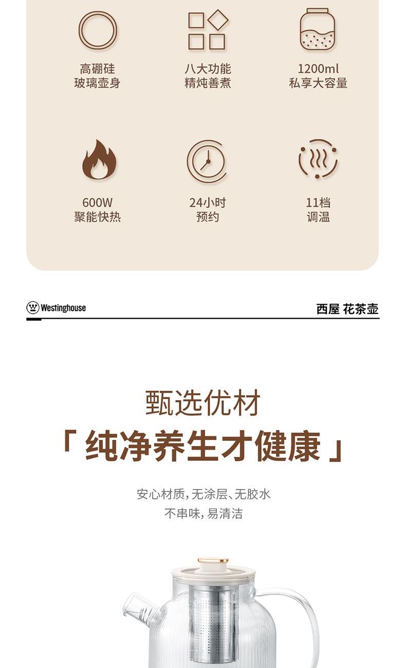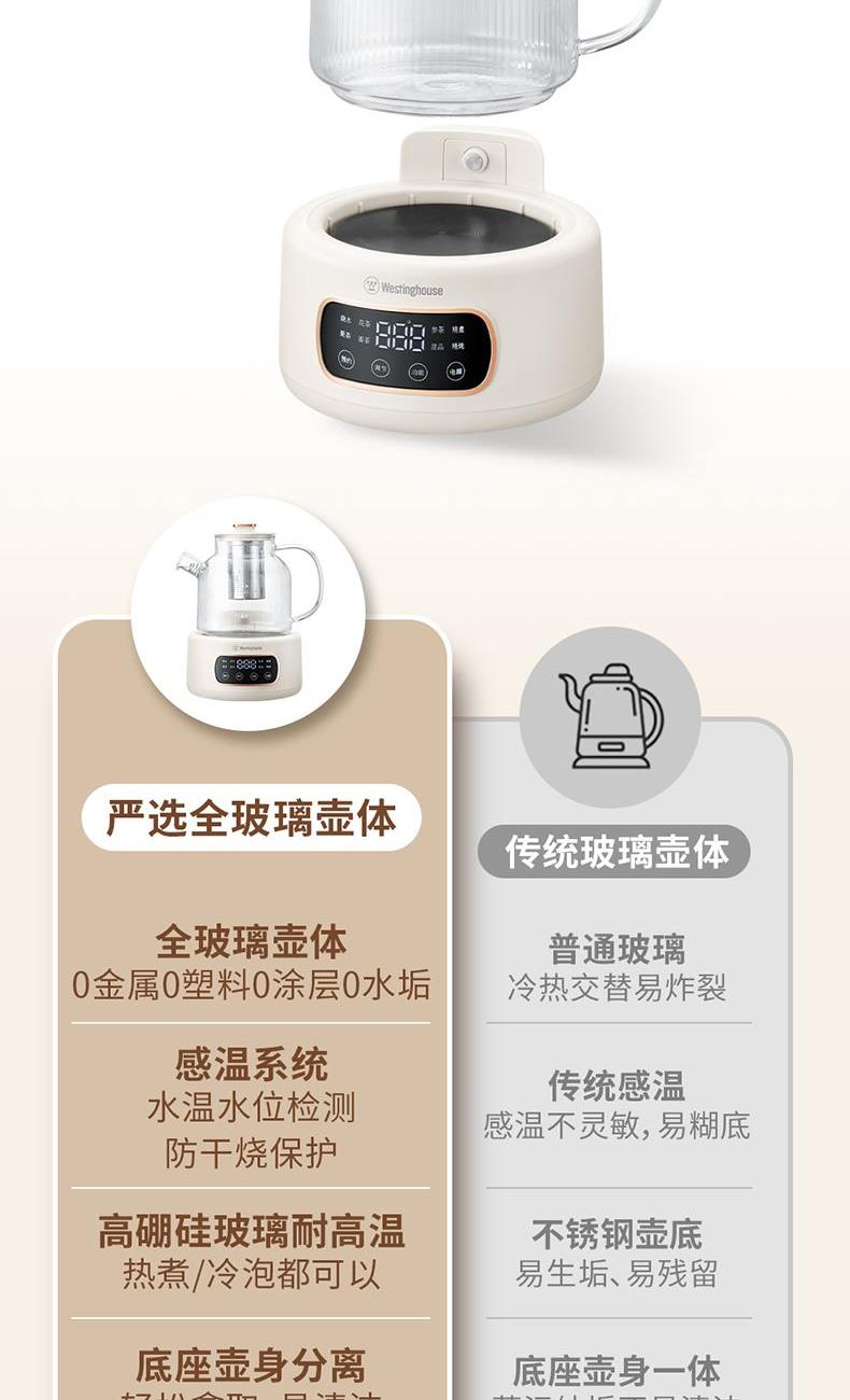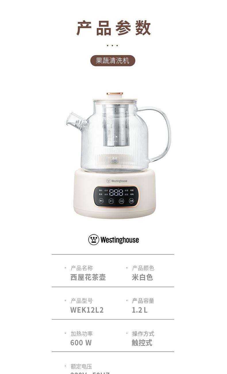 产品规格: 1、额定电压:220V~50Hz 2、额定功率:600W 3、额定容量:1.2L 4、壶体材质:高硼硅玻璃 5、操作方式:触控式 6、产品颜色:米白色 产品特点: 1、高硼硅玻璃一体壶身,安全卫生耐高温; 2、八大养生菜单,11段控温系统,适配多种饮品烹煮; 3、24h智能预约,暖心热汤如期而至; 4、防干烧过热保护,使用更安心; 5、滤嘴滤网双重搭配,细腻隔渣; 6、分体式壶身,拿取更方便。