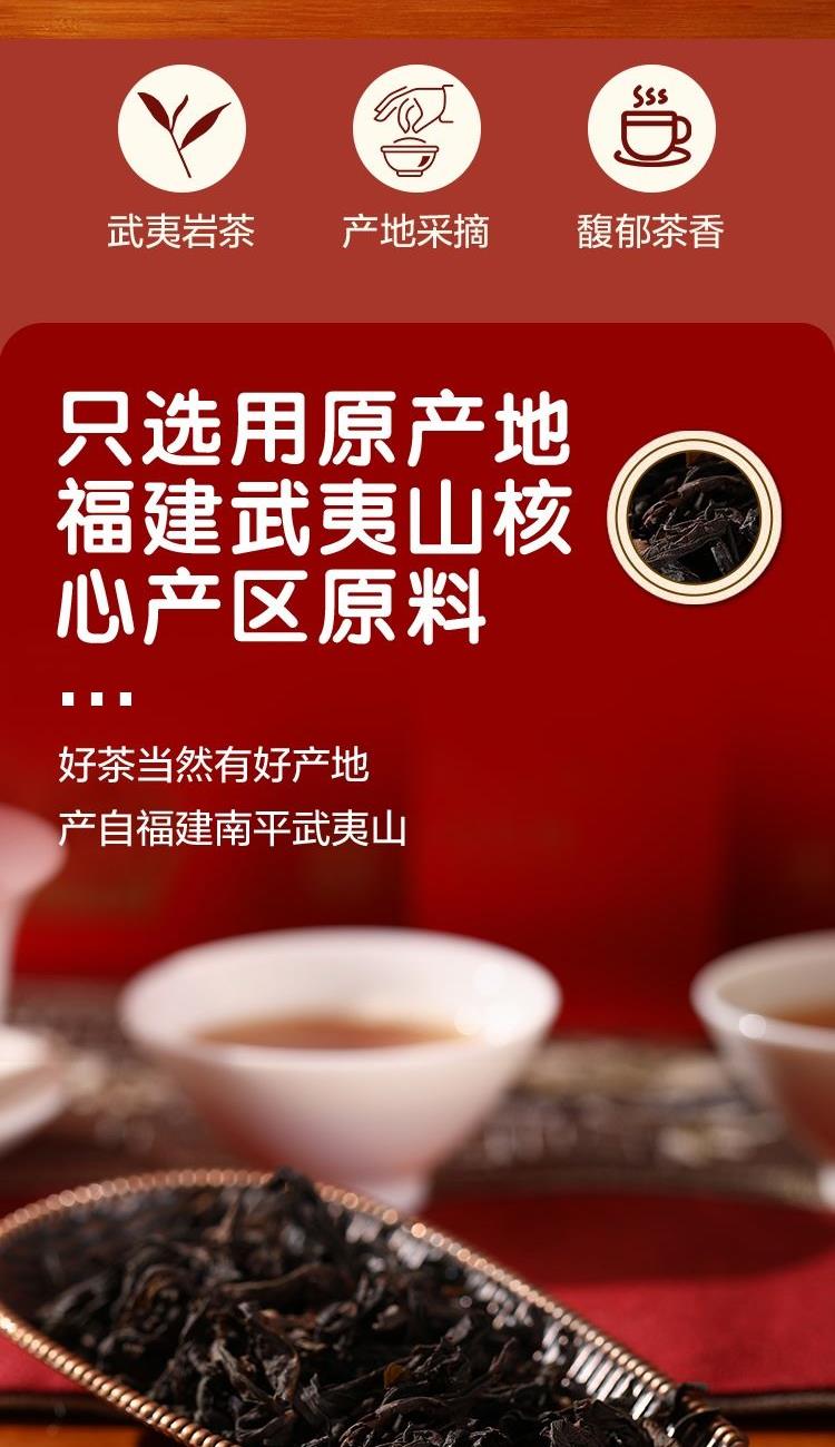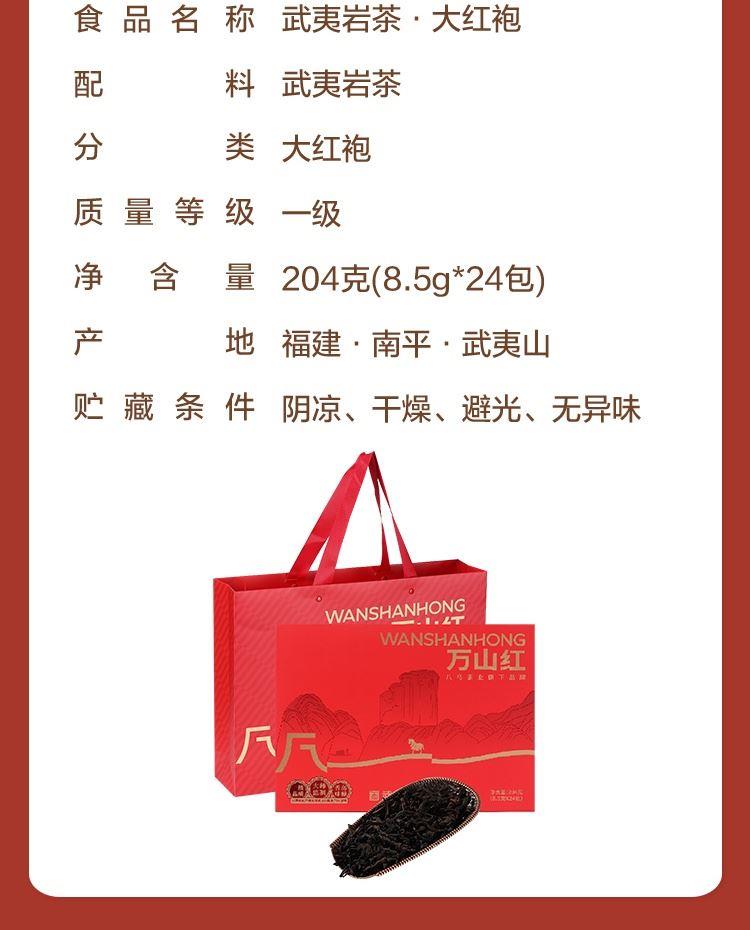 净含量:204克(8.5g*24包) 配料:武夷岩茶 分类:大红袍 质量等级:一级 外盒尺寸:28*7*28cm 原料产地:福建·南平-武夷山 贮藏条件:防潮湿、防异味、避光直射、干燥