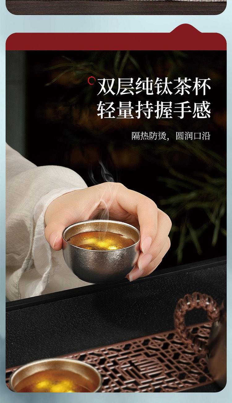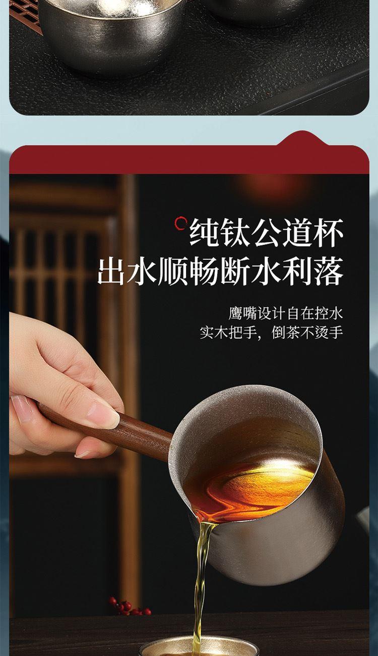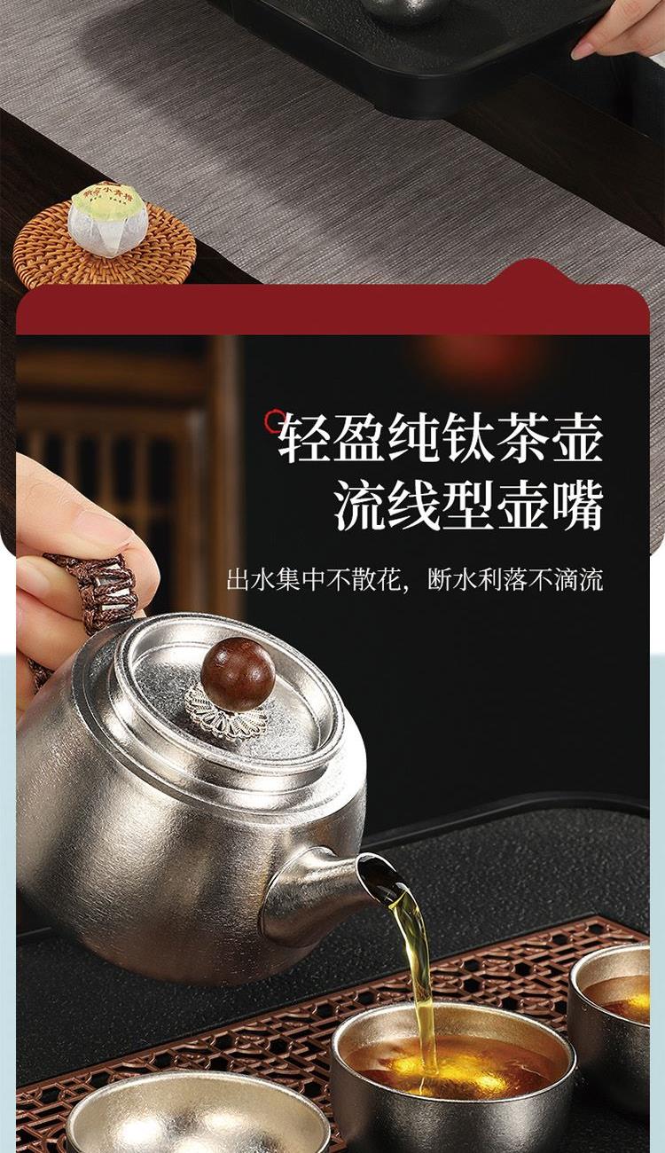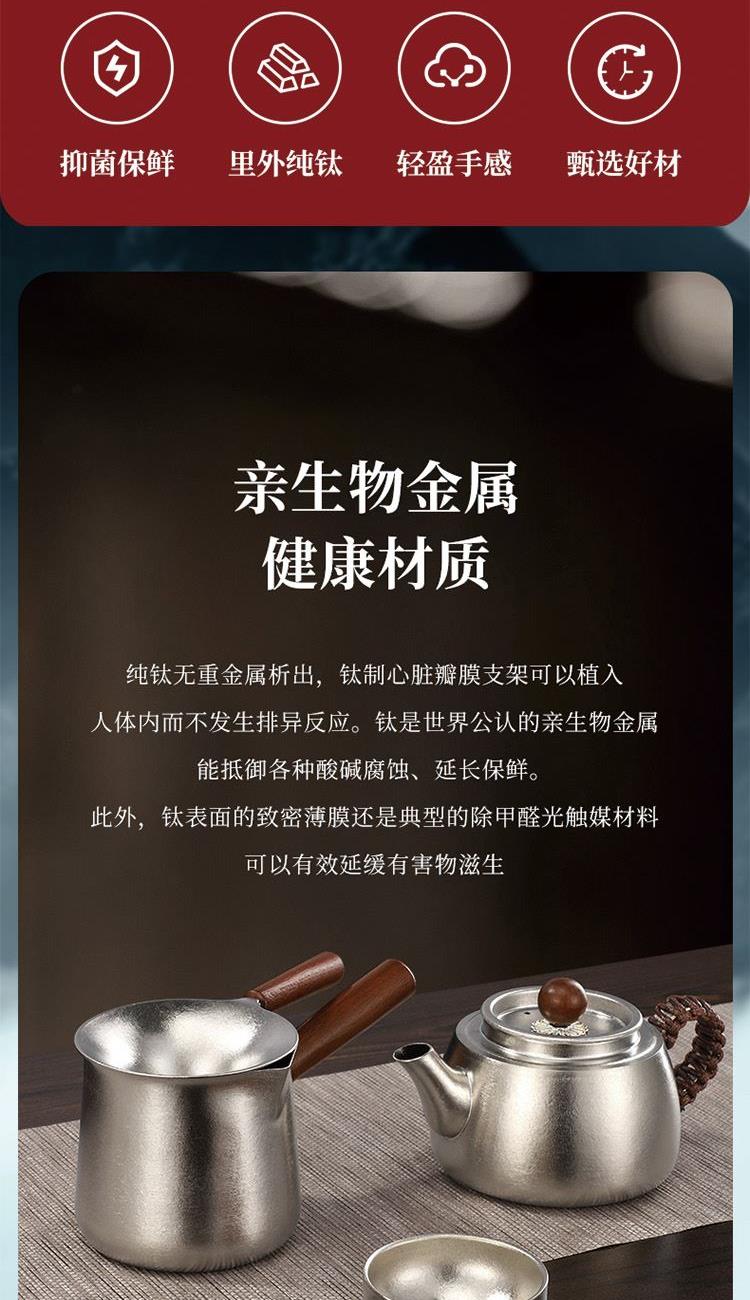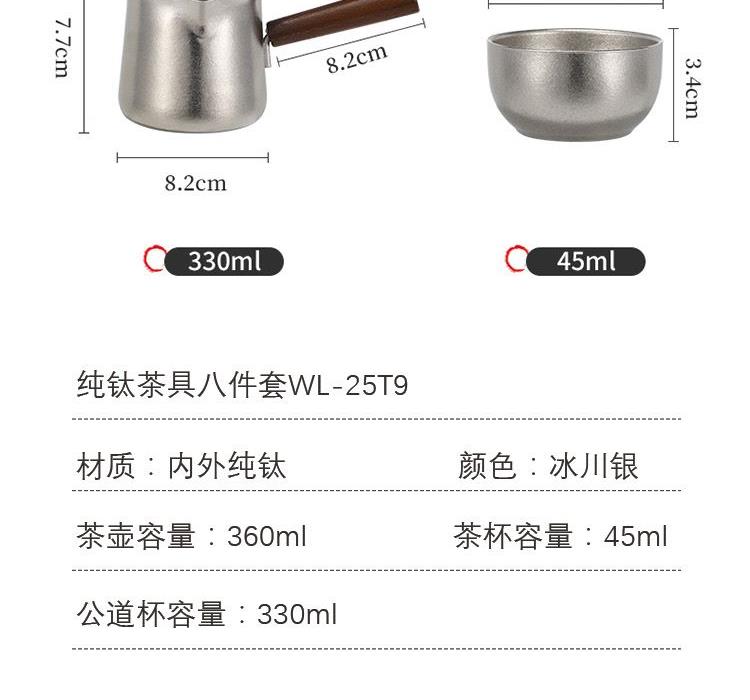 产品参数: 1、产品容量:茶壶容量:360ml; 茶杯容量:45ml 公道杯容量:330ml 2、材质:内外纯钛 3、包装标准:礼盒 4、颜色:冰川银 产品特点: 1、健康纯钛,保鲜不串味,泡茶不败茶; 2、轻盈纯钛茶壶,流线型壶嘴,出水集中不散花,断水利落不滴流; 3、纯钛公道杯,鹰嘴设计,自在控水; 4、纯钛茶漏,西米滤网,清澈茶汤; 5、双层纯钛茶杯,轻量持握手感; 6、经典禅意设计,适应多种风格搭配