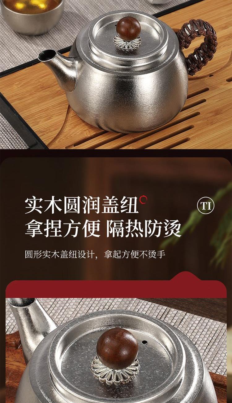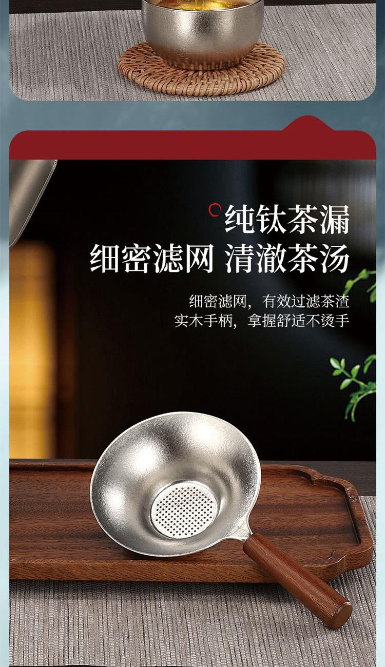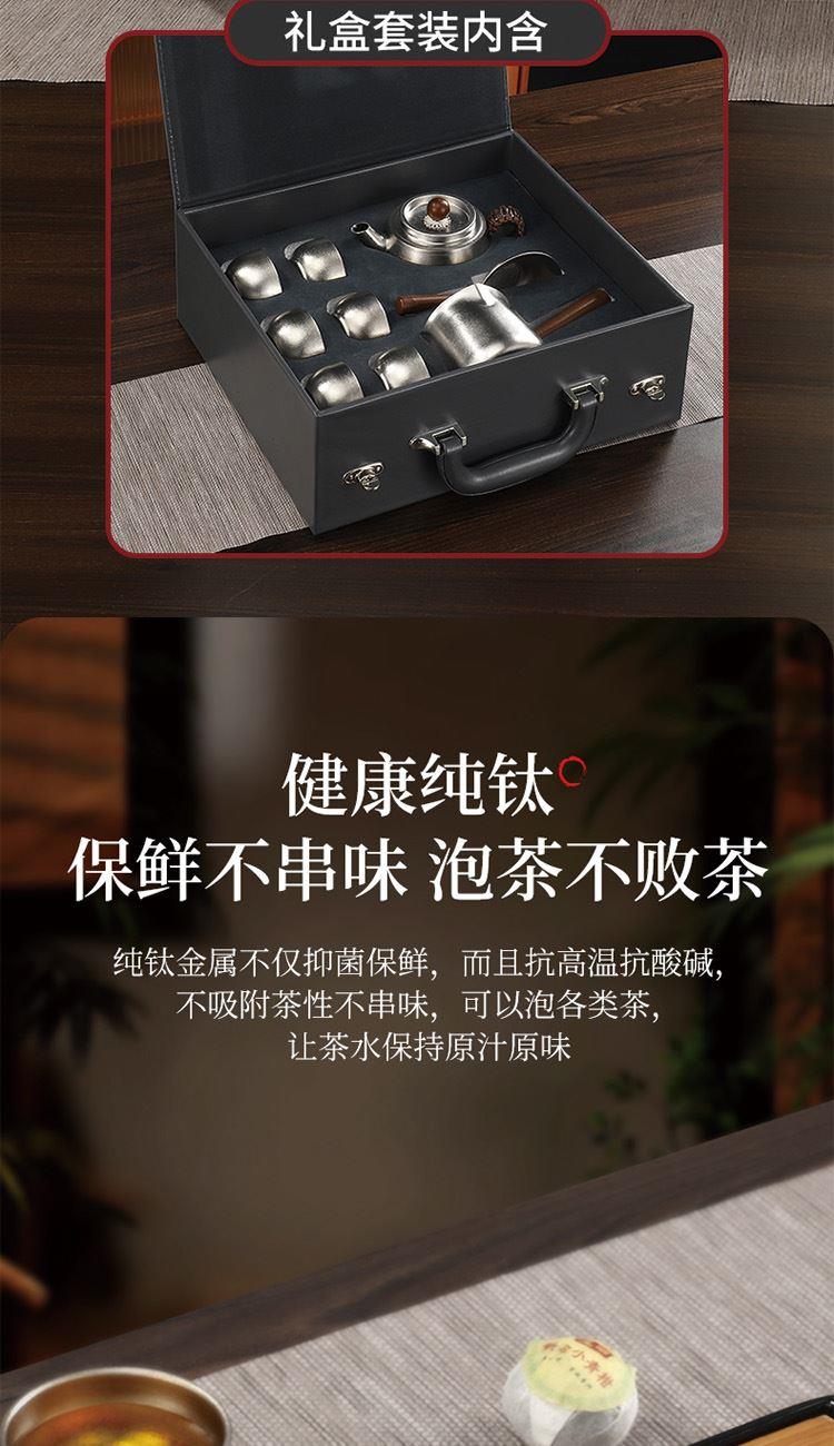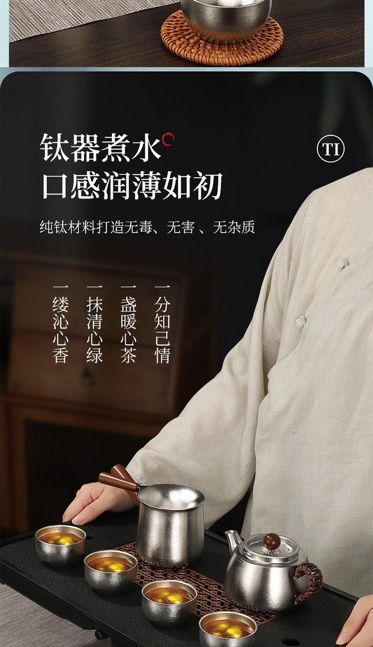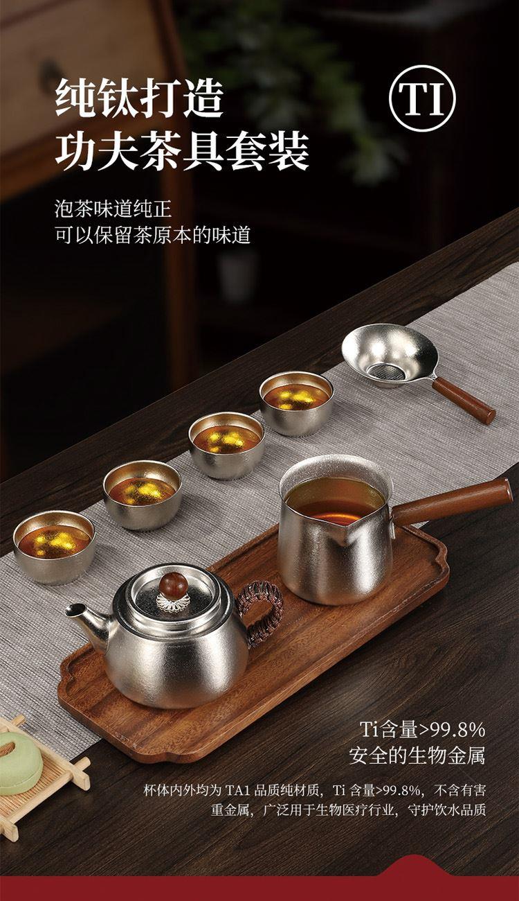 产品参数: 1、产品容量:茶壶容量:360ml; 茶杯容量:45ml 公道杯容量:330ml 2、材质:内外纯钛 3、包装标准:礼盒 4、颜色:冰川银 产品特点: 1、健康纯钛,保鲜不串味,泡茶不败茶; 2、轻盈纯钛茶壶,流线型壶嘴,出水集中不散花,断水利落不滴流; 3、纯钛公道杯,鹰嘴设计,自在控水; 4、纯钛茶漏,西米滤网,清澈茶汤; 5、双层纯钛茶杯,轻量持握手感; 6、经典禅意设计,适应多种风格搭配