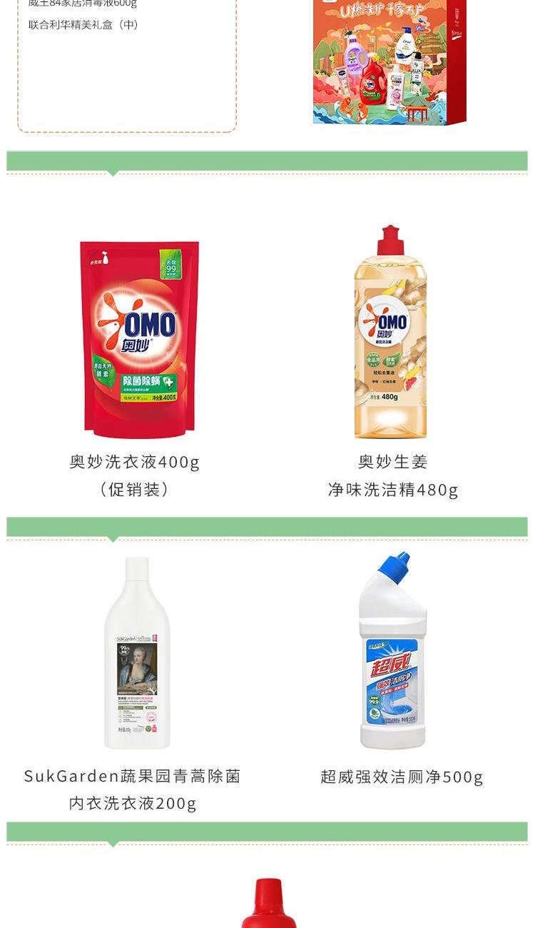 奥妙生姜净味洗洁精480G 奥妙多功能除湿袋(防霉吸湿)200G 奥妙洗衣液400g(促销装) 超威强效洁厕净500g 威王84家居消毒液600g 联合利华精美礼盒(中)