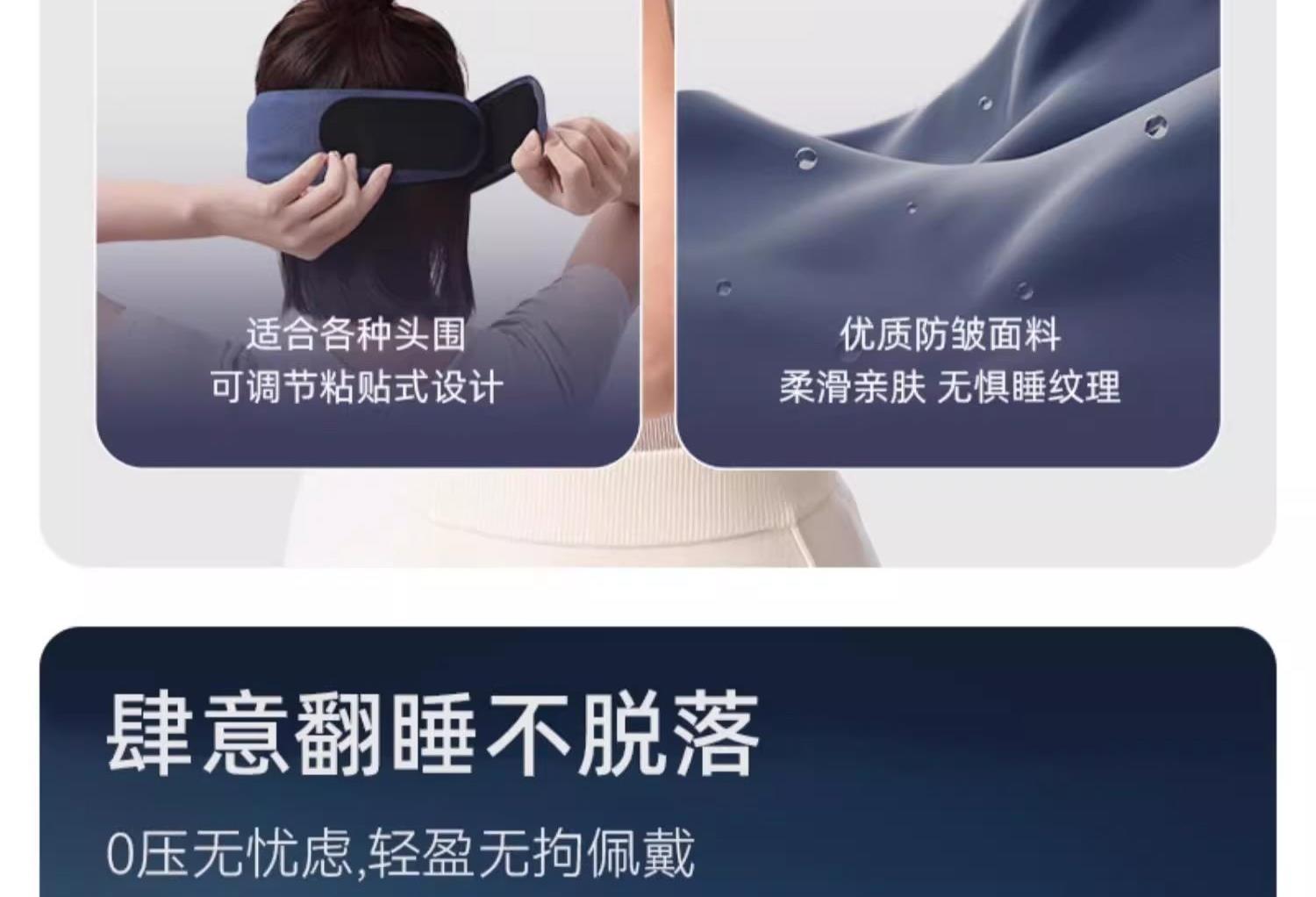 颜色:米白 深灰 紫色 深蓝 单台包装尺寸:155*43*95mm 单台重量:50g(含彩盒) 卖点: 1、轻盈无感,舒适透气,双面肤感可选 2、—体压合成型,简洁干净,无针缝 3、3层结构 ,遮光率99% 4、可调节大小,小巧便携,可水洗 5、舒适面料优等品