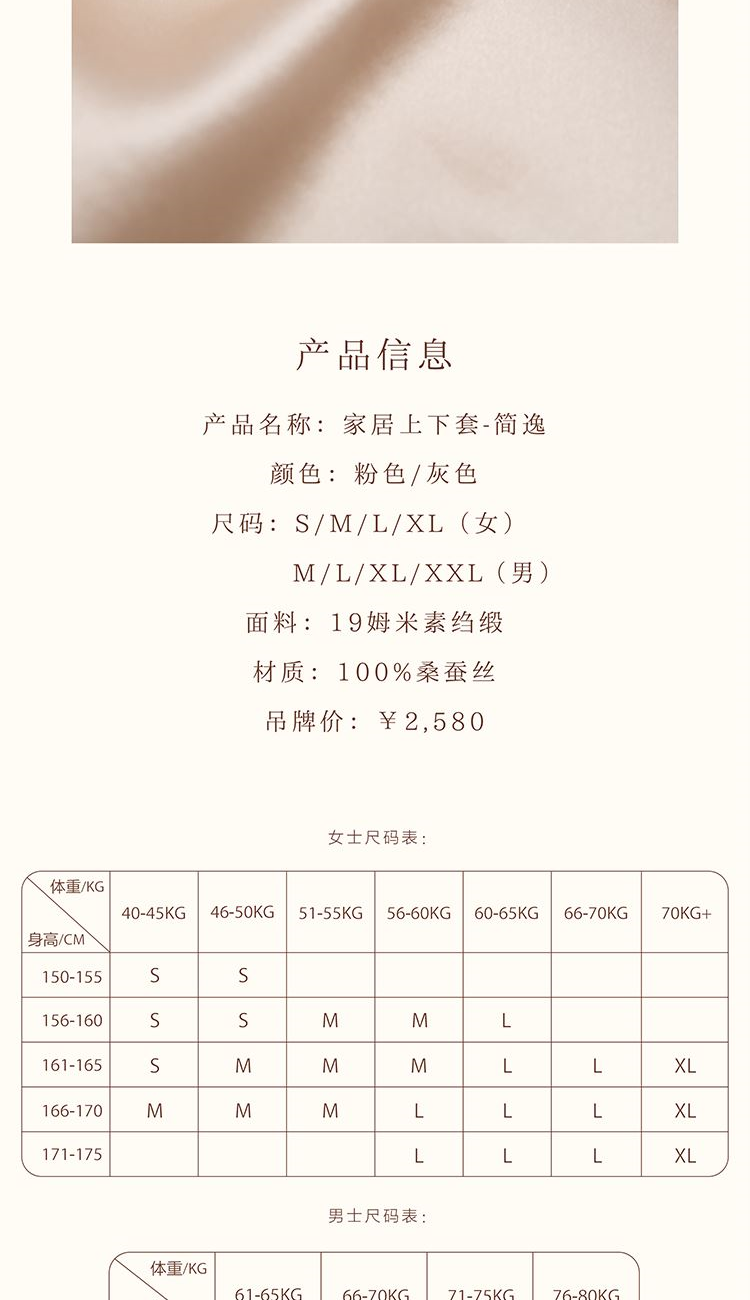 颜色:粉色/灰色 尺码:S/M/L/XL(女) M/L/XL/XXL(男) 面料:19姆米素绉缎 材质:100桑蚕丝