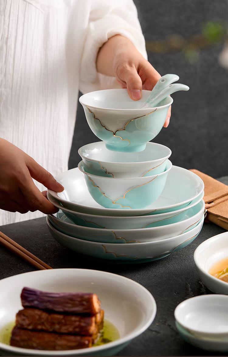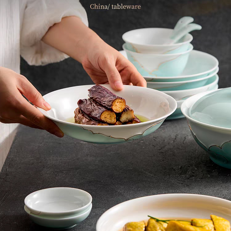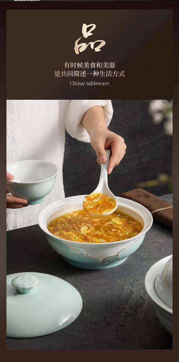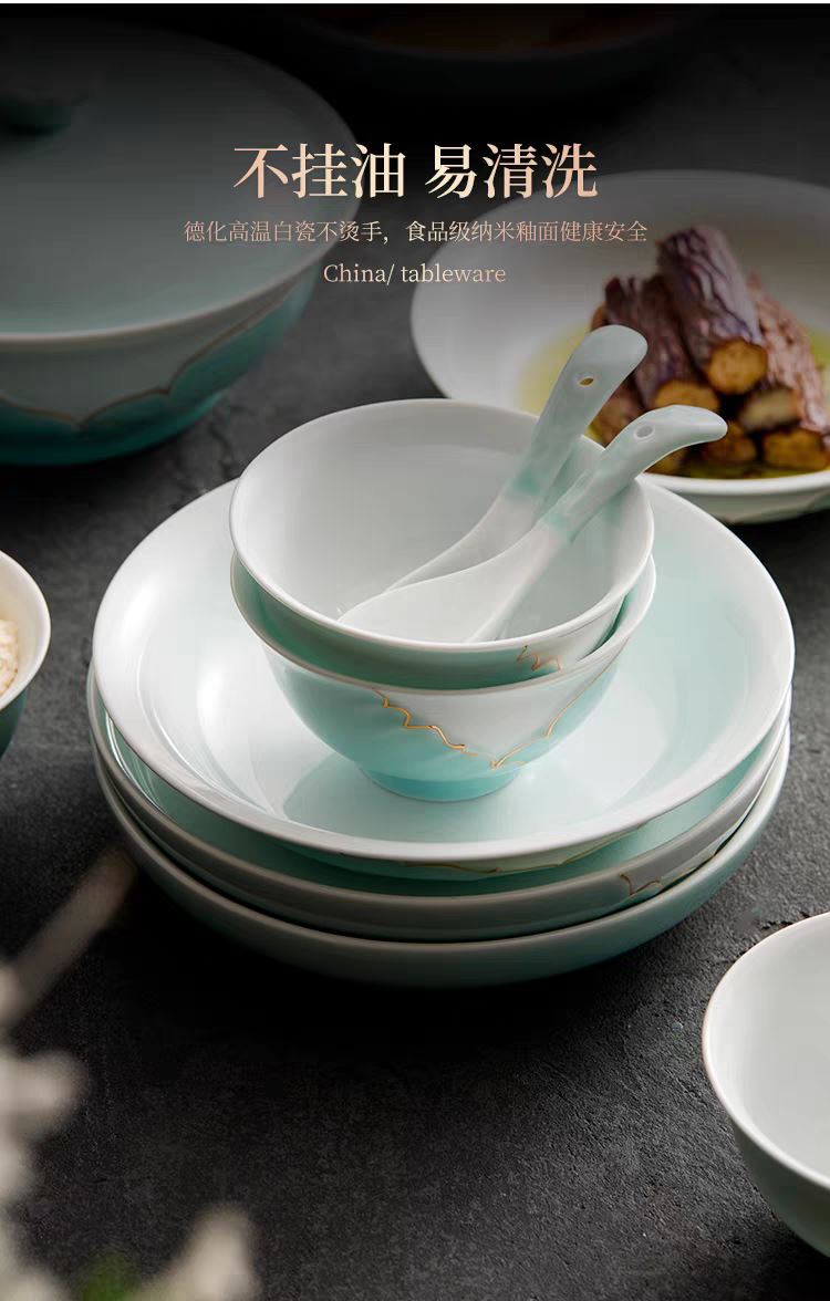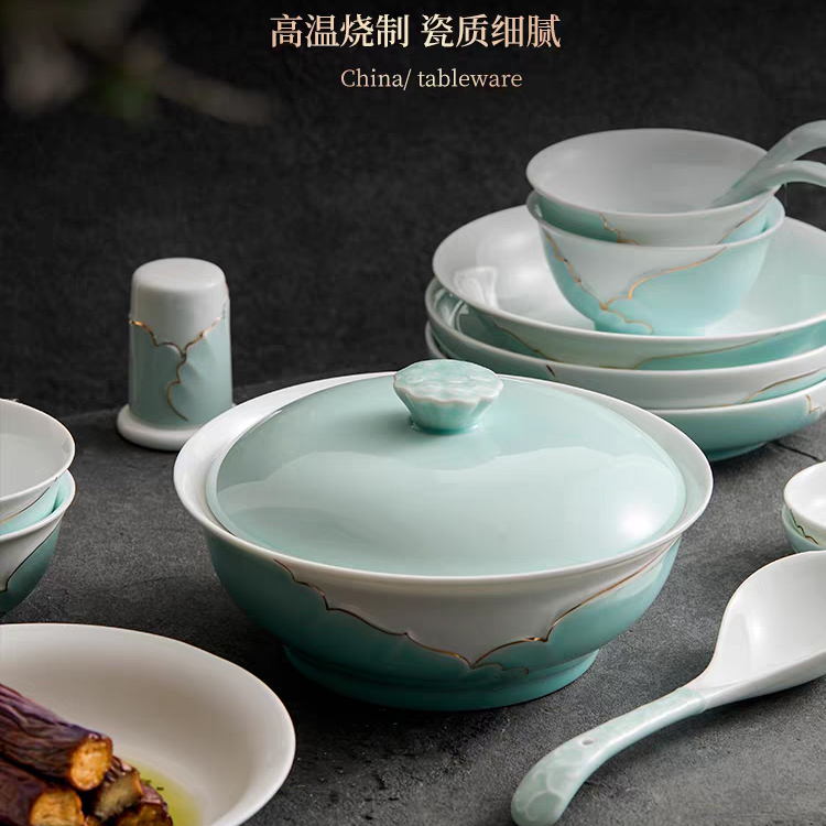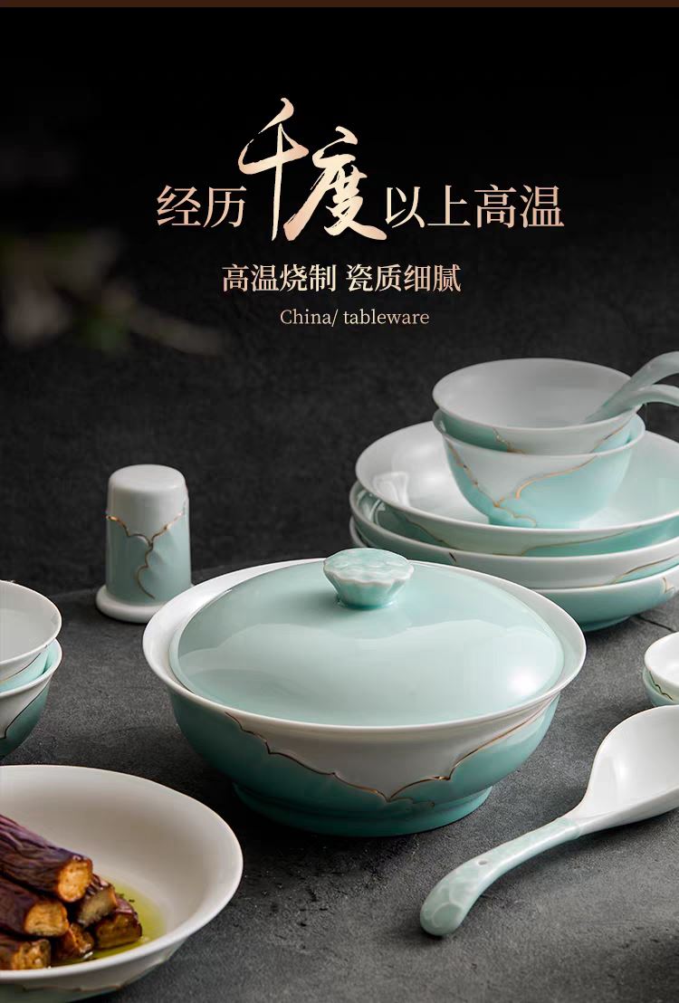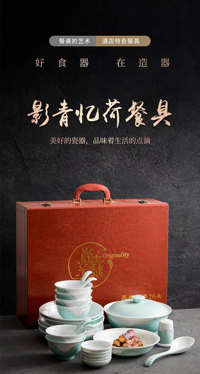 尾桥下窑影青瓷26头忆荷鎏金浮雕餐具套装商务礼赠母亲节礼品