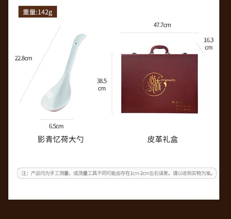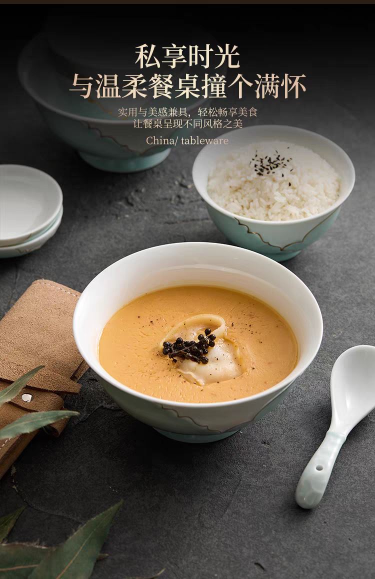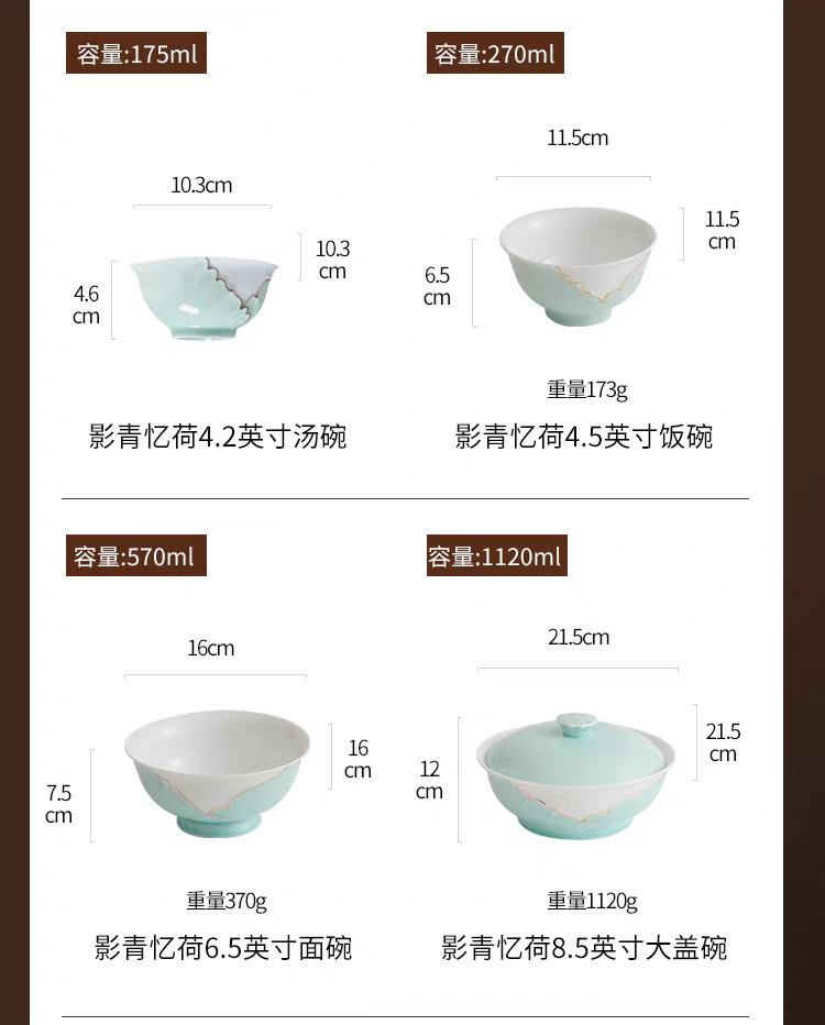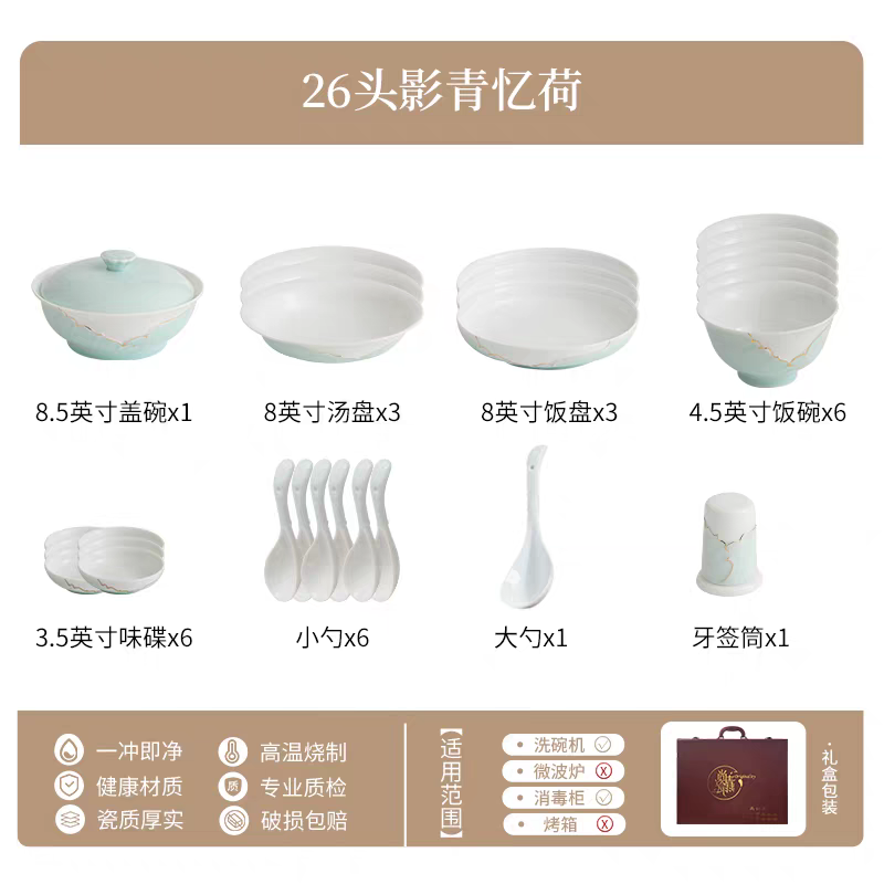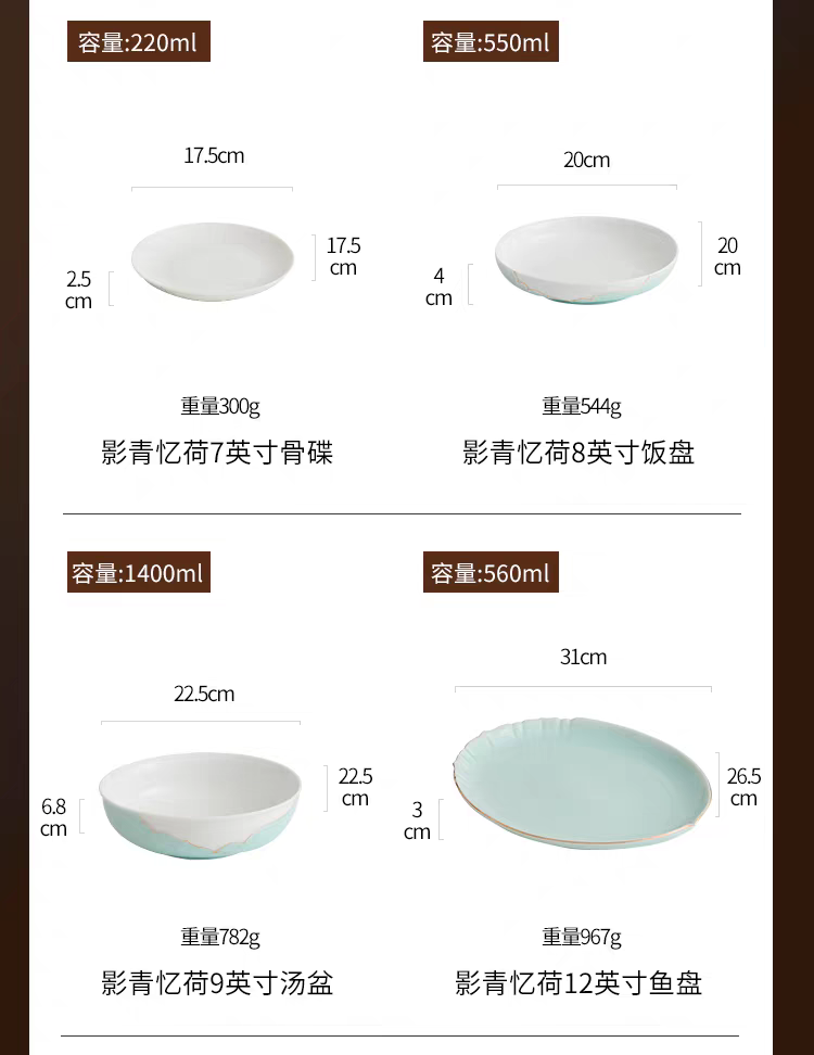 配置:4.5寸饭碗*6,8.5寸大盖碗*1,牙签筒*1,小勺*6,8寸饭盘*3,3.5寸味碟*6,8寸汤盘*3。 尺寸:4.5寸饭碗10.3*4.6cm, 8.5寸大盖碗21.5*12cm, 牙签筒上直径4.2cm下直径5.5cm高8cm, 小勺13.5cm宽4cm, 8寸饭盘20*4cm, 3.5寸味碟8.8*2.5cm, 8寸汤盘20.5*4cm。