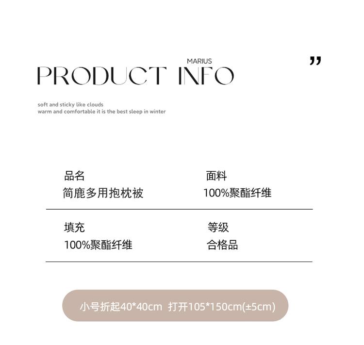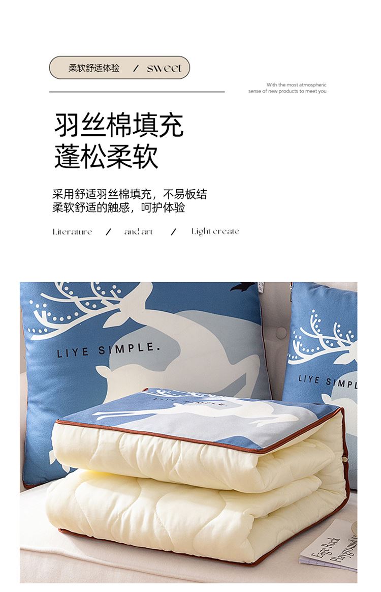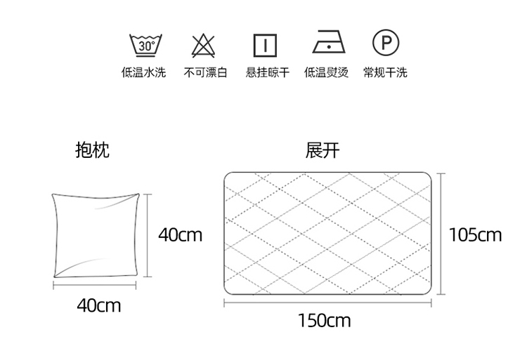抱枕尺寸:40*40cm*1 被子尺寸:100*150cm 面料:水晶绒 数量:一只 产品包装:精美手提袋 包装尺寸:50*50cm 1.水晶绒面料具有吸水易干、不留水渍、不霉烂、不粘污以 又卫生的特点。 2.多功能便携抱枕被,享受你的温暖时光。一枕多用,方便实用。