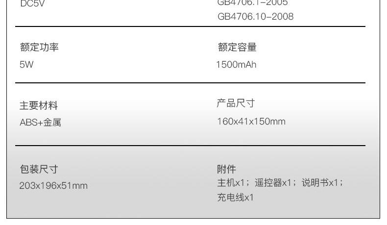 产品参数: 产品型号:CP-N6 额定电压:3.7V⎓ 额定功率:5W 电池容量:1500mAh 产品尺寸 : 160X150X41mm 包装尺寸:198*188*49mm 商品条码 : 6972831860303 产品毛重 : 350g 包装清单:主机x1、充电线x1、遥控器x1、电池x1、说明书x1