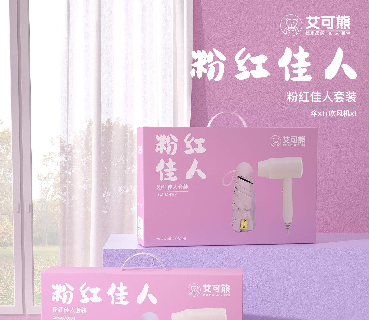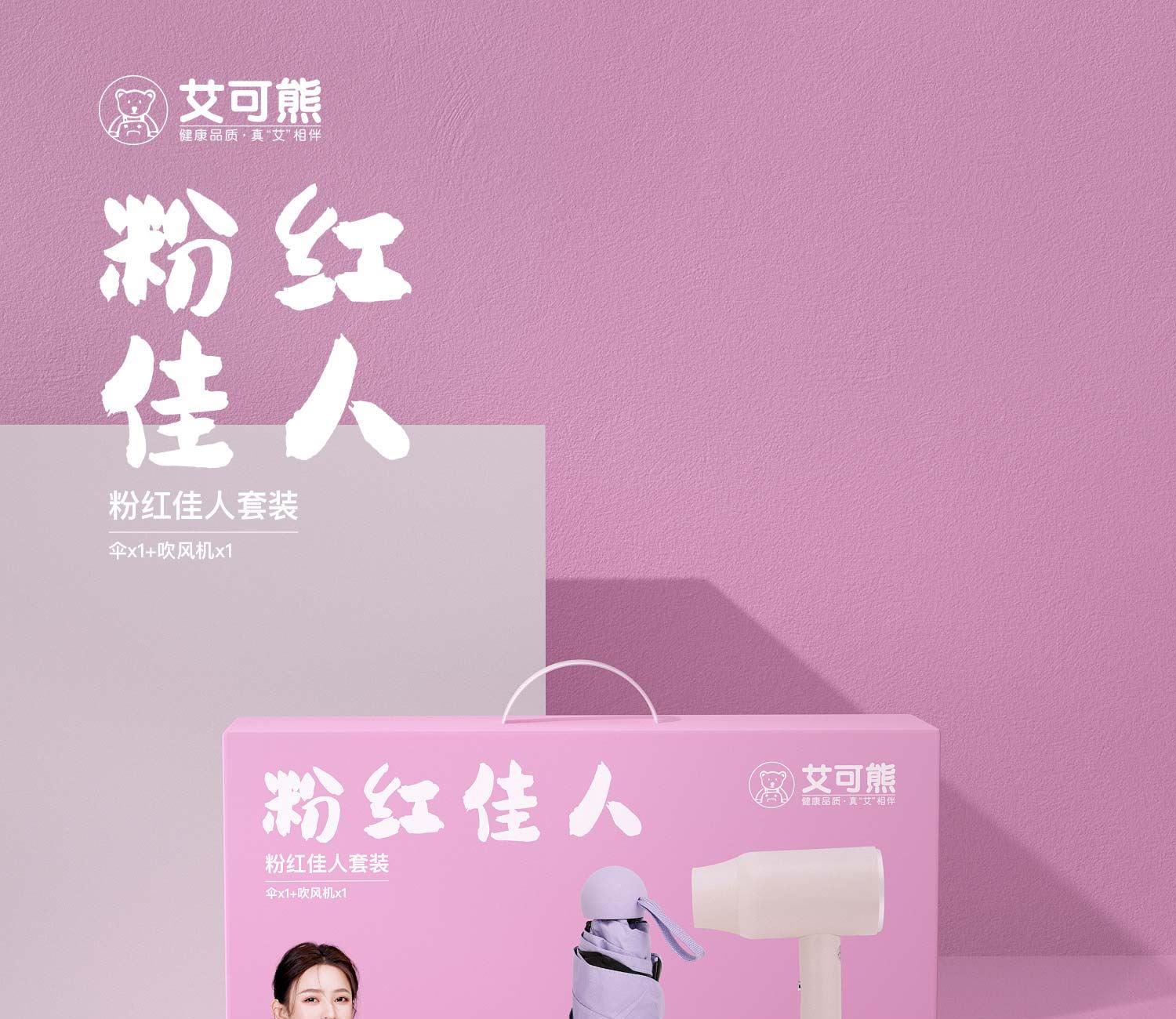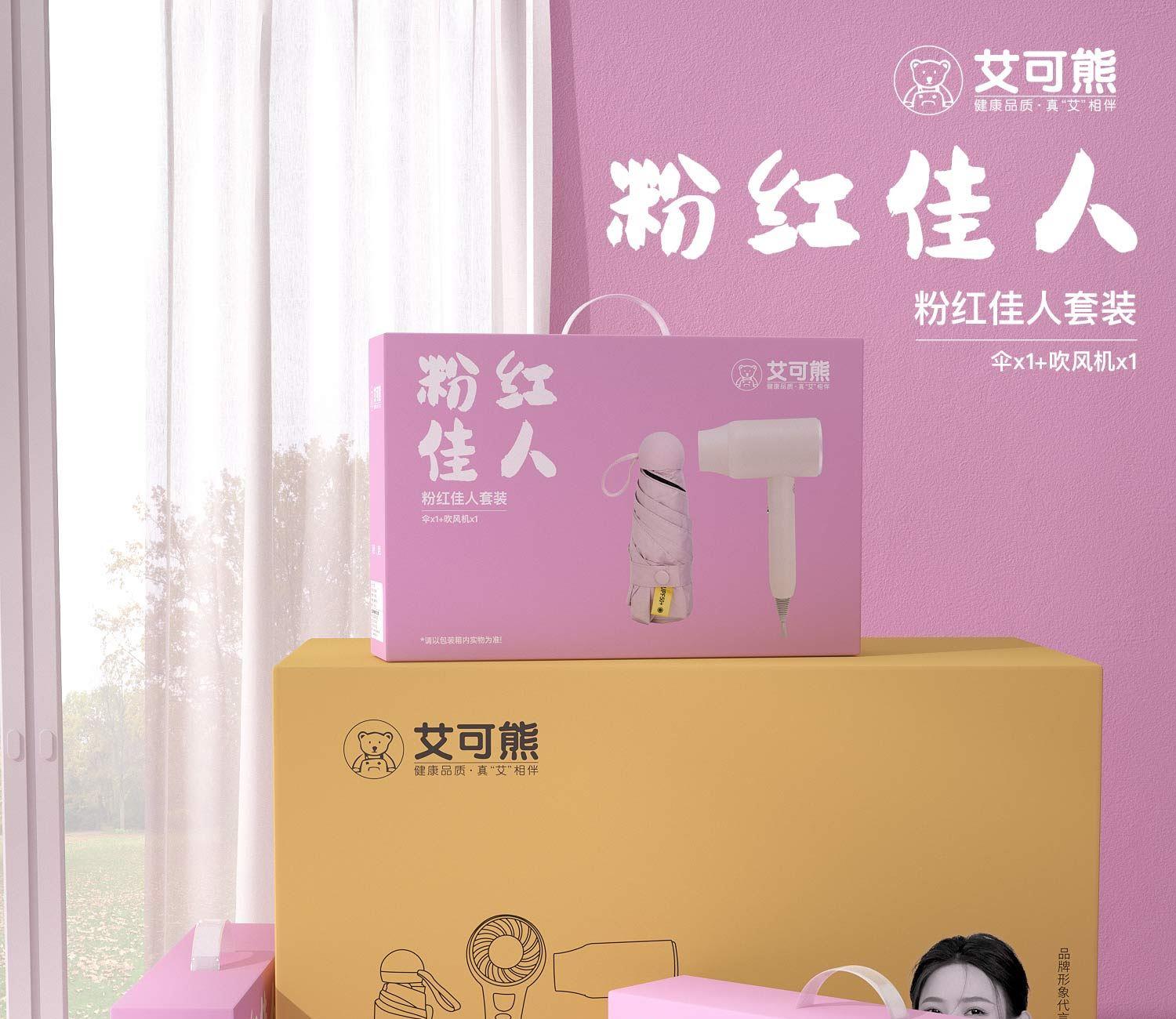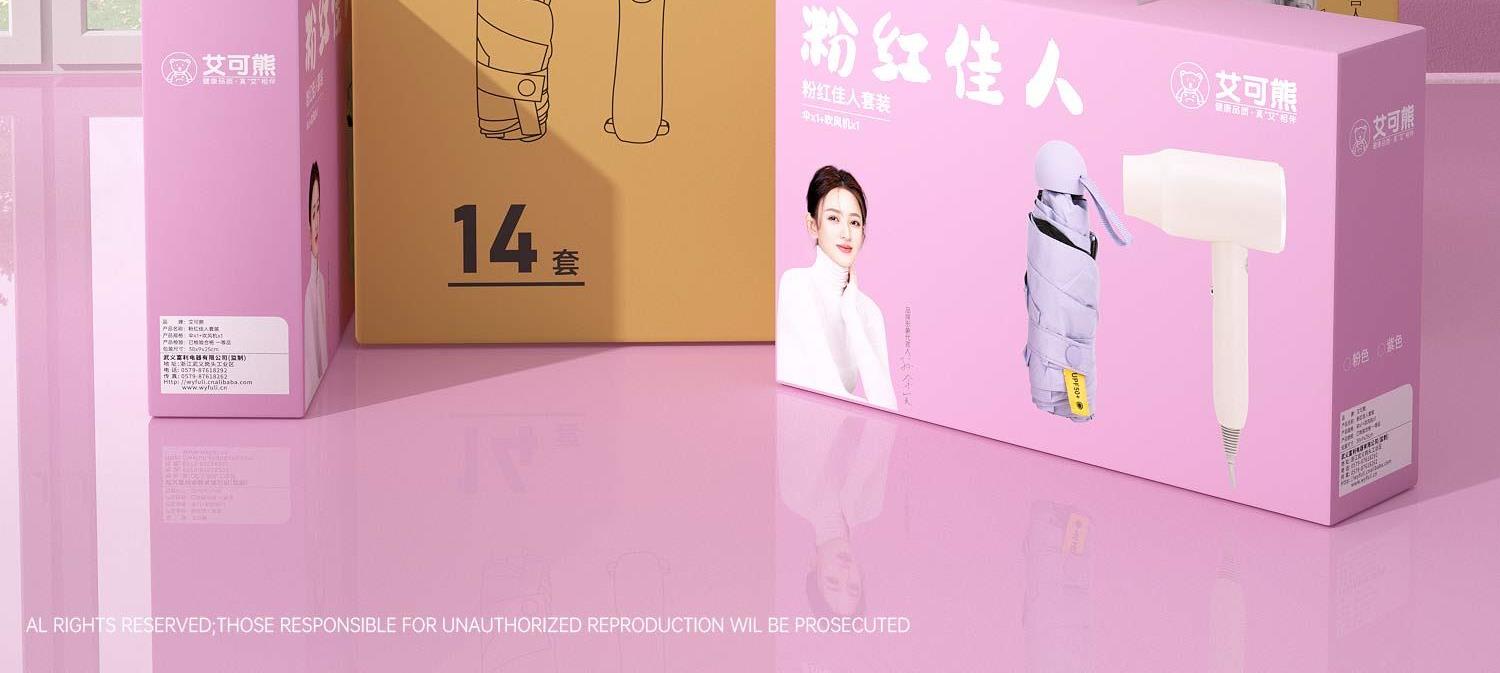 品 牌:艾可熊 产品:粉红佳人套装 产品:伞x1+吹风机x1 产品检验:已检验合格 一等品 包装尺寸:38x9x25cm 外箱尺寸:68x39x52cm
