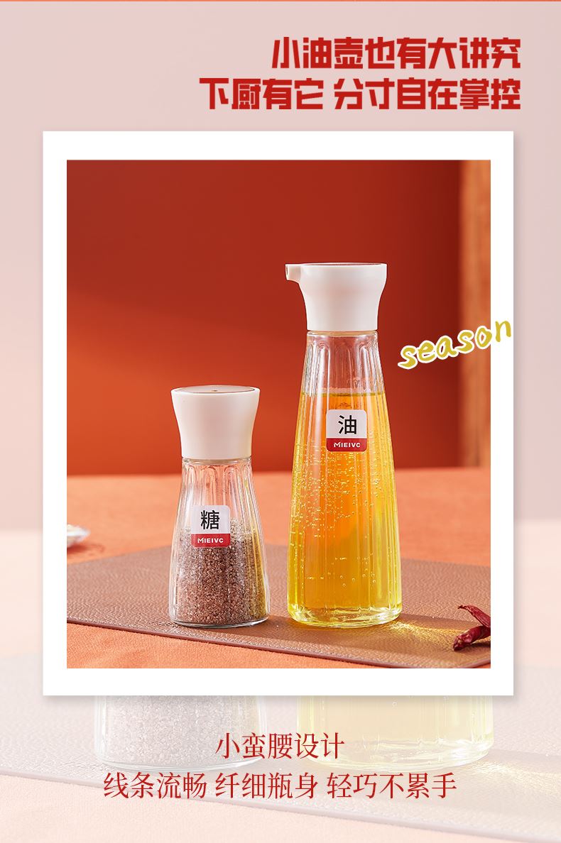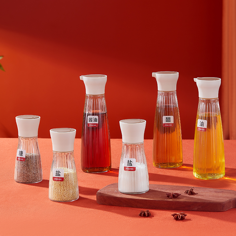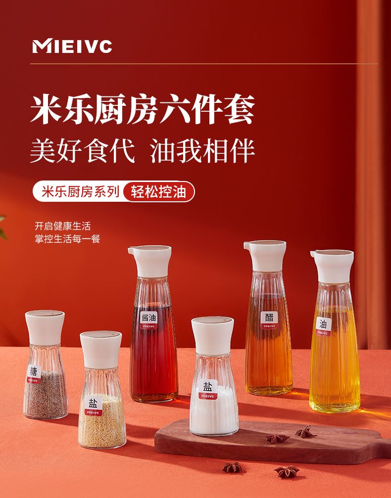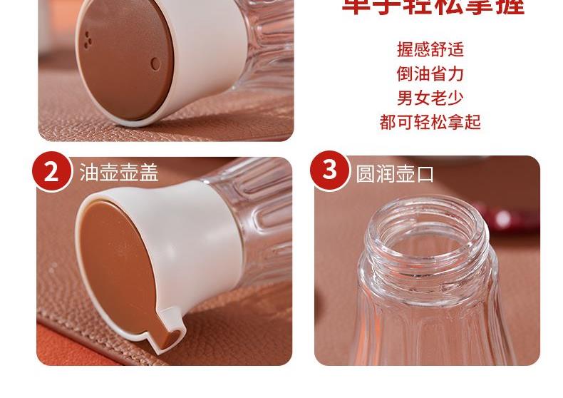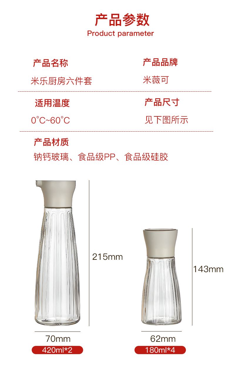 产品规格:油壶420ml*3、调味罐180ml*3 产品材质:钠钙玻璃0~60℃、食品级PP、食品级硅胶 彩盒尺寸:400*96*230mm 外箱尺寸:50.2*41.4*47.8CM 外箱毛重:16.8kg 产品特点: 油壶盖子双孔设计,大小口径可控制食量,壶盖多用,可互换,更懂你的需要,随心所欲,食品级pp、食品级硅胶,开启健康生活。 健康玻璃材质,设计感强,大小适中,握感舒适,倒油省力,男女老少都可轻松拿起。通明瓶身,余量可视,轻松辨别,及时补充,美好食代,油我相伴。 彩盒包装简约时尚设计,提手升级,厨房套装高颜值,高品质产品,开启健康生活,掌控生活每一餐。