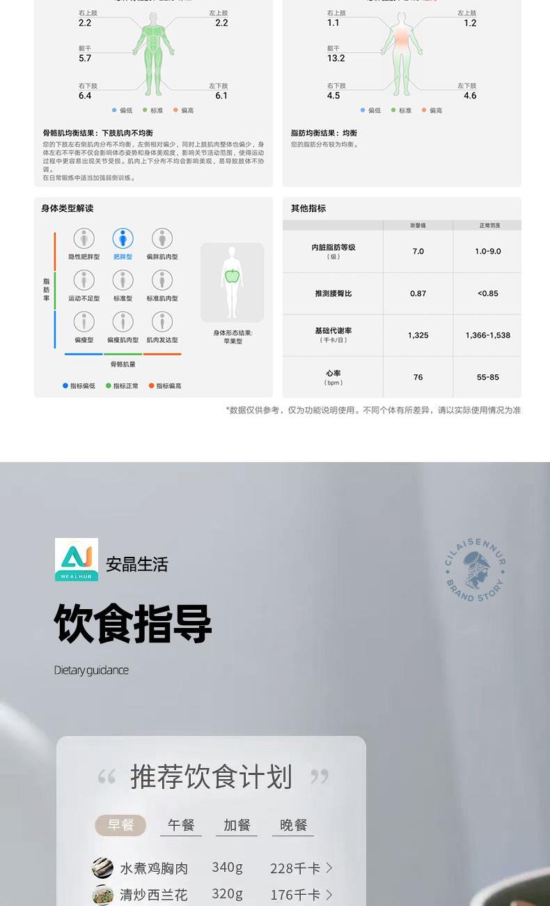 产品参数: 产品型号:CP-BS1 额定电压:3V⎓ 电 池:2颗7号电池 承重:180kg 商品条码 : 6972831860181 产品尺寸 : 260X260X23mm 包装尺寸:275X275X28mm 产品毛重 : 1.1kg 包装清单:主机X1,说明书 核心卖点: 1、蓝牙链接专属APP(安晶生活),智能识别体型 2、高精度传感器感知你身体的细微变化 3、专业人体成分分析报告解析一目了然 4、饮食指导,科学运动建议,多角度数据分析,全面了解自己 5、感知你的每一克变动,时刻心里有数 6、支持绑定多位用户,可以手动录入用户信息 7、一体化闭合机身,坚固安全