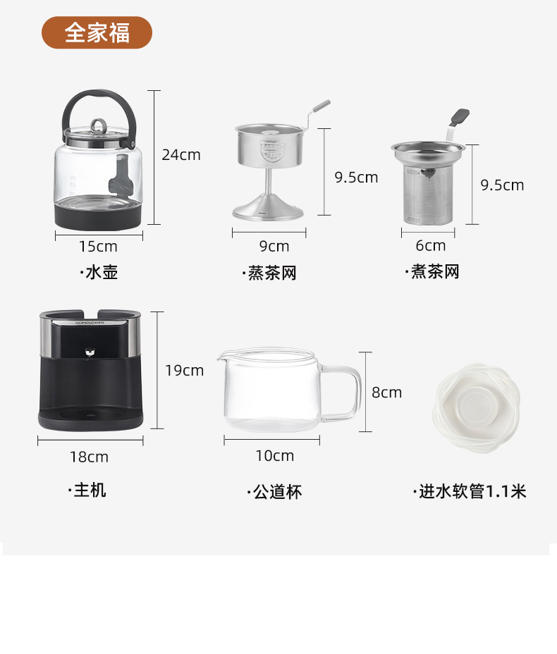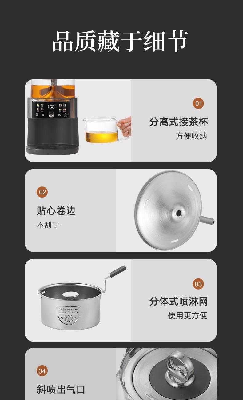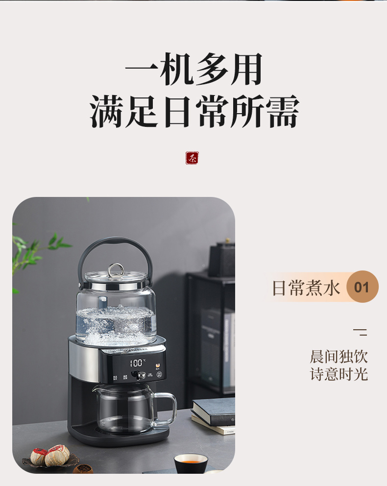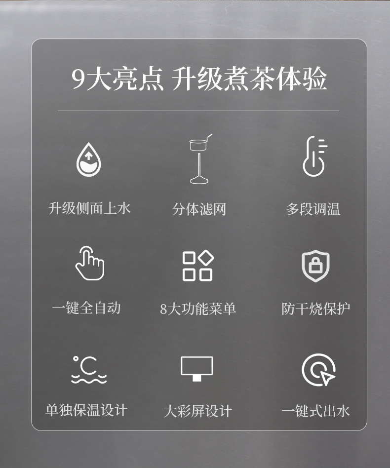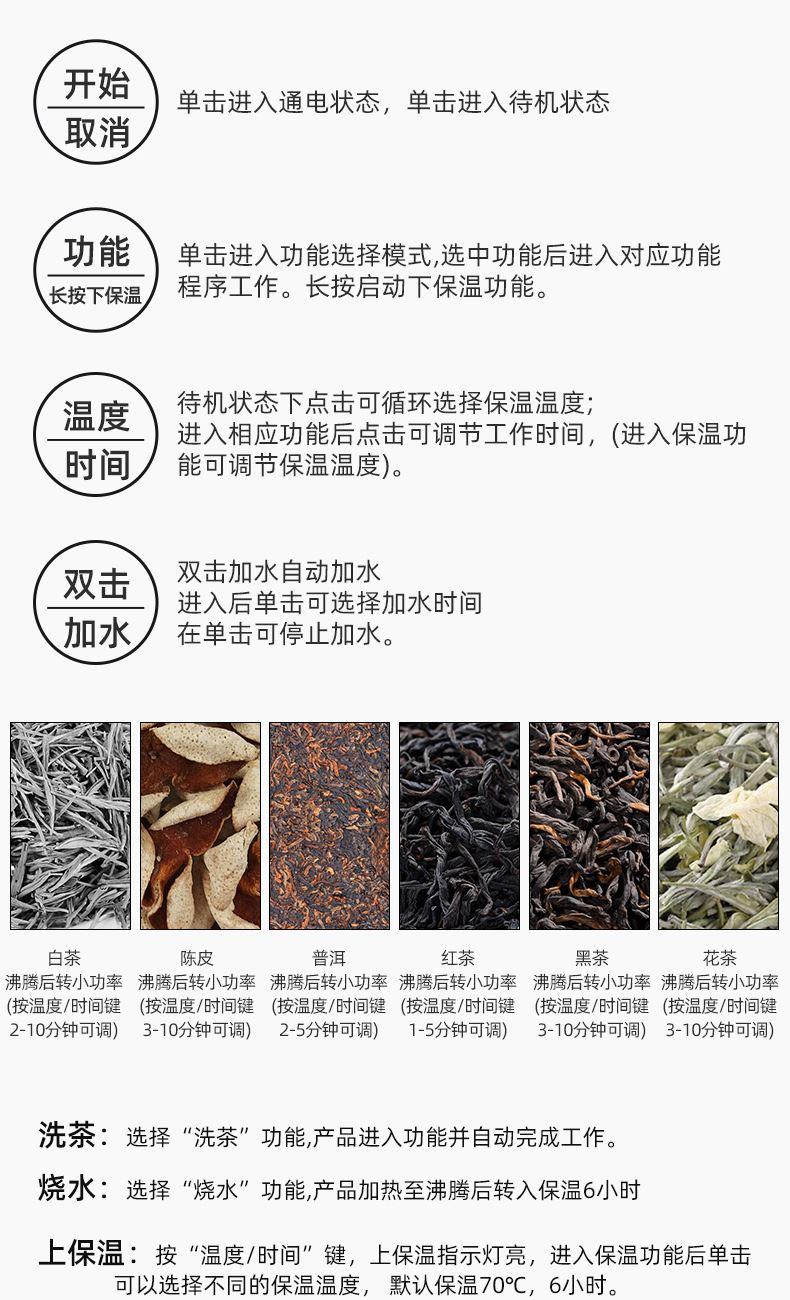 全新智能自动上水煮茶机-OMT-JS1957 产品参数 额定电源:220~50Hz 颜色:雅钛灰 额定功率:1000W 额定容量:1L 4台装 功能卖点: 按键功能:洗茶、白茶、红茶、黑茶、陈皮、普洱、花茶、烧水。双击加水,温度时间,保温 多重安全设计无水自动保护,过热自动保护 双网配置,多功能设计煮茶、烧水、花茶。 按压式开关使用更方便,更易操作 大彩屏设计,更美观,操作更方便,更时尚 耐热玻璃杯体骤冷骤热不爆裂,使用放心 侧面上水设计,使用更方便,水路畅通不堵塞 经典大提梁设计使用更方便,外观更精致