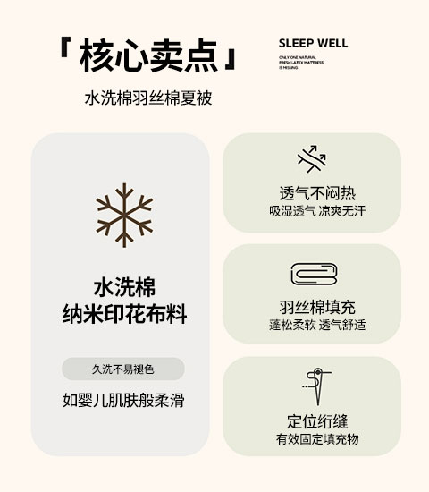 1:夏日专属夏凉被 纳米水洗棉印花夏被 2:水洗棉纳米印花布料,轻柔细腻,吸湿透气, 久洗后不易褪色。 尺寸:180*200cm 包装:彩盒