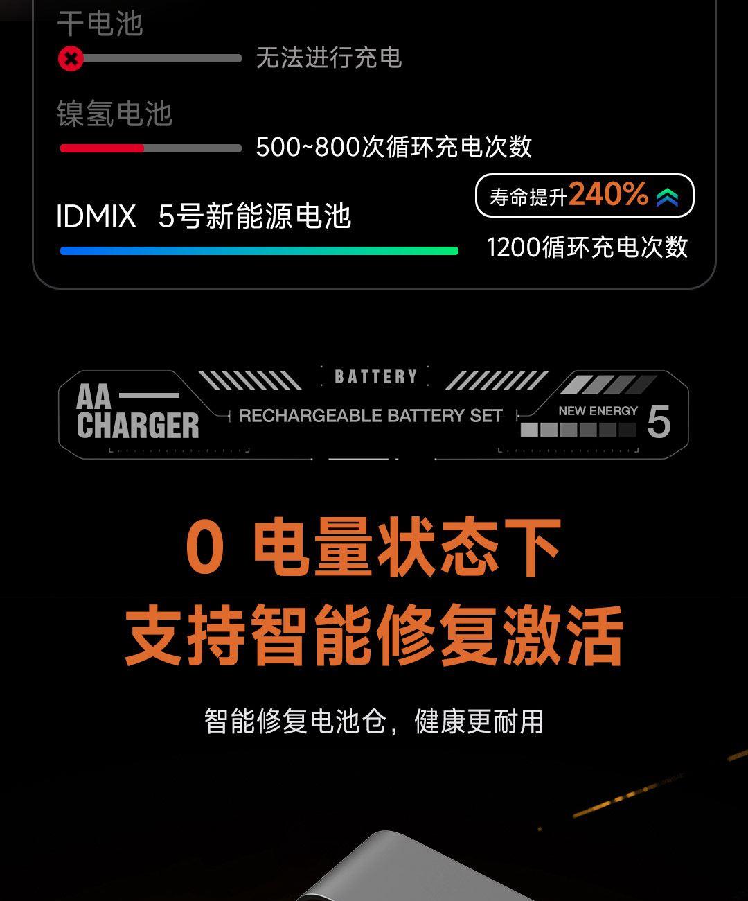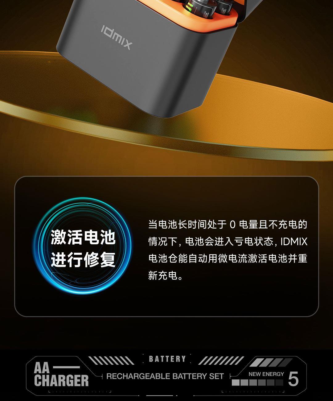 智能修复电池仓,健康更耐用,当电池长时间处于0电量且不充电的情况下,电池会进入亏电状态,IDMIX电池仓能自动用微电流激活电池并重新充电