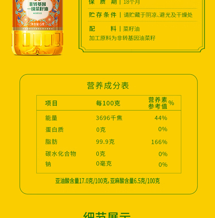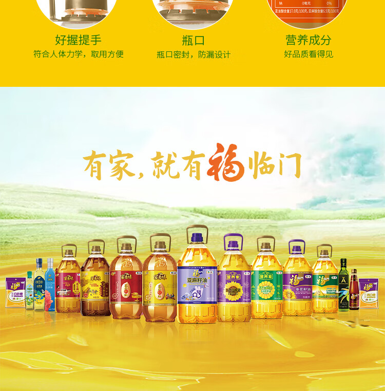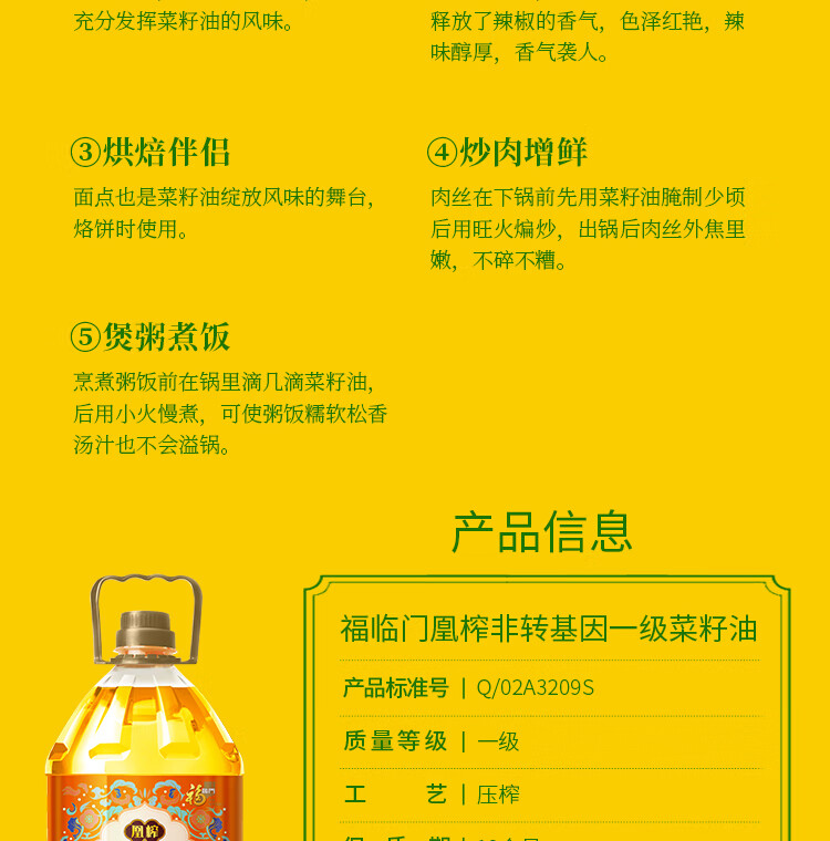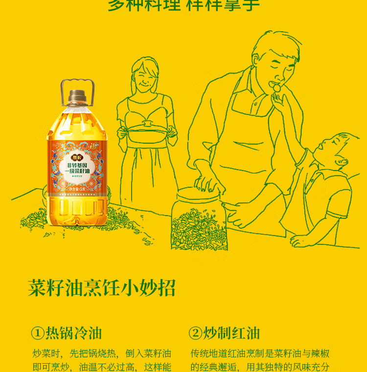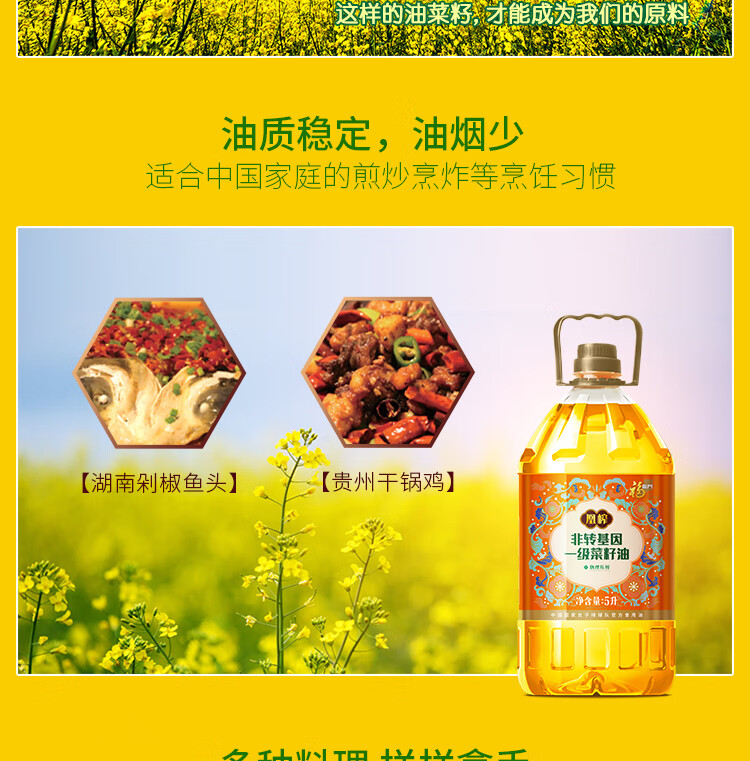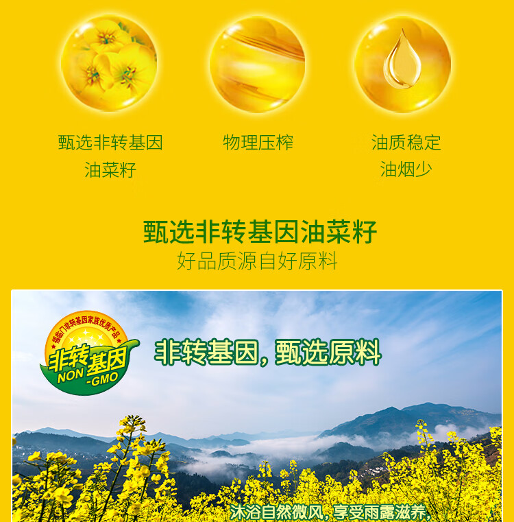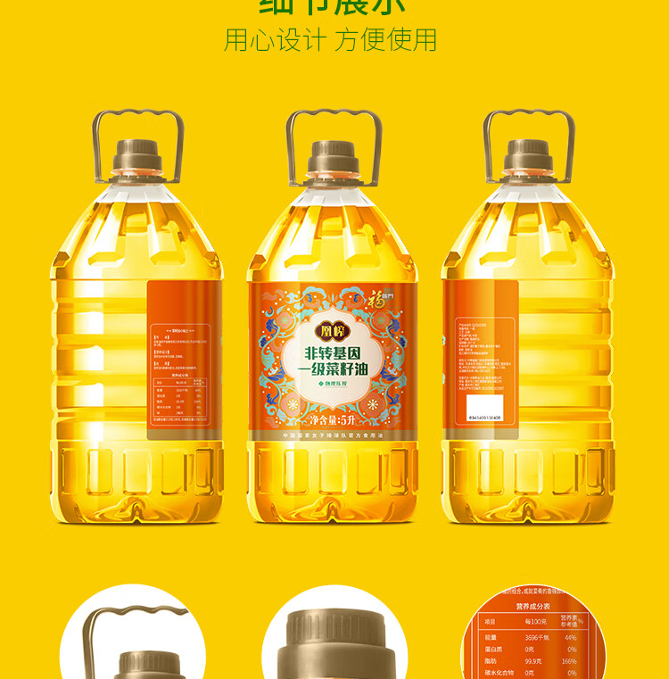 净含量:5L 推荐理由: 推荐理由: 中粮福临门出品,非转基因原料更安心 物理压榨,菜香纯正,爆炒煎炸都合适 5L 家庭大桶装,经济实惠,家用宜选