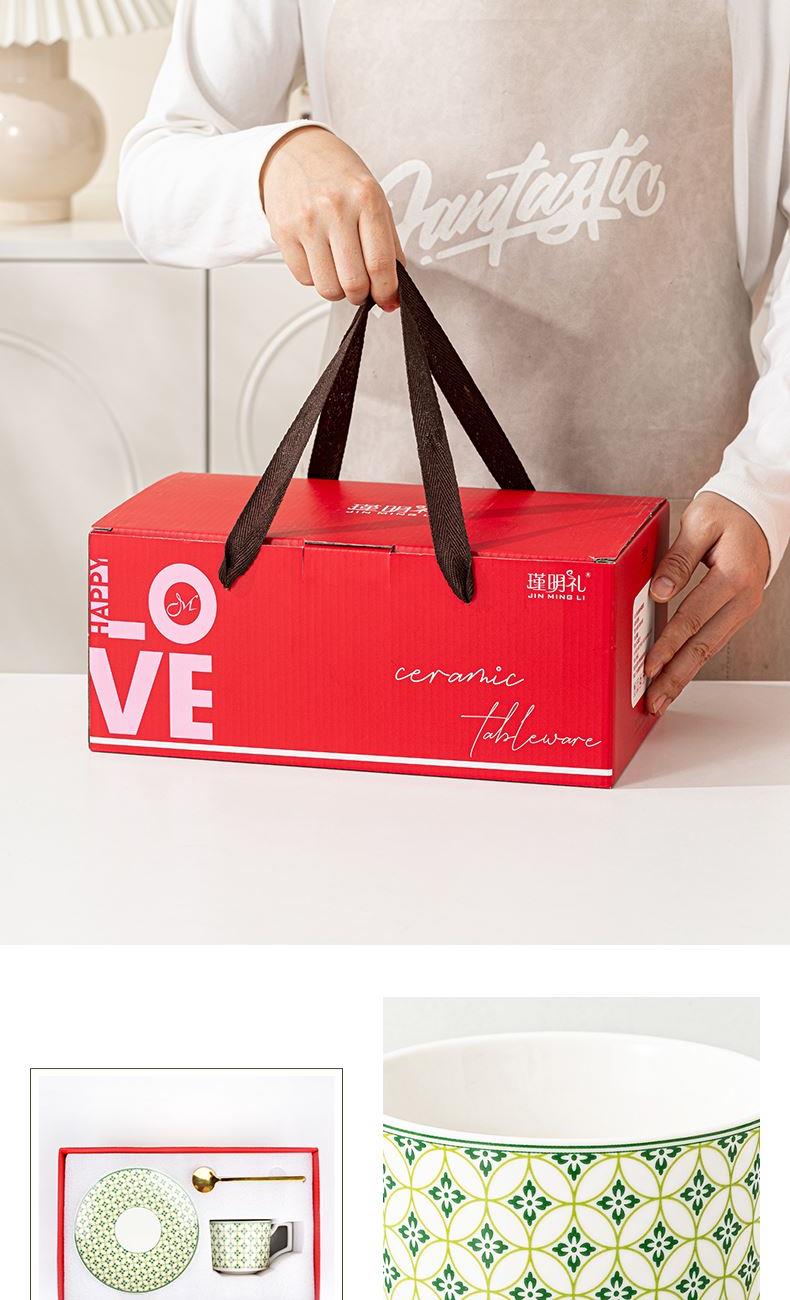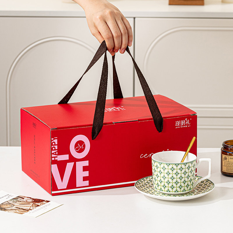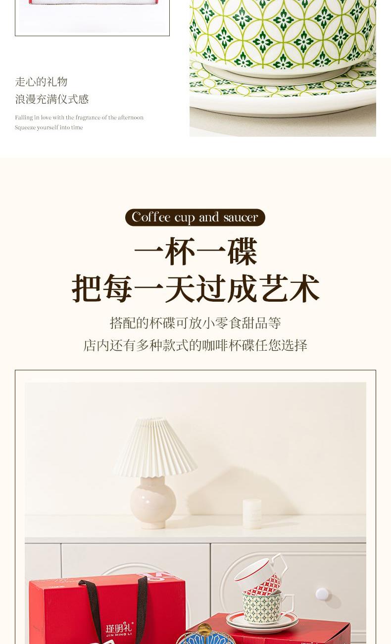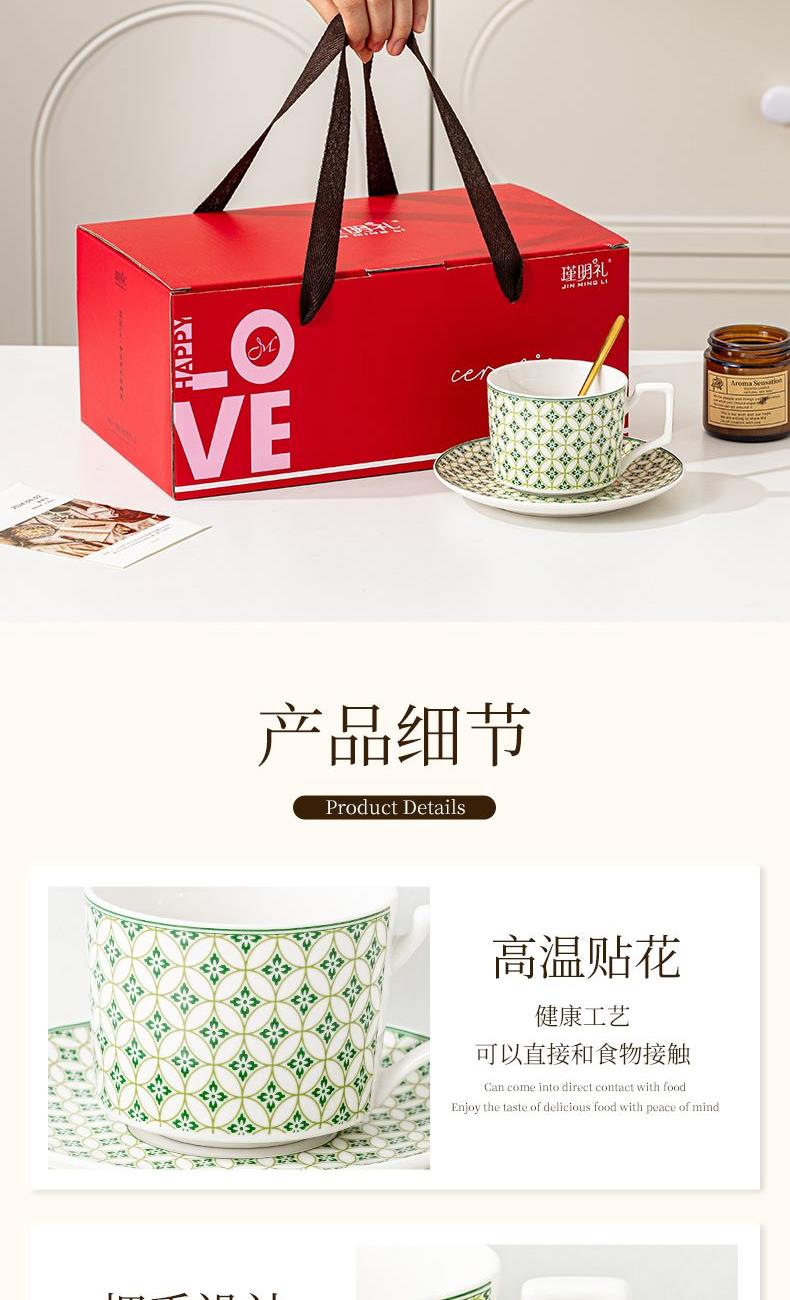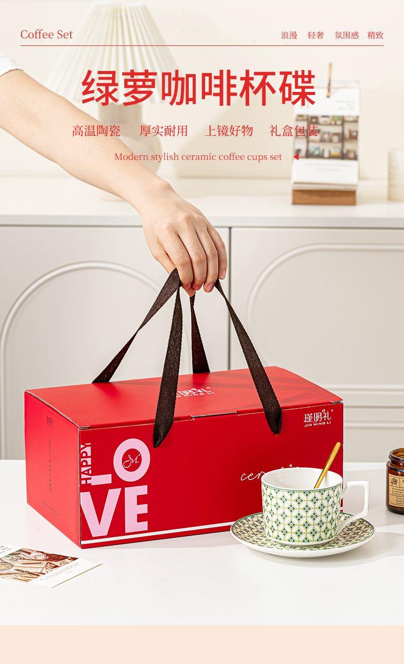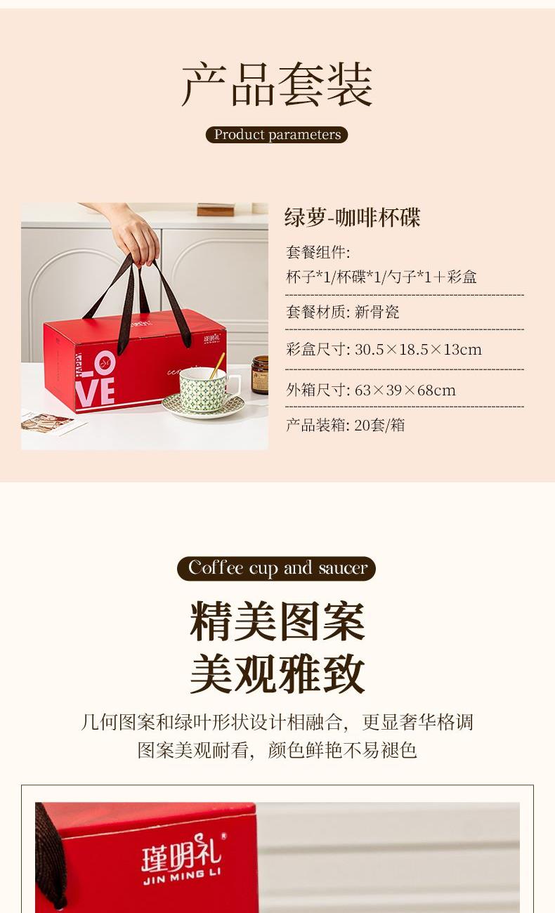瑾明礼-绿萝-咖啡杯碟-1杯1碟1勺 - 产品组成:整套=1杯1碟1勺+彩盒 产品材质:新骨瓷 产品规格:咖啡杯=口径8.5cm,高度6.8cm,容量330ml;碟=直径15cm,高2cm;金勺=长度13cm; 彩盒尺寸:30.5*18.5*13cm 产品毛重:0.8kg 整箱毛重:13.8kg 外箱尺寸:63*39*68cm - 产品特点:【温情献礼,感恩每一刻】在这个快节奏的世界里,让我们慢下来,用一份细腻的心意,传递深深的感激。推出限量版感恩彩盒陶瓷杯套装,提醒我们珍惜每一缕阳光的恩赐;宁静的蔚蓝似深海广袤, 寓意着对生命宽广与深邃的敬畏。