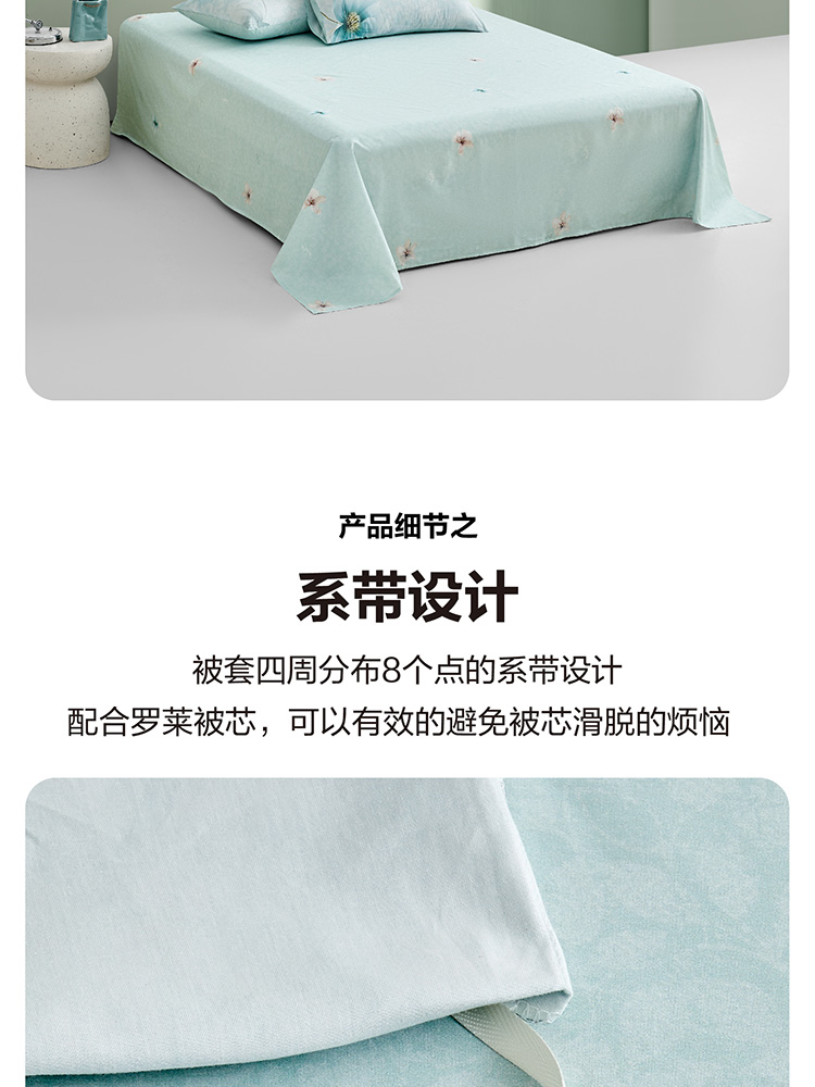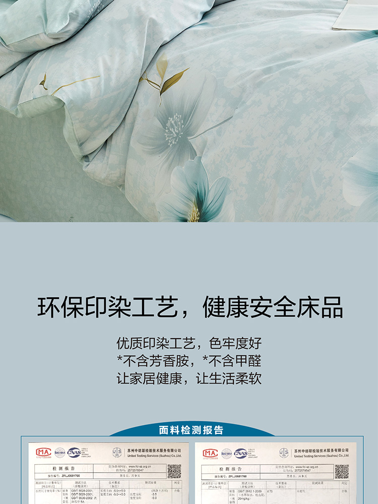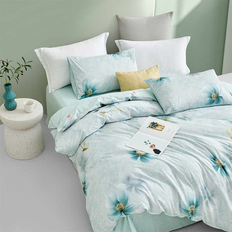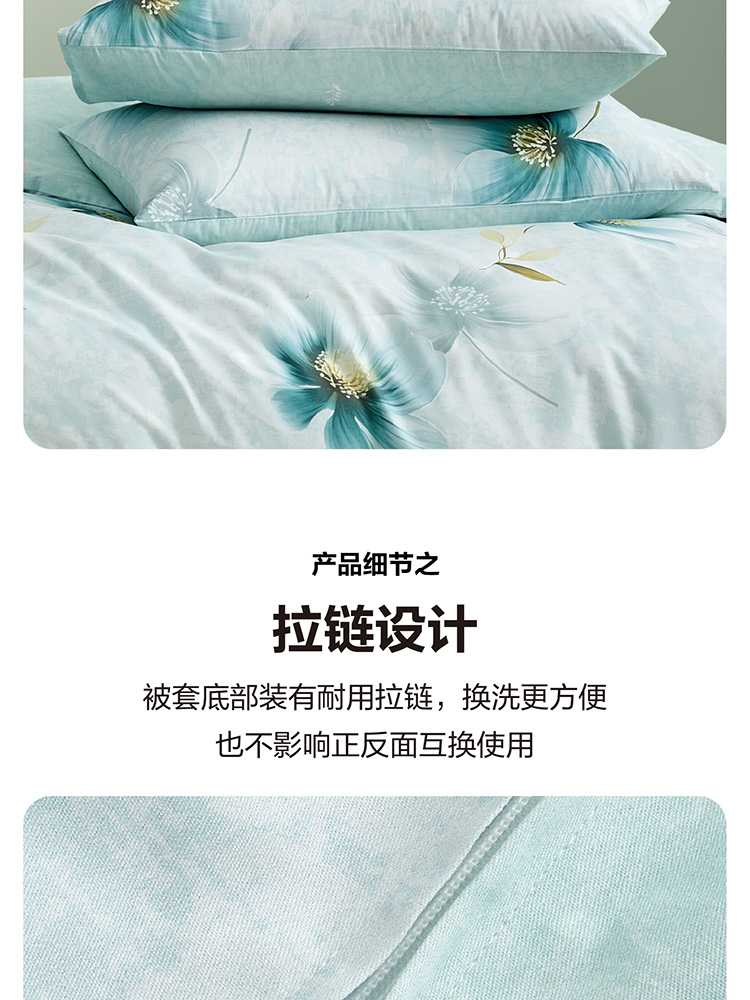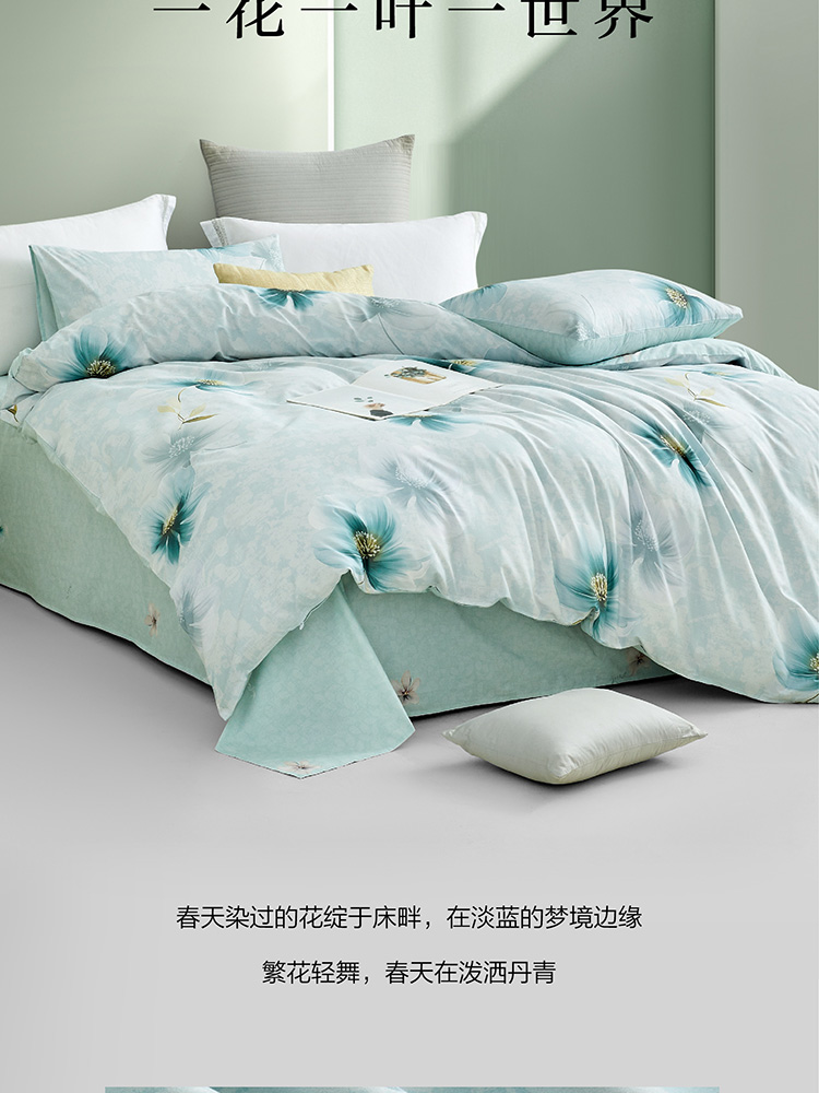规格尺寸:枕套:48*74cmX2 被套:200*230cmX1 床单:230*240cmX1 外箱尺寸:54*42*38 cm 采用清新淡雅的花卉图案,色彩柔和,带来自然舒适的睡眠体验,追求简约风格 全棉面料亲肤舒适,柔软、吸湿透气。
