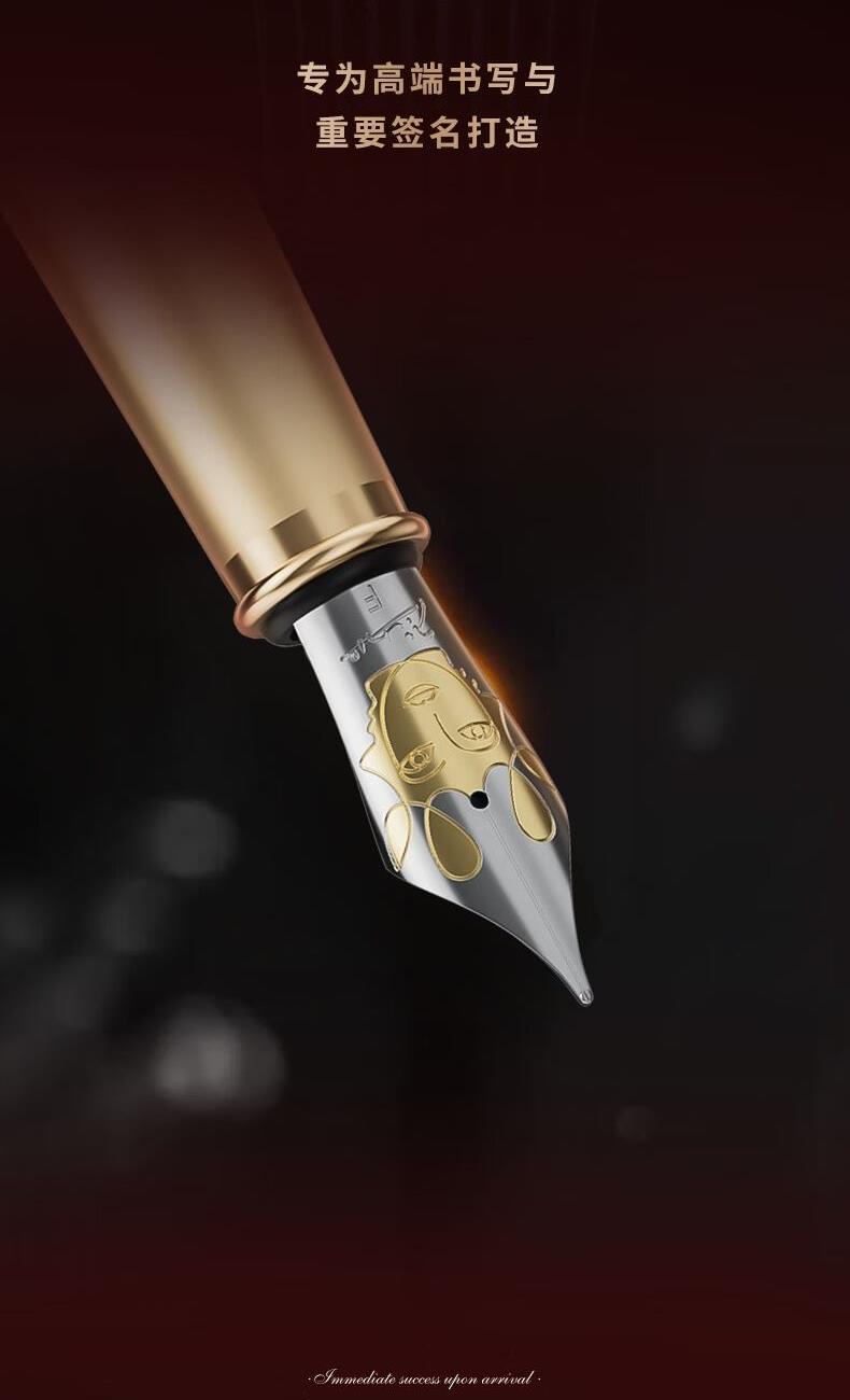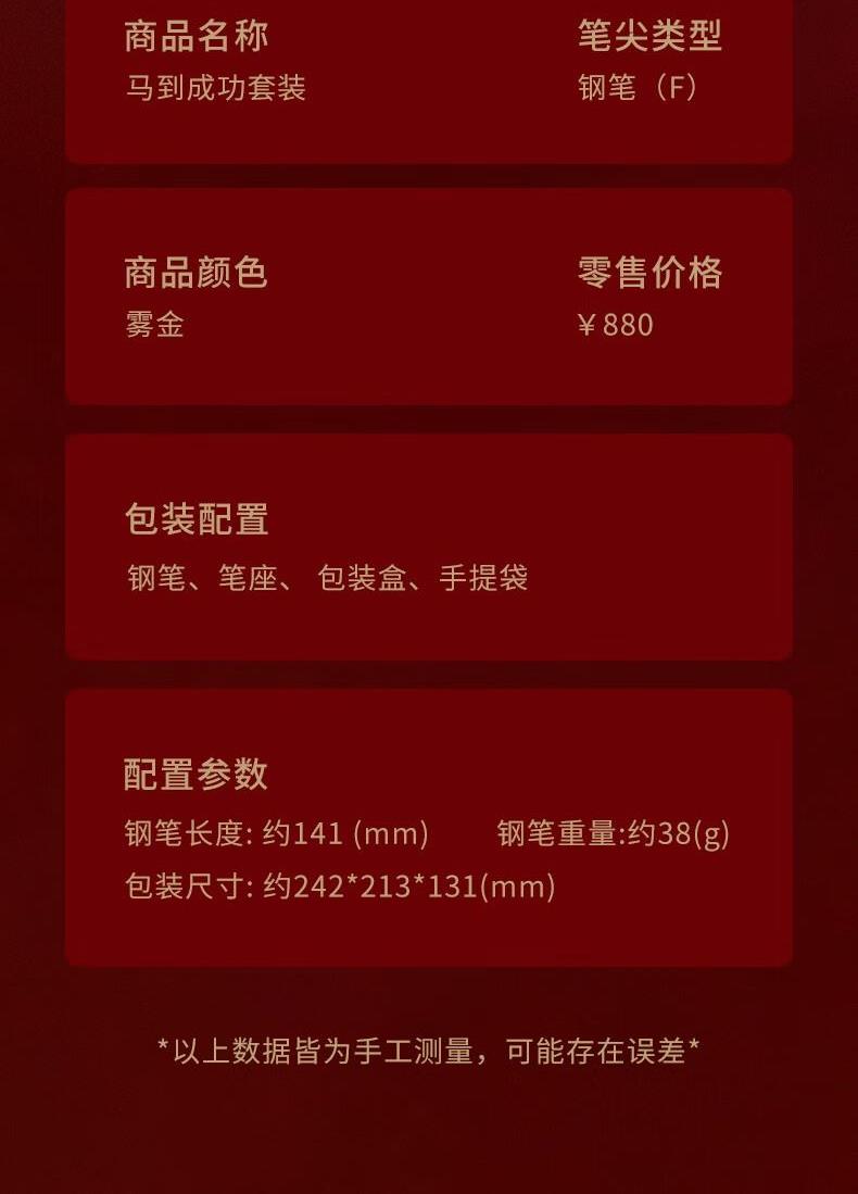 【钢笔长度】 约141mm【钢笔重量】 约38g【笔尖类型】 钢笔(32#F尖)【钢笔颜色】 雾金【包装配置】 钢笔、笔座、包装盒、外彩盒、 定制手提袋、合格证说明书+收纳信封