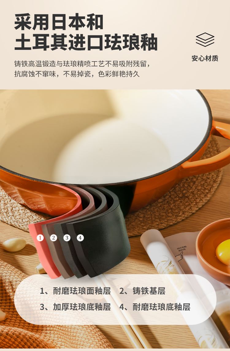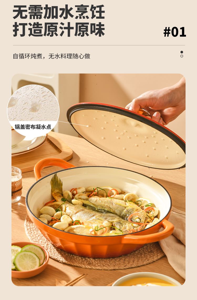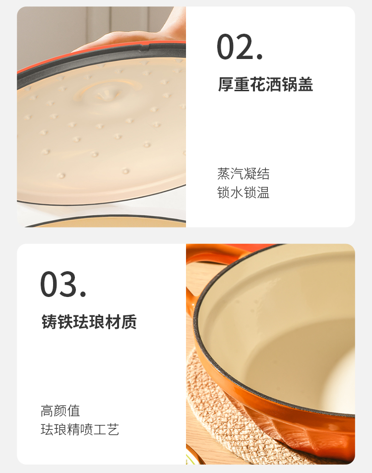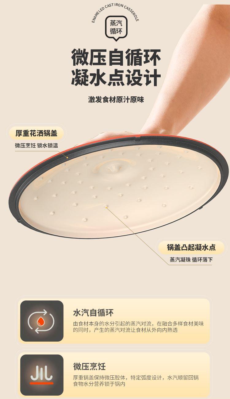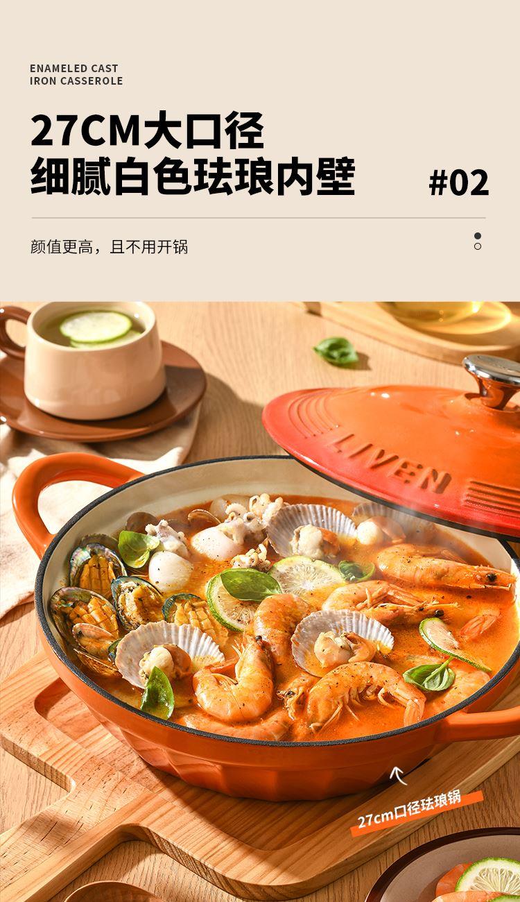 加厚铸铁材质,自循环炖煮 微压烹饪,均匀受热持久保温 27CM大口径细腻白色珐琅内壁 2.3L大容量一锅多能 煎炒煮炖焖 厚重珐琅锅体蓄热力强,持久保温慢烹饪 采用日本和土耳其进口珐琅釉