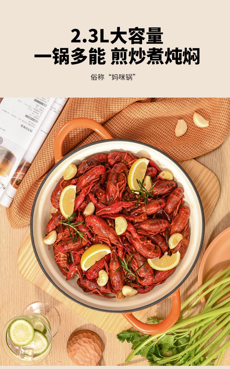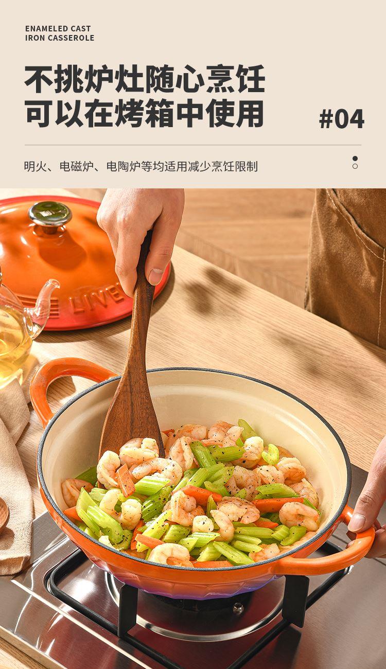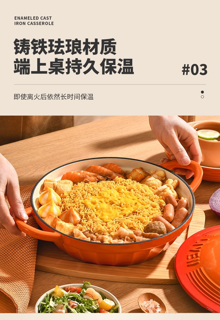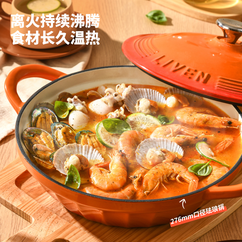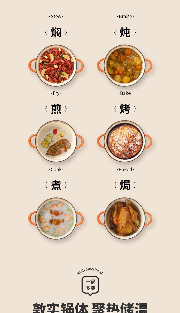 加厚铸铁材质,自循环炖煮 微压烹饪,均匀受热持久保温 27CM大口径细腻白色珐琅内壁 2.3L大容量一锅多能 煎炒煮炖焖 厚重珐琅锅体蓄热力强,持久保温慢烹饪 采用日本和土耳其进口珐琅釉