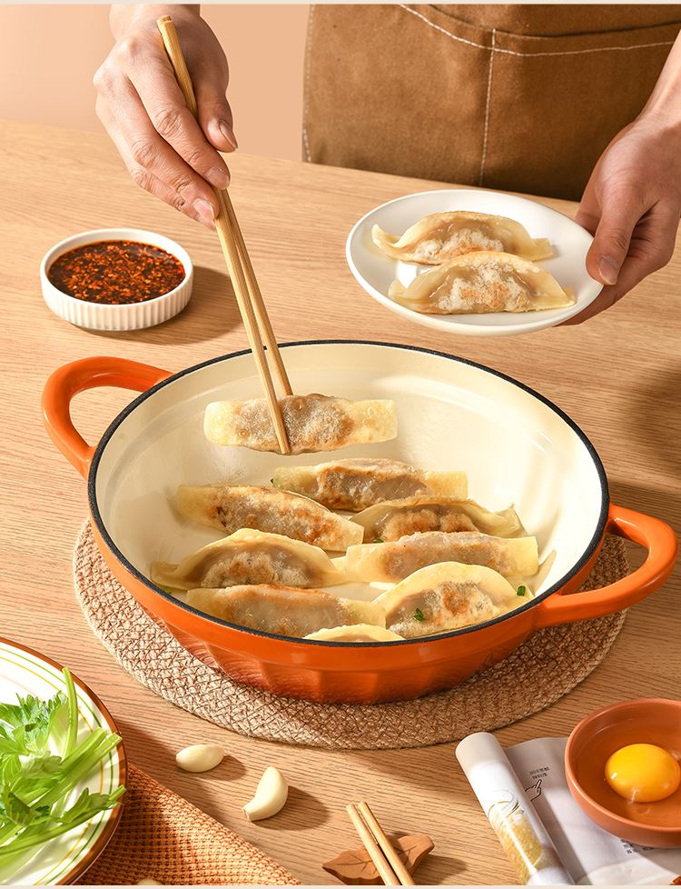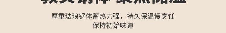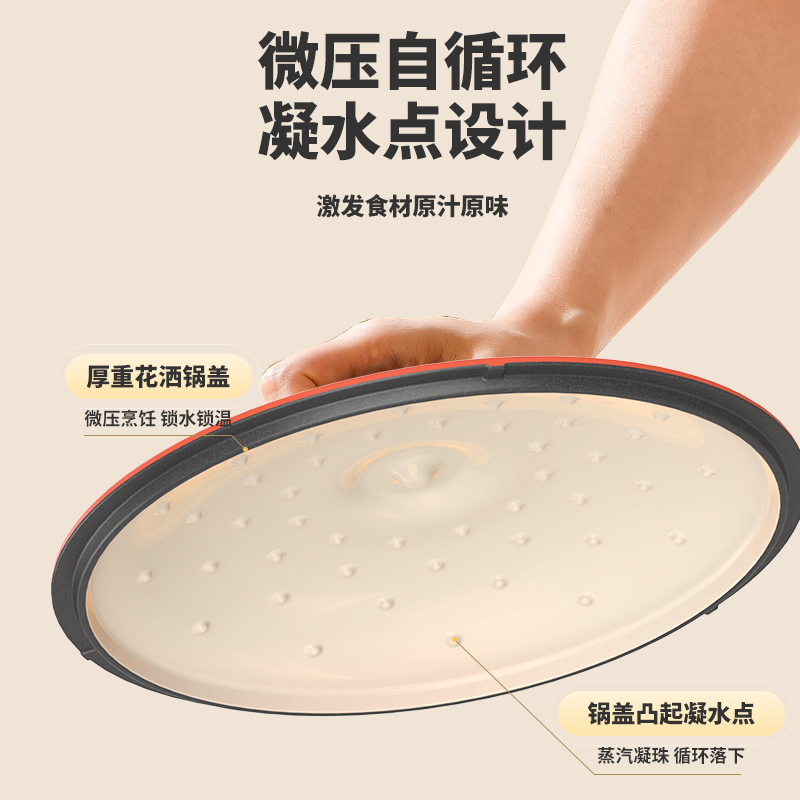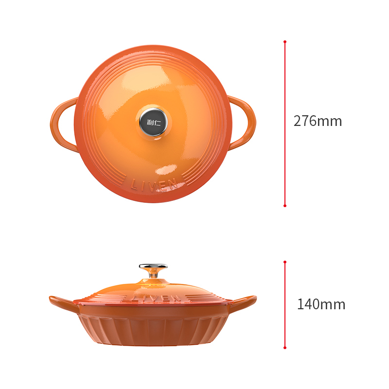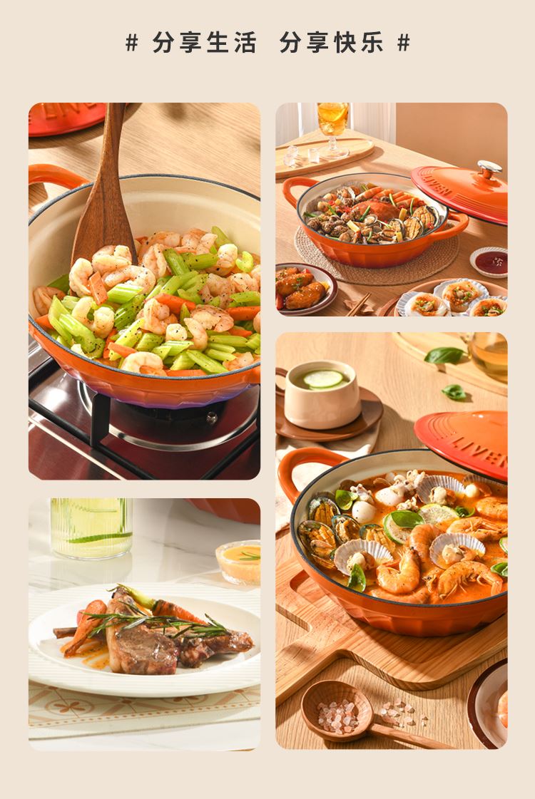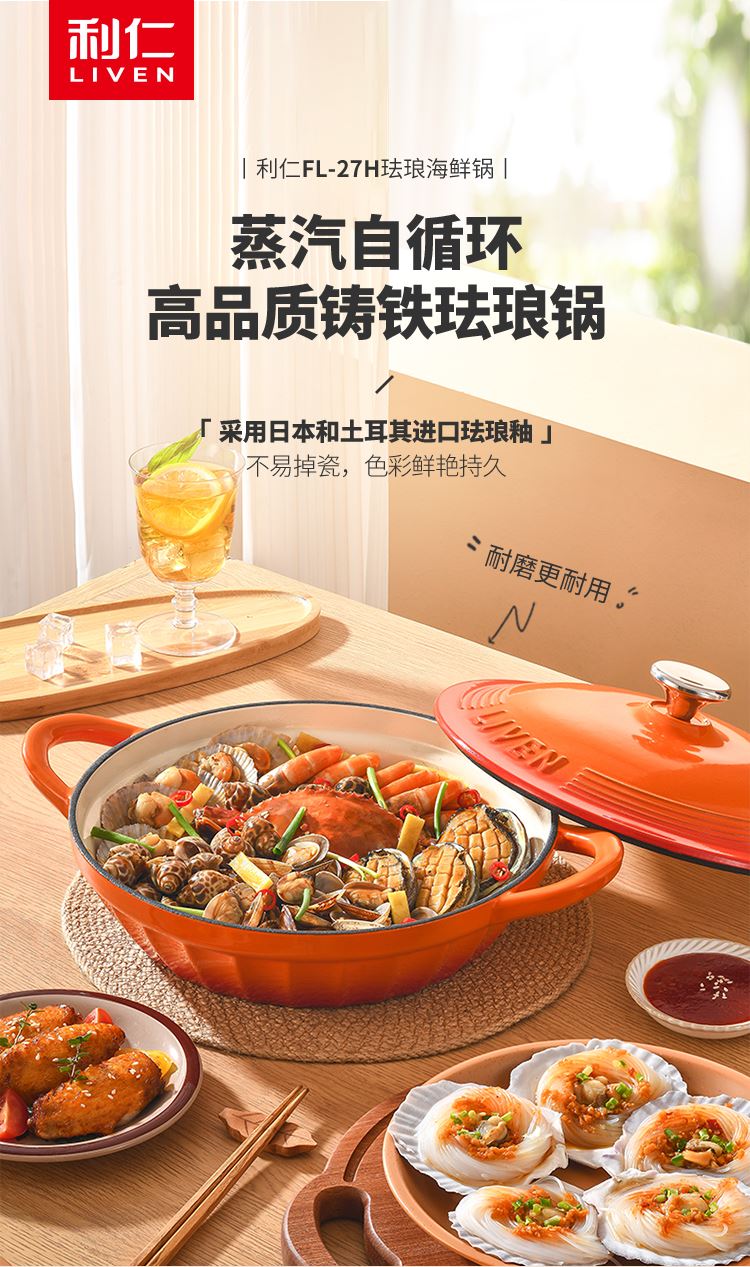 加厚铸铁材质,自循环炖煮 微压烹饪,均匀受热持久保温 27CM大口径细腻白色珐琅内壁 2.3L大容量一锅多能 煎炒煮炖焖 厚重珐琅锅体蓄热力强,持久保温慢烹饪 采用日本和土耳其进口珐琅釉