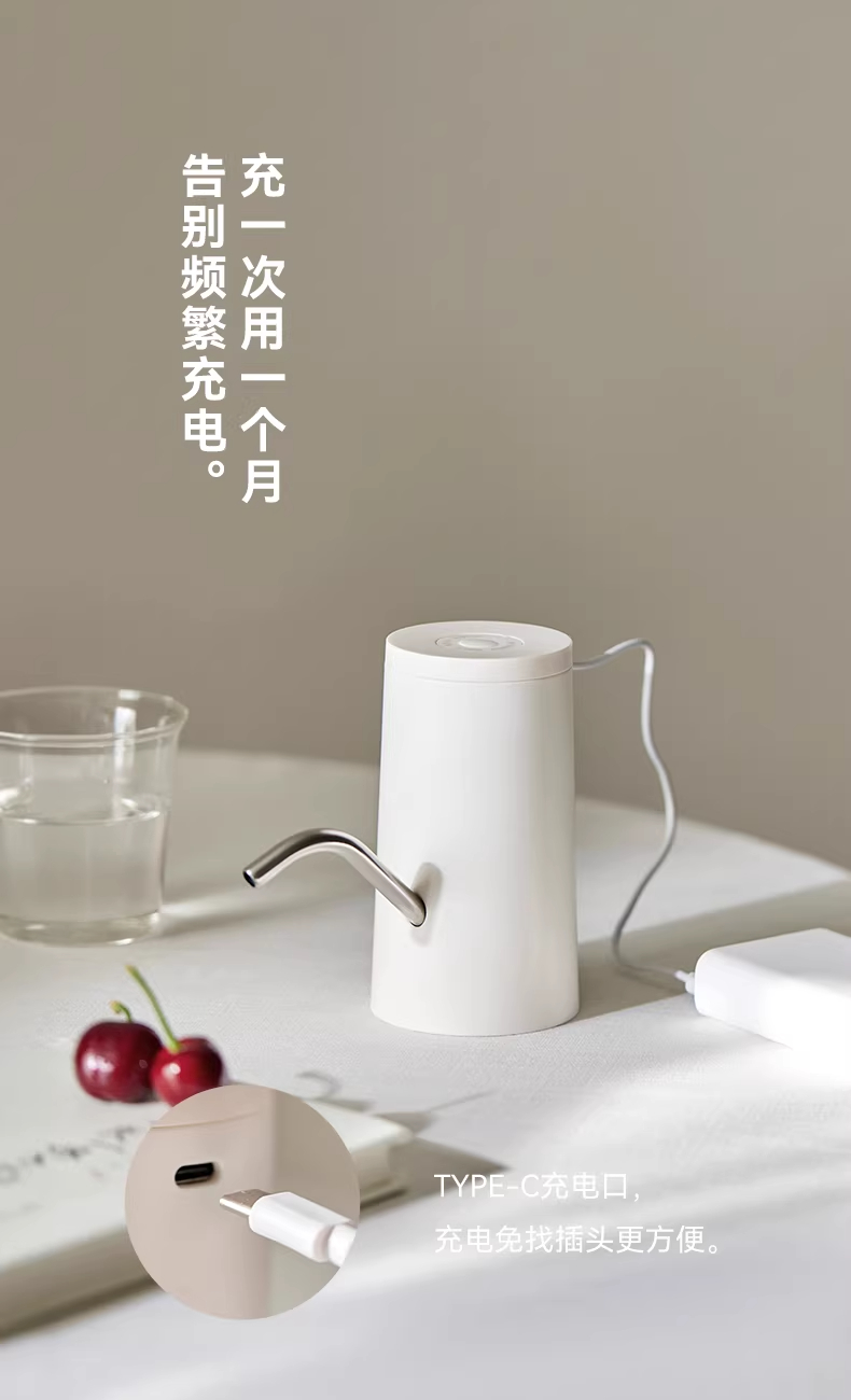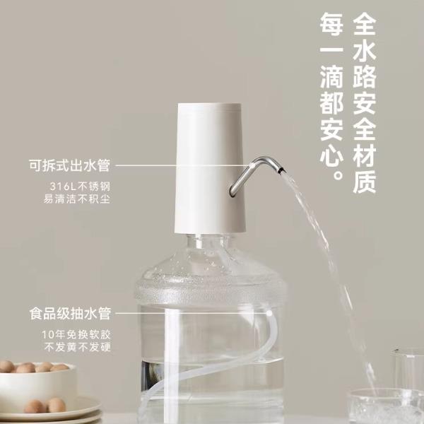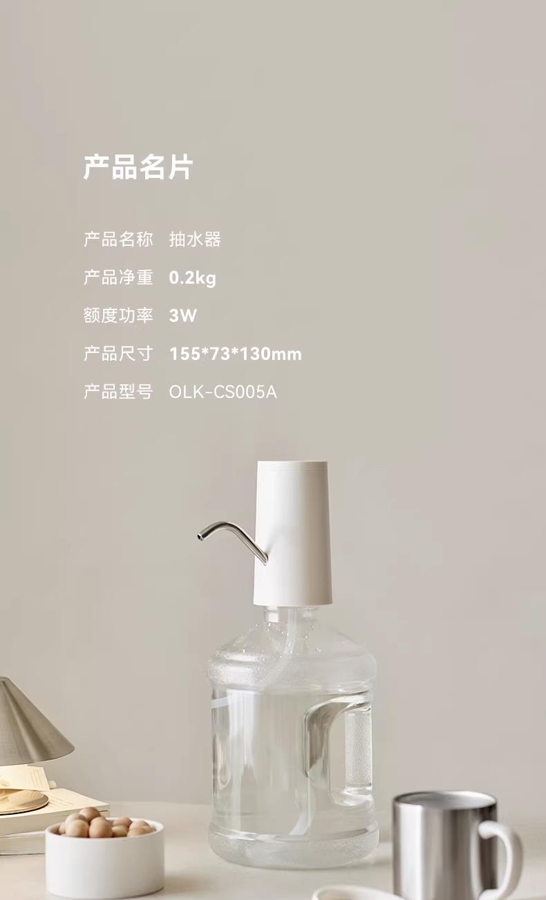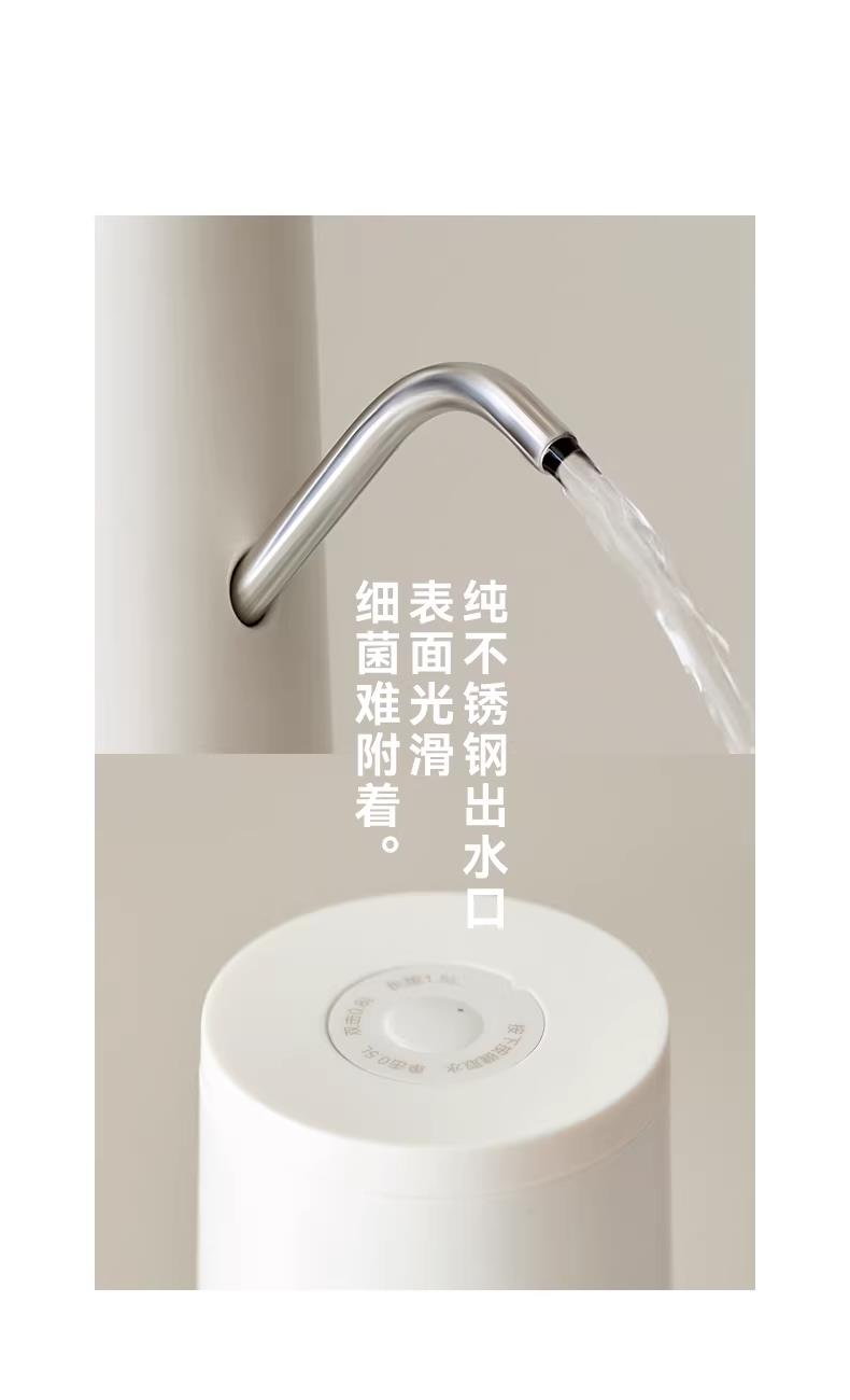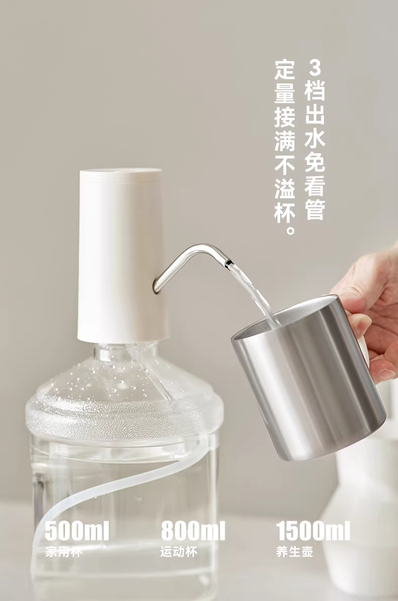 颜色:陶白色 额定功率:3W 产品尺寸:155*73*130mm 产品净重:0.2kg 包装尺寸:162*95*90mm 条码 :6977735712673 1. 316L不锈钢出水口 2. 三档出水免看管,一键出水 3. 定量抽水500ml/800ml/1500ml 4. 长续航电量 充电/电源两用式