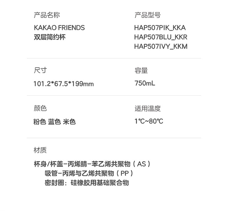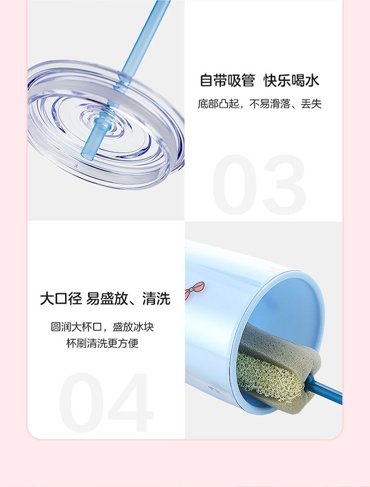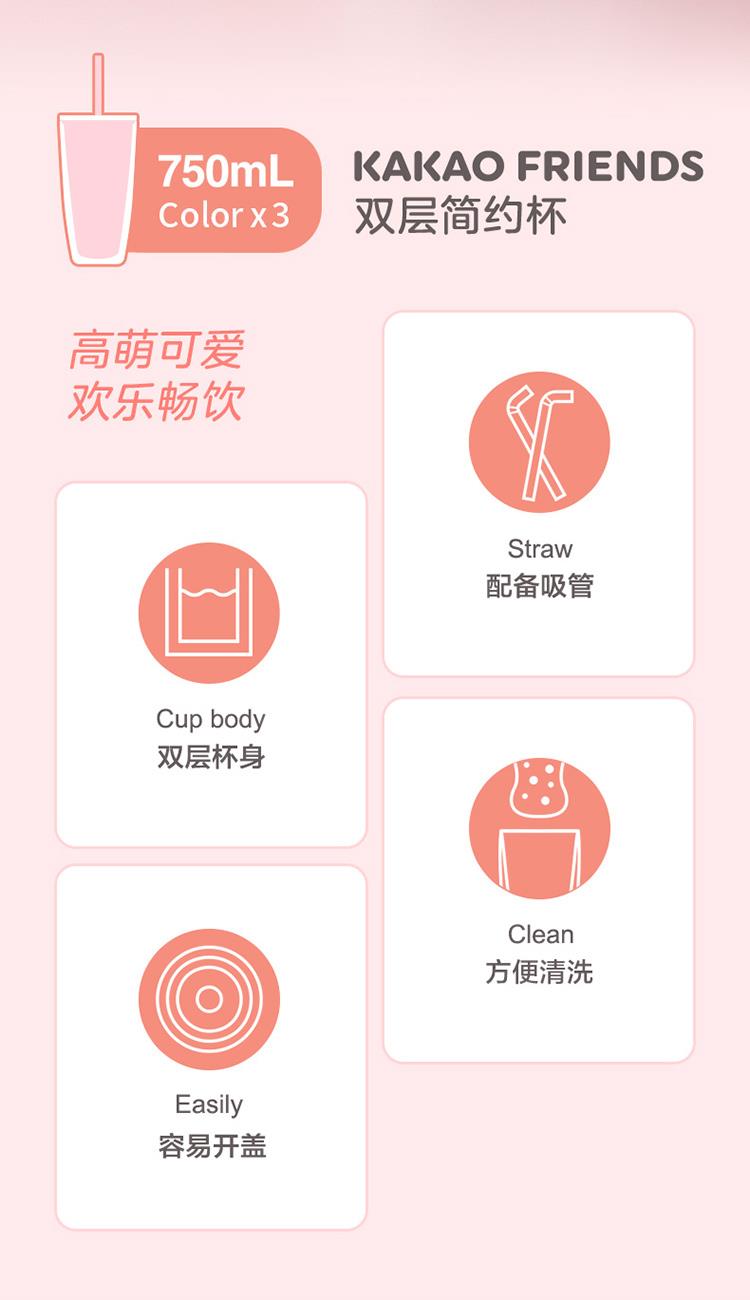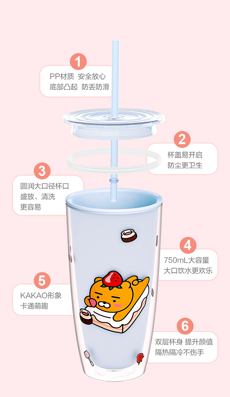 材质:瓶体-PC 吸管-PP 毫升:750ml 产品颜色:粉色 双层杯身结构,隔冷隔热(建议水温50度以下)。 防尘杯盖,食品级硅胶圈杯盖固定不易脱落。 防掉吸管设计,自带吸管。 冷色调系风格。 随心畅饮 750毫升