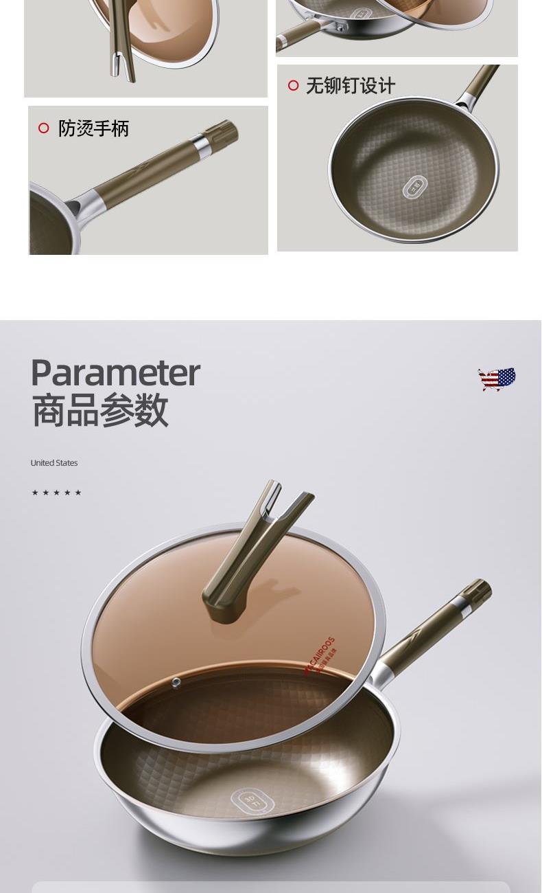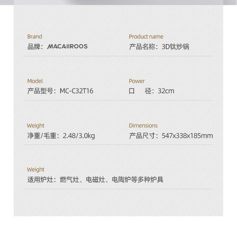 口 径:32cm 材 质:304不锈钢 产品净重:2.48kg 产品毛重:3.0kg 整箱重量:9.4kg 装 箱 数:6台/箱 产品尺寸:547x338x185mm 彩盒尺寸:345x120x525mm 产品条码:6971537231288 外箱尺寸:745x540x365mm
