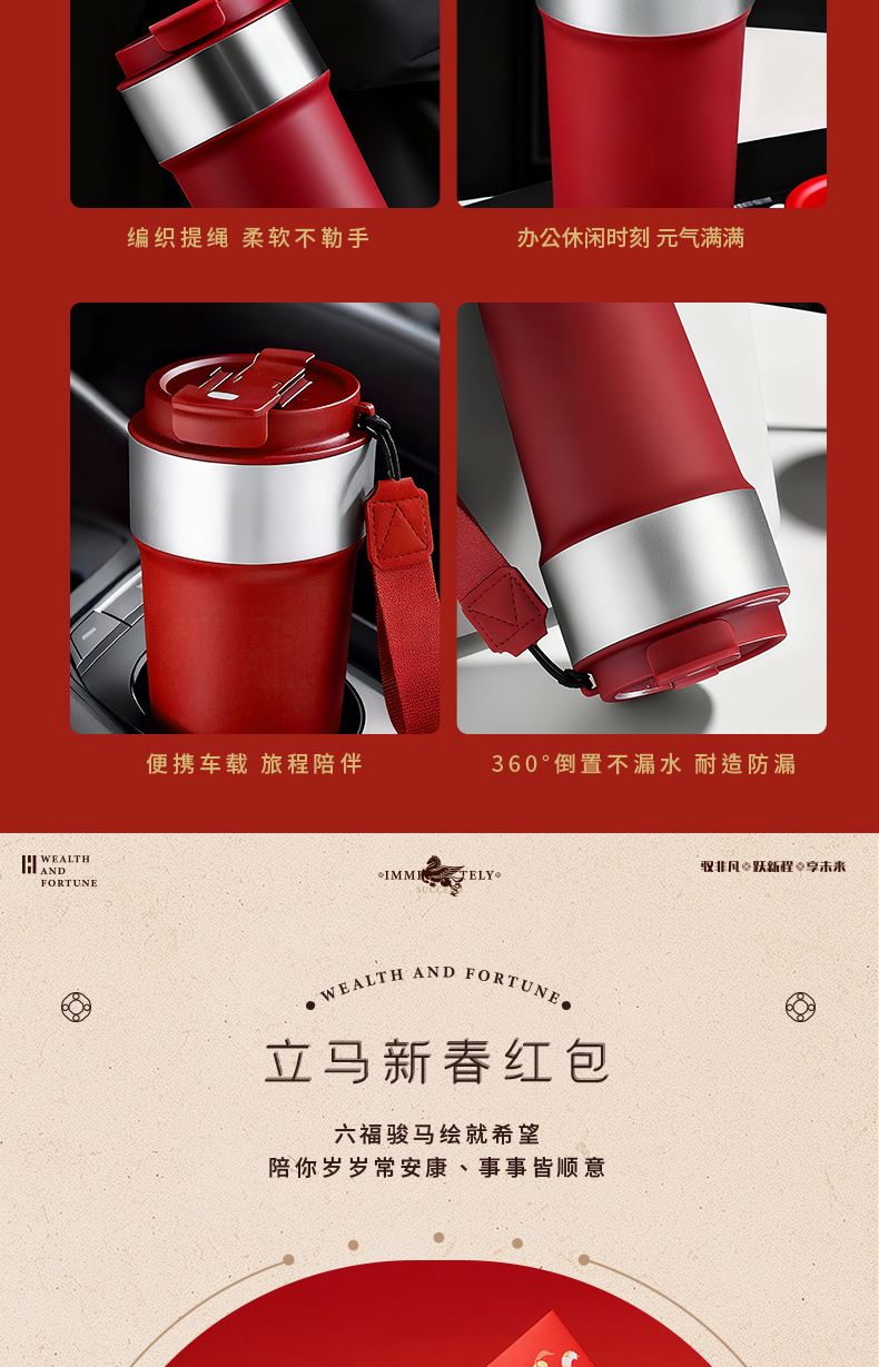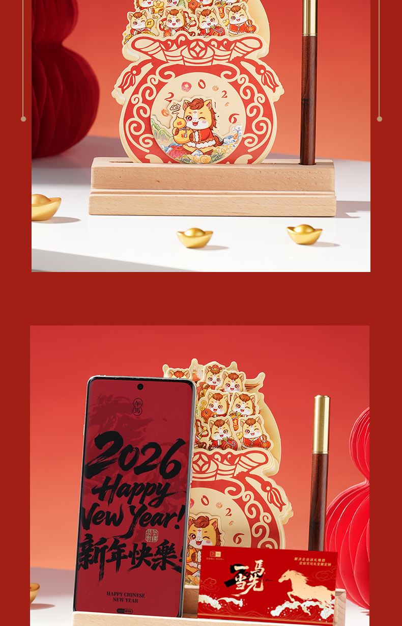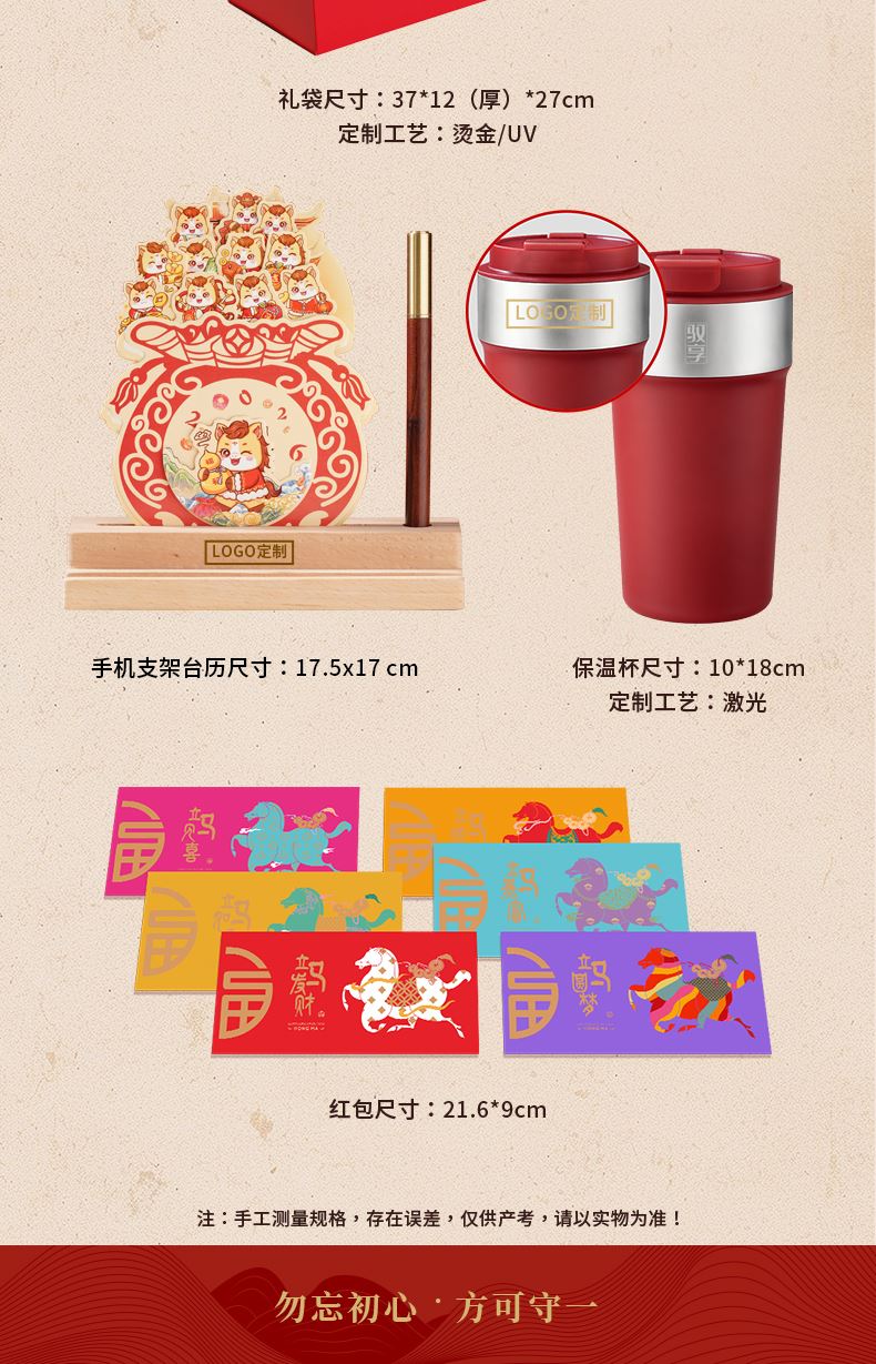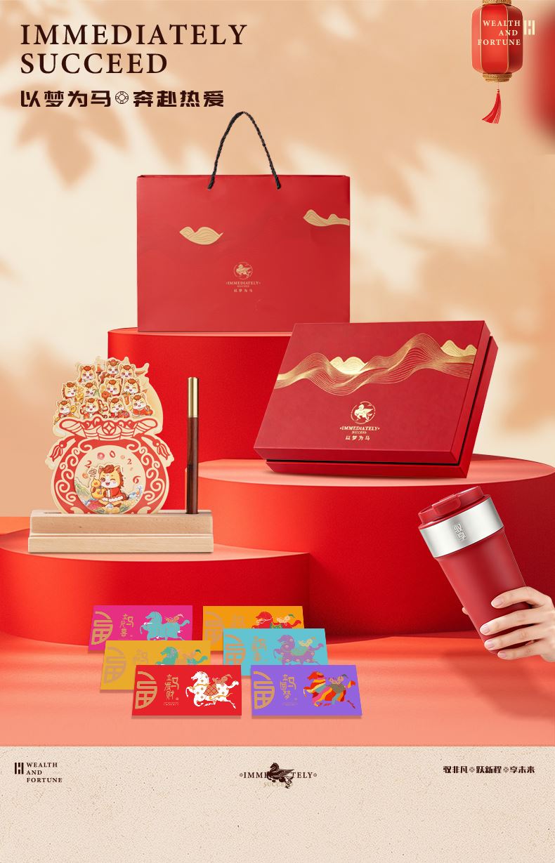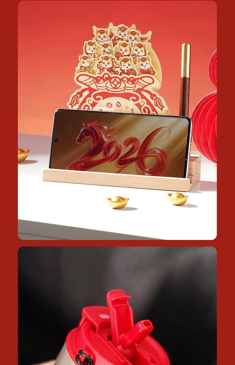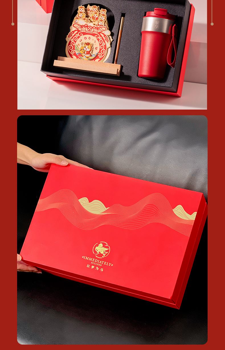 1、多功能日历摆件:底坐榉木,手机加平板电脑支架功能、笔插功能、留言板功能 2、红色咖啡杯:510ML 内胆一体成型304钢 3、红木签字笔:书写新年 新篇章 4、新年红包*6:开启新年好运程