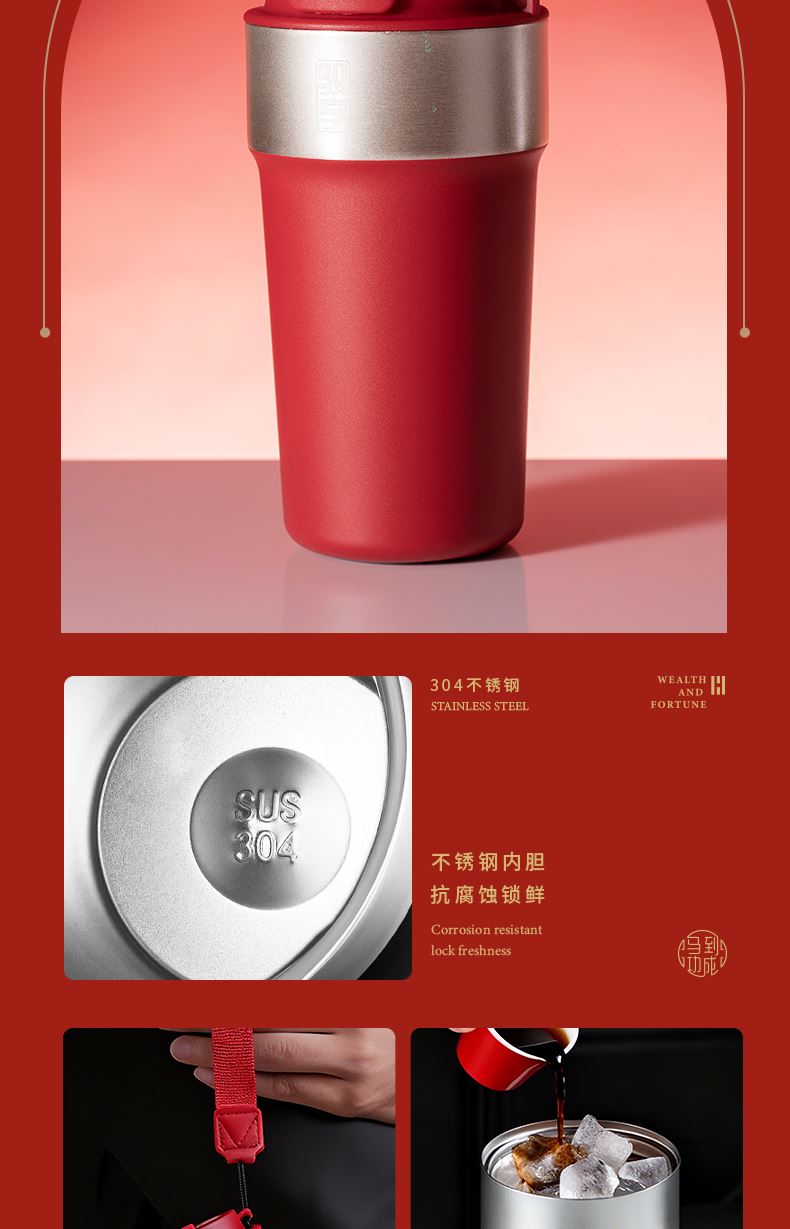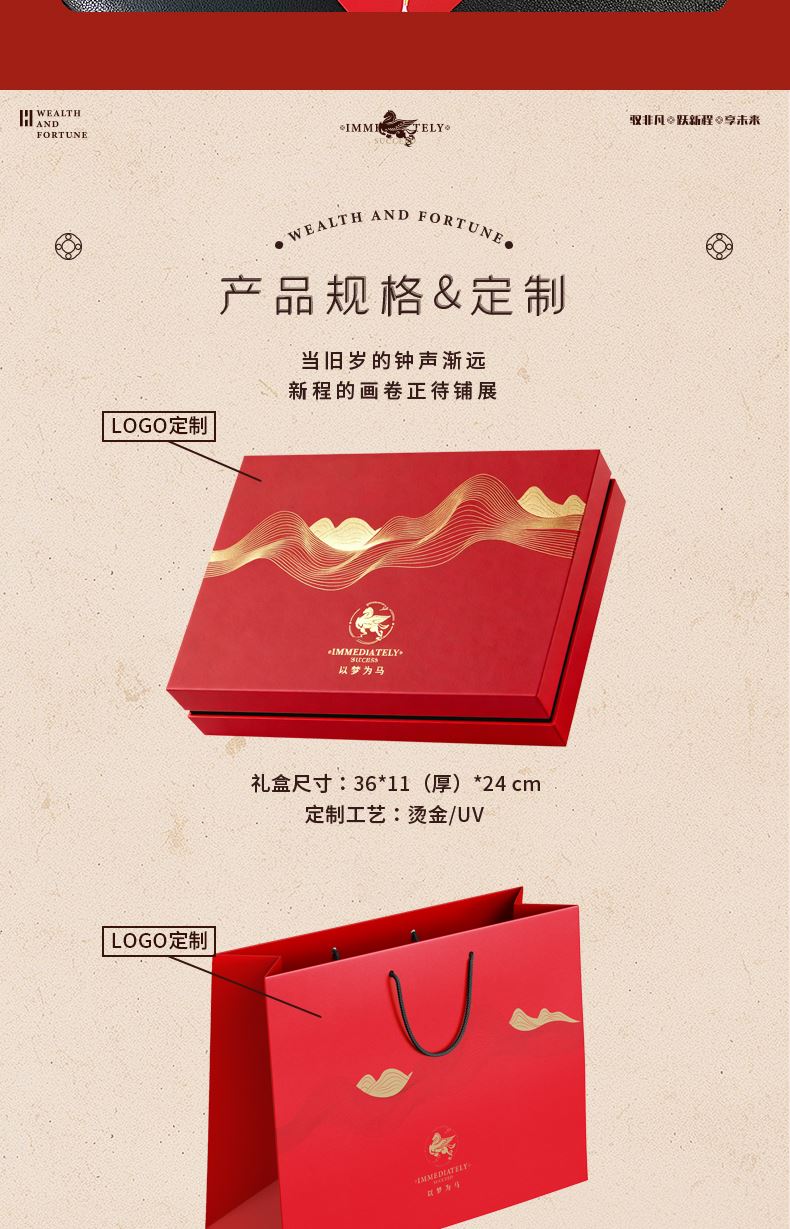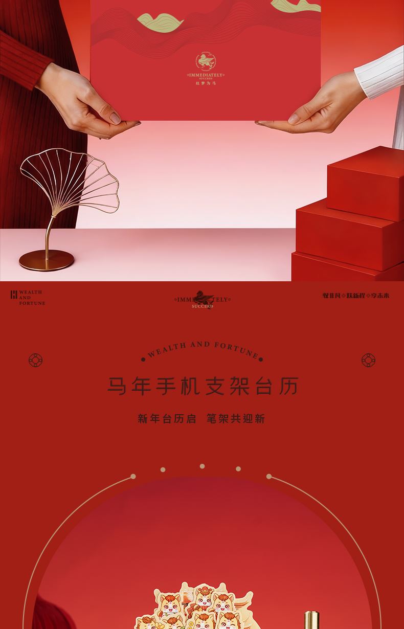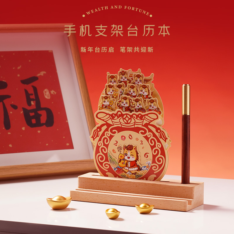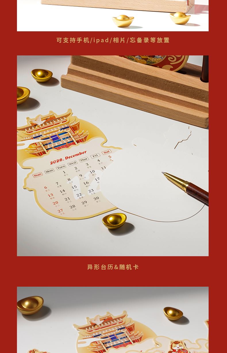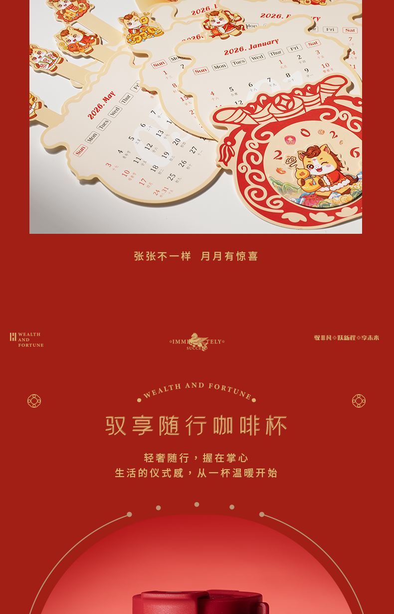1、多功能日历摆件:底坐榉木,手机加平板电脑支架功能、笔插功能、留言板功能 2、红色咖啡杯:510ML 内胆一体成型304钢 3、红木签字笔:书写新年 新篇章 4、新年红包*6:开启新年好运程