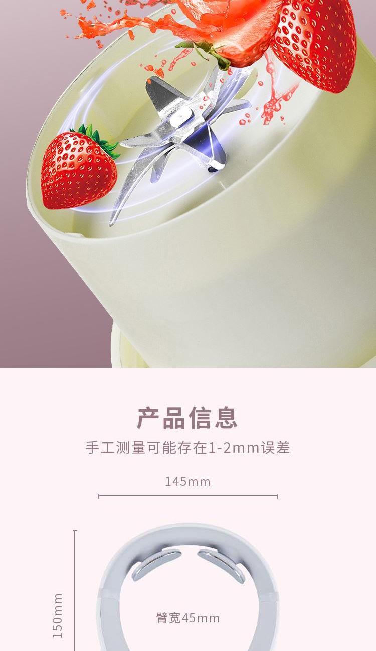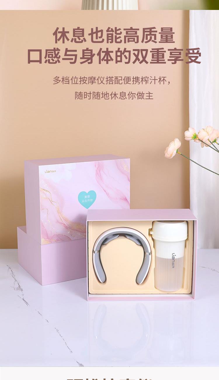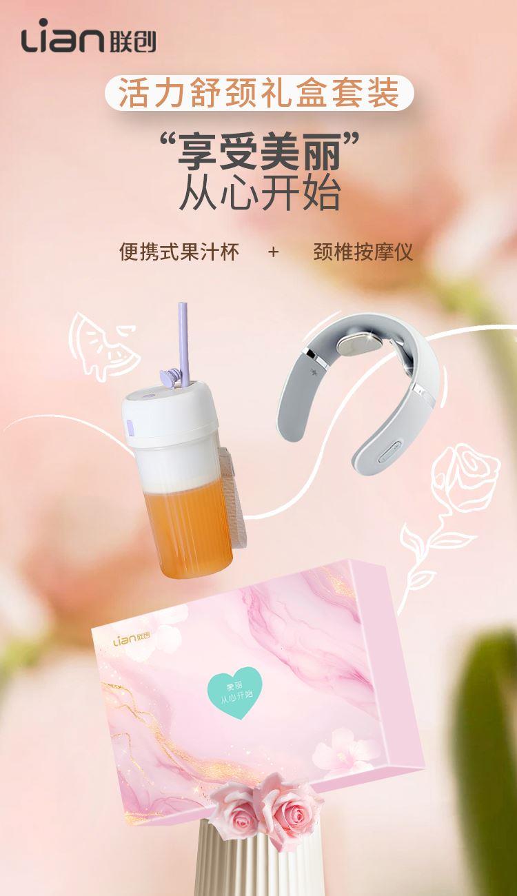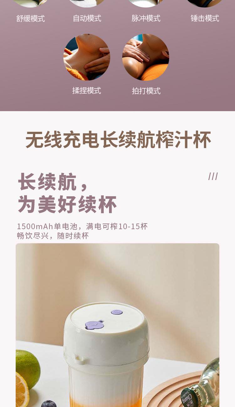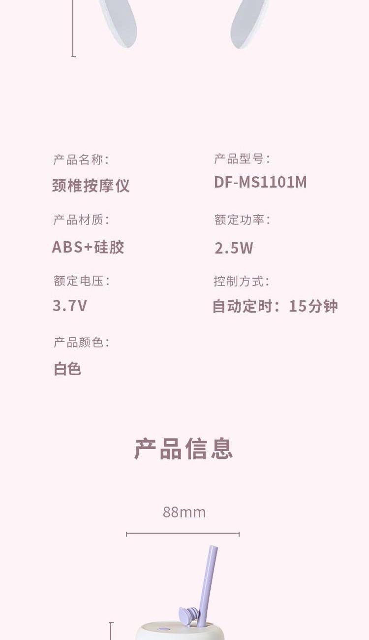 便携式果汁机 DF-JP620M 工作功率:35W 工作电压:3.7V ⎓ 电池容量:1500mAh 额定容量:340ml 颈部按摩仪 DF-MS1101M 额定输入:DC5V/1A 额定功率:1.5W 电池规格:300mAh/3.7V 热敷功能 10大模式 16档调节
