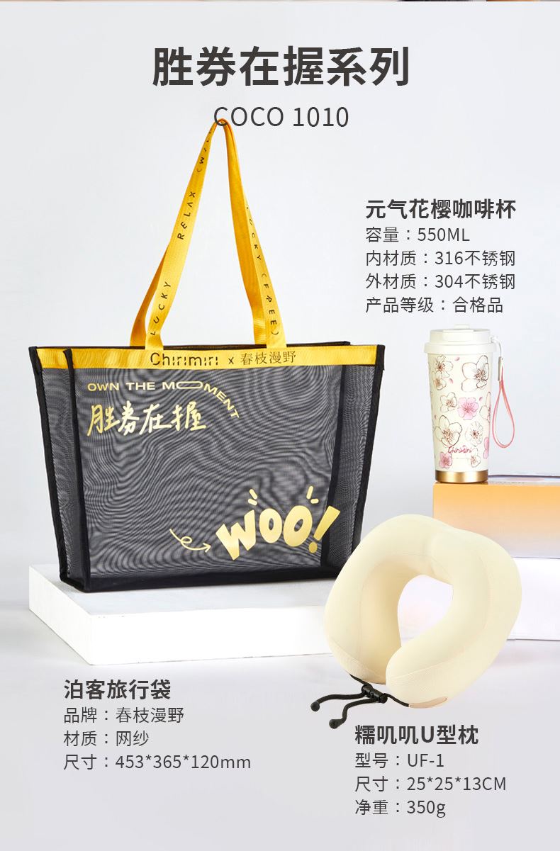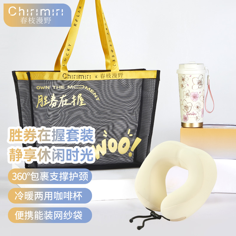 ① :糯叽叽U型枕 型号:UF-1 外圈:涤纶 枕芯:记忆棉 净重:0.35kg ② 元气花樱咖啡杯 容量:550ML 材质:内316 外304不锈钢 产品等级:合格品 ③ 泊客旅行袋 春枝漫野 材质:网纱 尺寸:453*365*120mm 轻盈绵柔X环颈暖敷 ,随享云朵般舒适。 护颈内核,9小时+旅行不累 颈部温柔包裹,每一次依靠都变成舒适的拥抱。 透气面料,凉感舒适,让颈部舒享放松。 双内核技术,内芯护颈,外芯舒缓压力 360°曲面环颈承托,轻享颈部按摩,释放「颈」张情绪。 轻量出行,有颜能装~ 雅致生活,三种饮水方式,长效锁温。 浪漫樱花季,精心设计浮雕樱花点缀。 花样泡饮,6H 有效,保留饮品原滋味。 食品级316不锈钢材质,喝水更安全。
