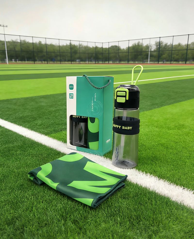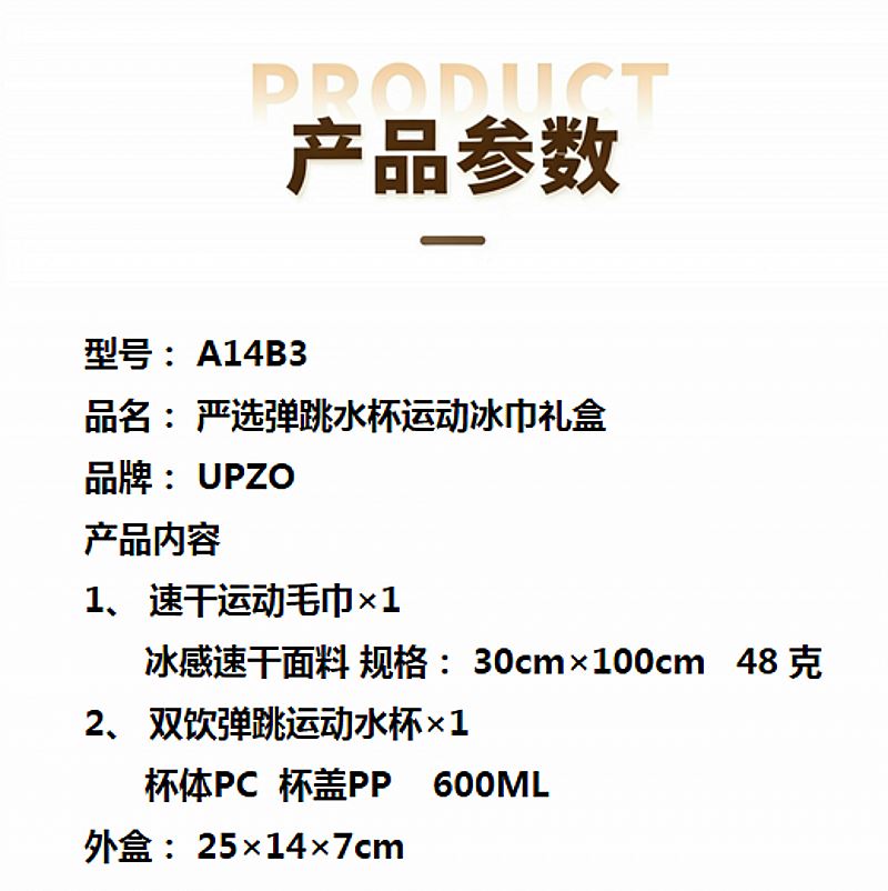 型号: A14B3 产品内容 1、 速干运动毛巾×1 冰感速干面料 规格: 30cm×100cm 48 克 2、 双饮弹跳运动水杯×1 杯体PC 杯盖PP 600ML 外盒: 25×14×7cm 双饮弹跳水杯 三段式开启方式 (可吸管小饮 可弹跳直饮 亦可旋转开启畅饮)品质优异 杯体中间搭配隔热软胶设计 杯盖结合PP提手设计 冰巾采用冰感面料 整版激光印 外观靓丽 运动好搭配