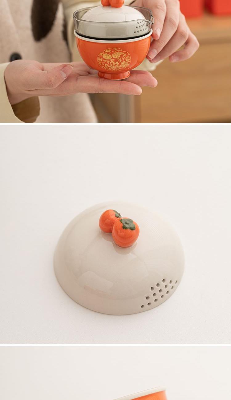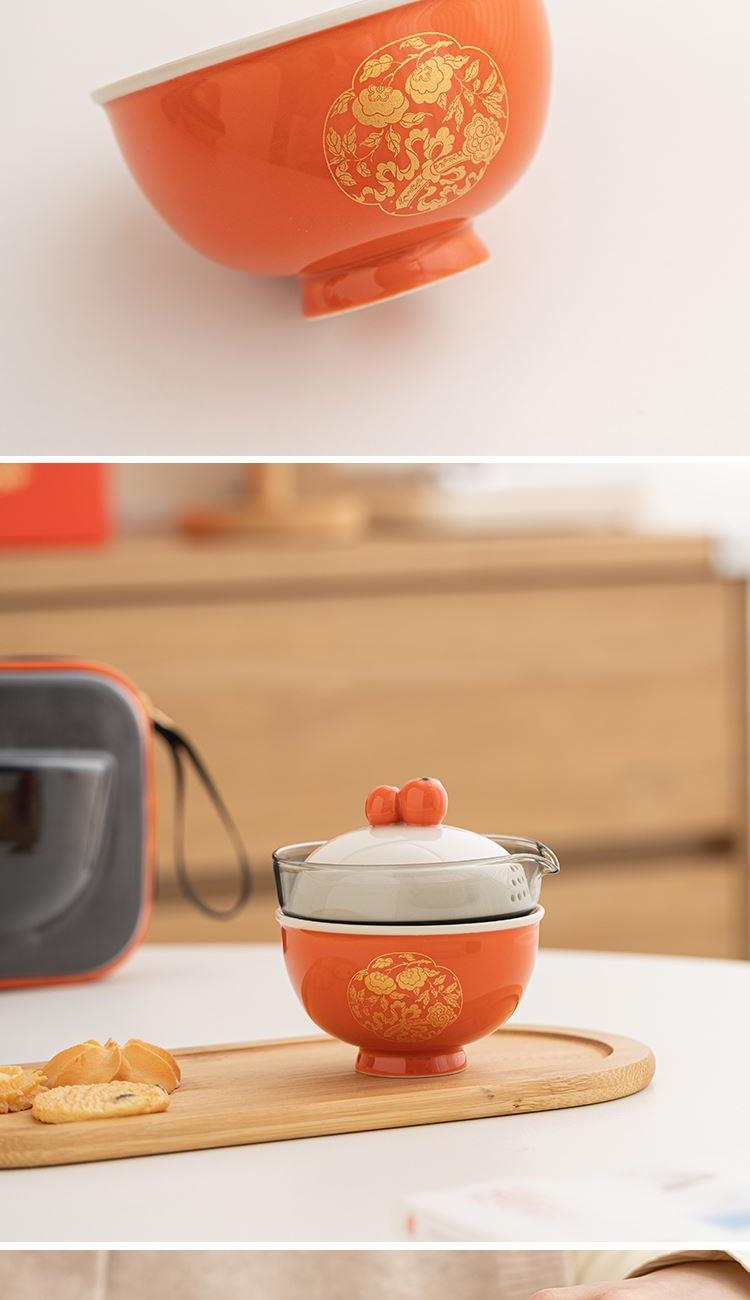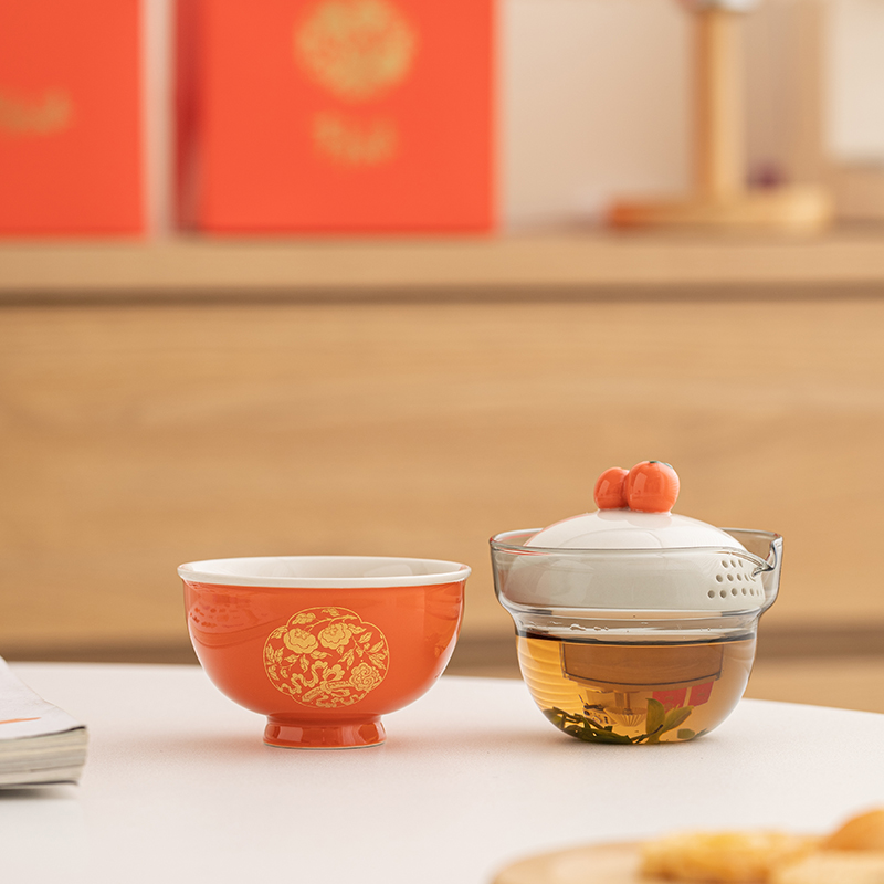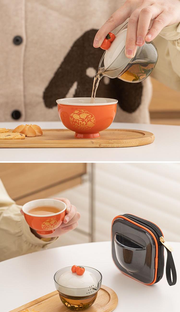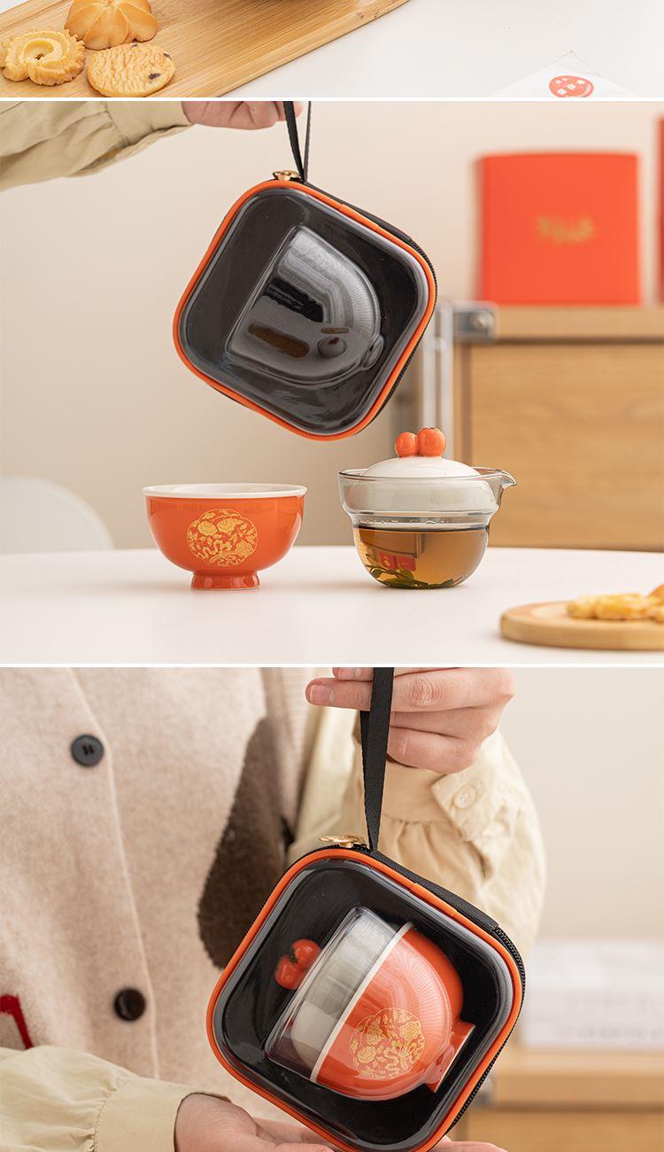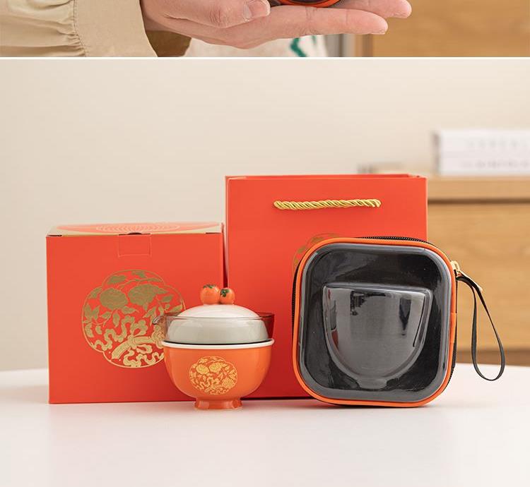 设计理念:器件上,设计灵感来源于清·湖色团花事事如意织金缎绵马褂上的柿蒂纹。器件以传统压手杯为造型基础,经过艺术提炼,实现功用性和美观性的结合。其中壶盖以柿子为盖钮,两颗柿子相互偎依,点出“事事如意”的主题。纵观整体,器件造型饱满圆润,观之雅致,加之橙红釉色器件的装饰以“如意柿子”纹样的金花纸,更显得精致富丽。器件整体寄意世间美好永固、好事成双,是颜值之礼,也是对生活美好祝福之礼。 配置:柿子旅行茶具一套、EVA旅行便携包*1、设计理念卡片*1、礼盒、礼袋