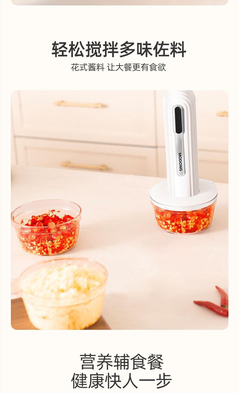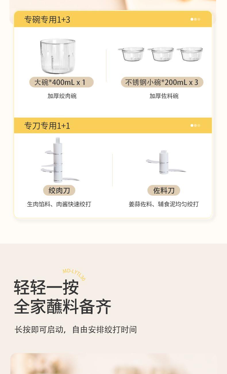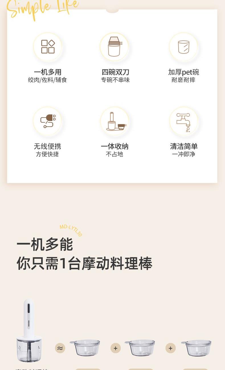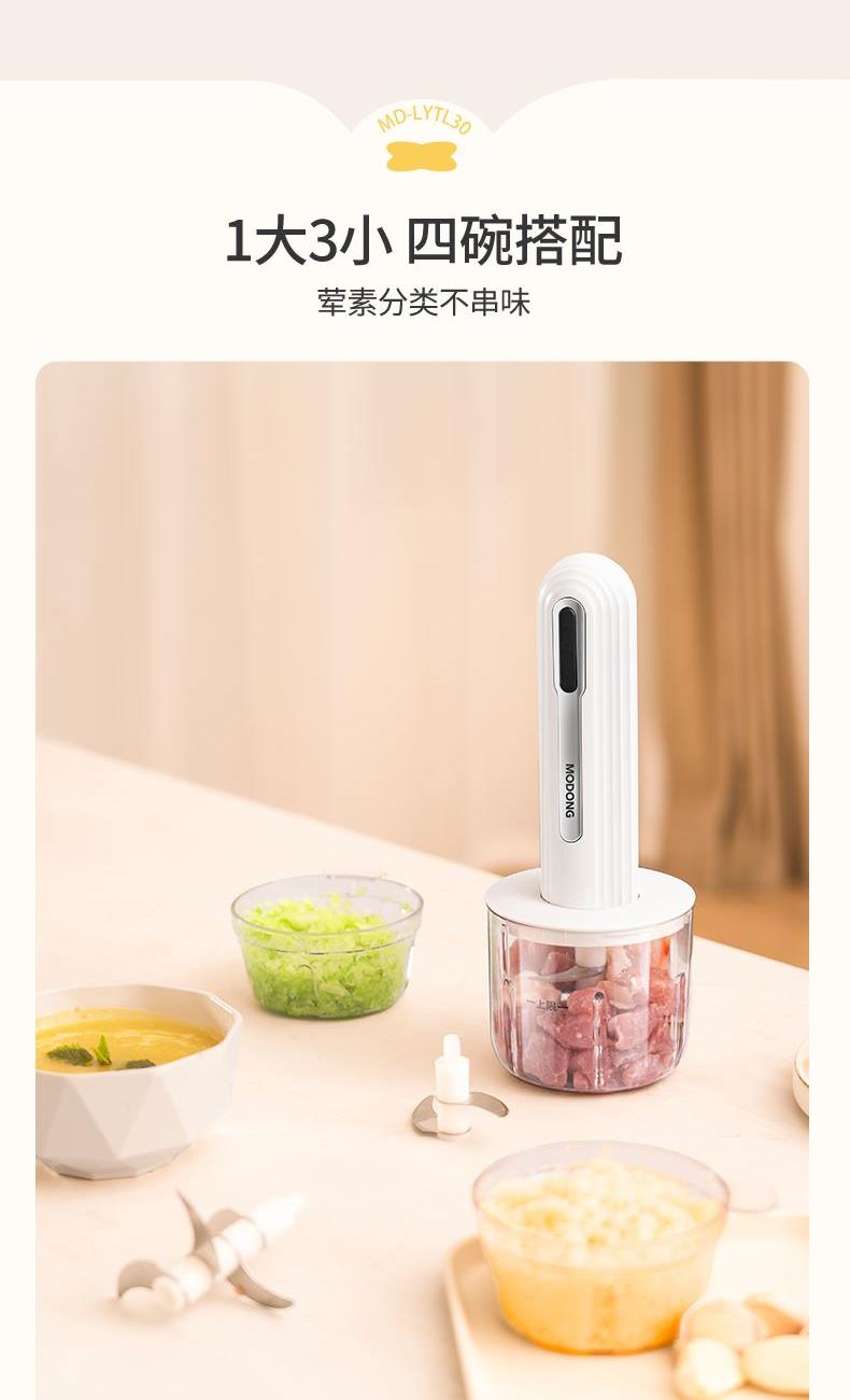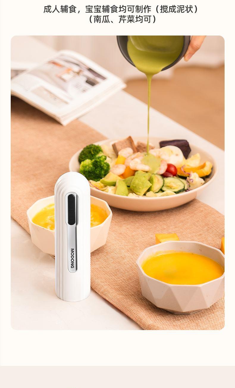 产品净重:0.46KG 产品毛重:0.71KG 额定功率:30W 输入电压:DC5V 1A 容量:PET杯400ML+PET杯200ML*3 内含:400mL搅拌碗x1、200mL搅拌碗X3/搅拌刀X2、电源线x1、说明书x1、主机x1 1.Type-C快充3-4小时,满电搅打20次; 2.大杯搅肉泥400mL,小杯200mL做果酱,四叶/两叶刀片按需切换; 3.卡刀自停+双重保护;食材过量自动断电,电压异常红灯预警,小白操作零风险; 4.极简料理逻辑30秒,点动开关一按即用,单手操作解放宝妈。
