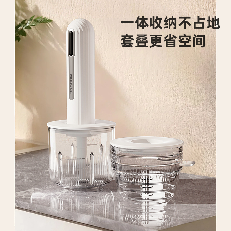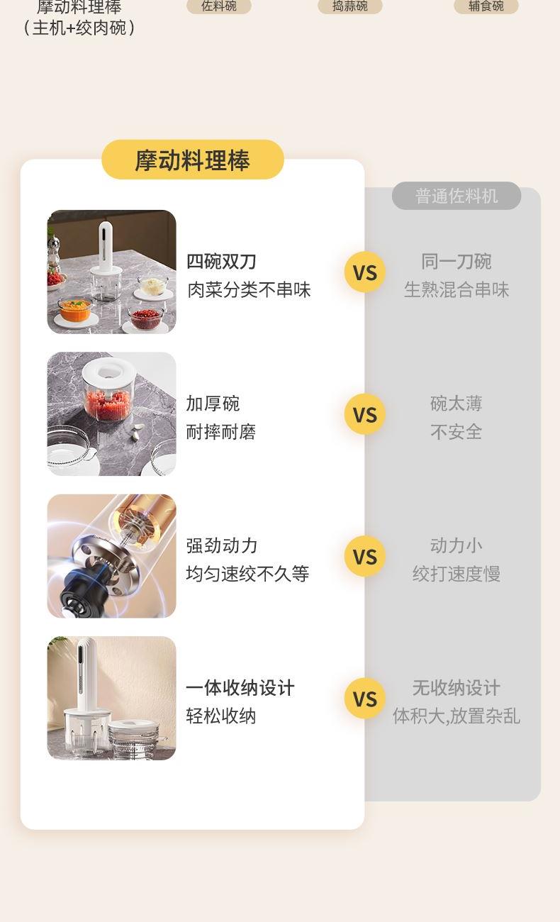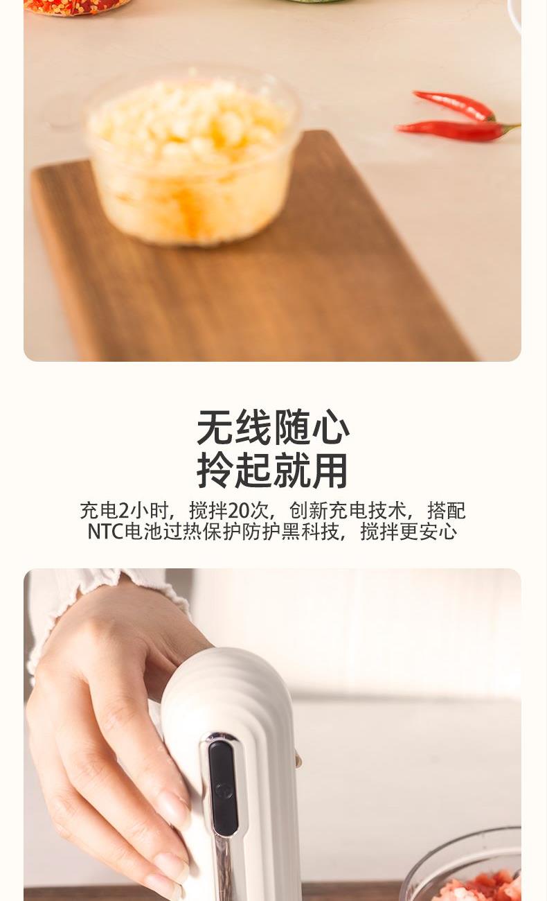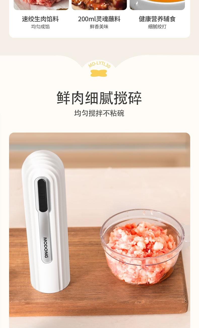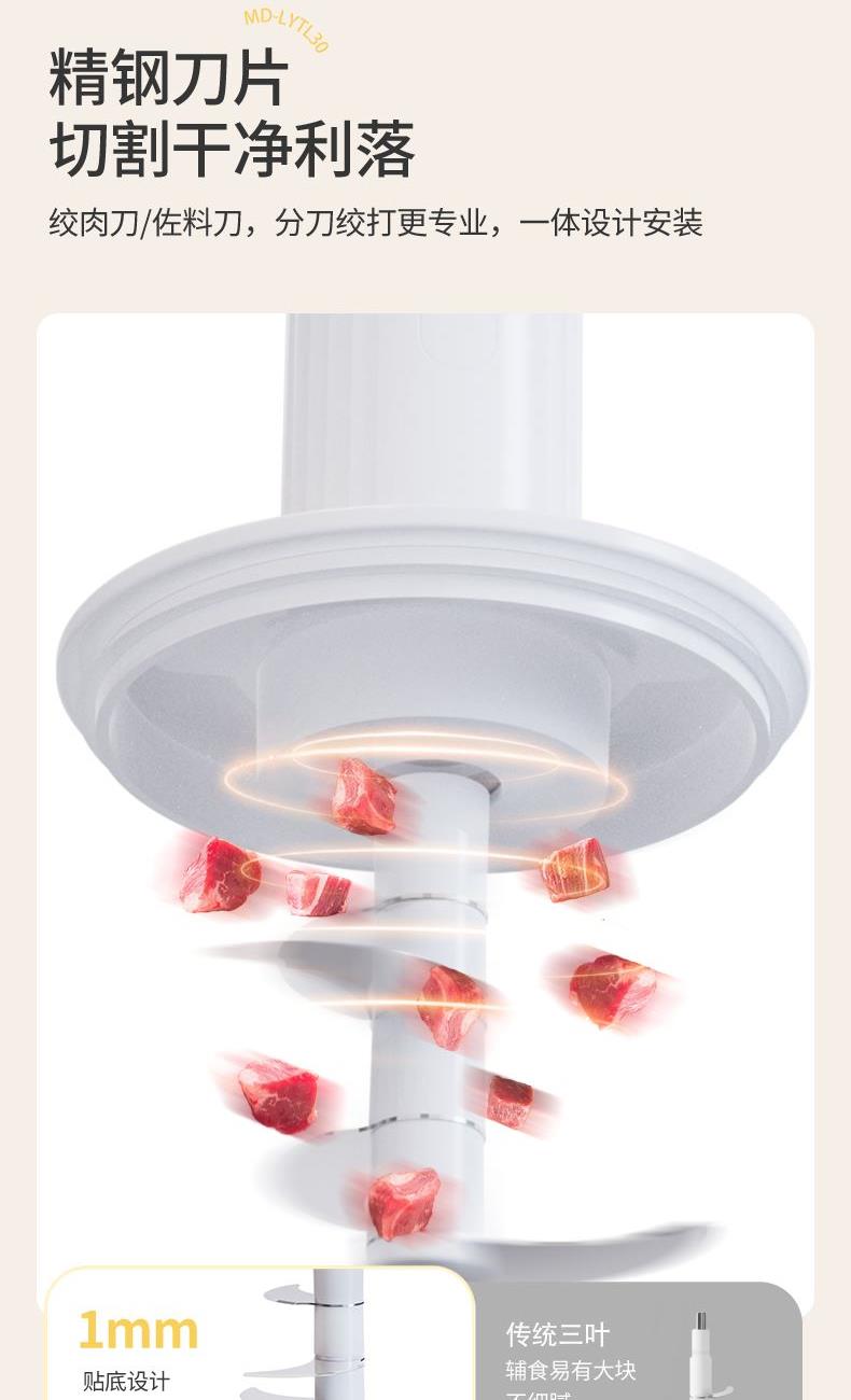 产品净重:0.46KG 产品毛重:0.71KG 额定功率:30W 输入电压:DC5V 1A 容量:PET杯400ML+PET杯200ML*3 内含:400mL搅拌碗x1、200mL搅拌碗X3/搅拌刀X2、电源线x1、说明书x1、主机x1 1.Type-C快充3-4小时,满电搅打20次; 2.大杯搅肉泥400mL,小杯200mL做果酱,四叶/两叶刀片按需切换; 3.卡刀自停+双重保护;食材过量自动断电,电压异常红灯预警,小白操作零风险; 4.极简料理逻辑30秒,点动开关一按即用,单手操作解放宝妈。