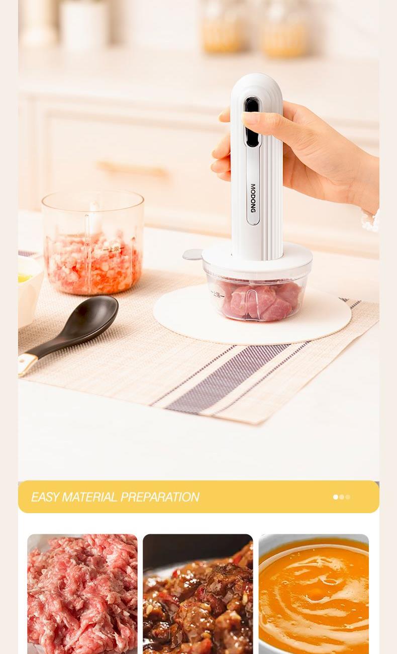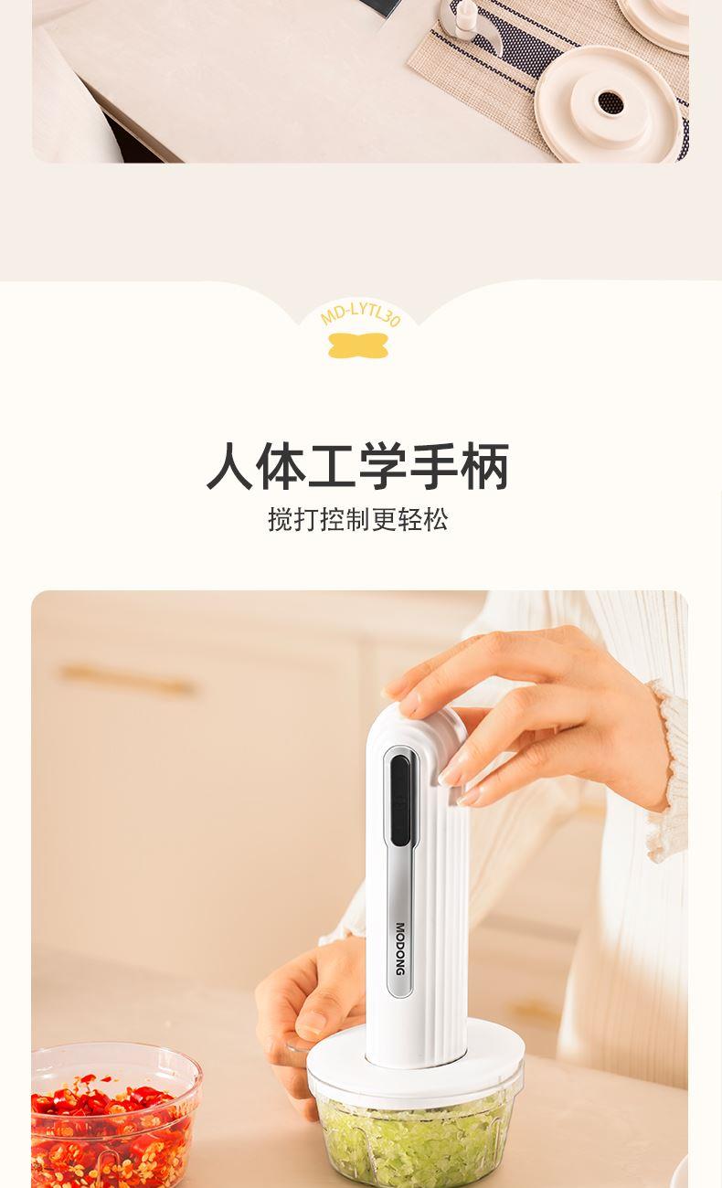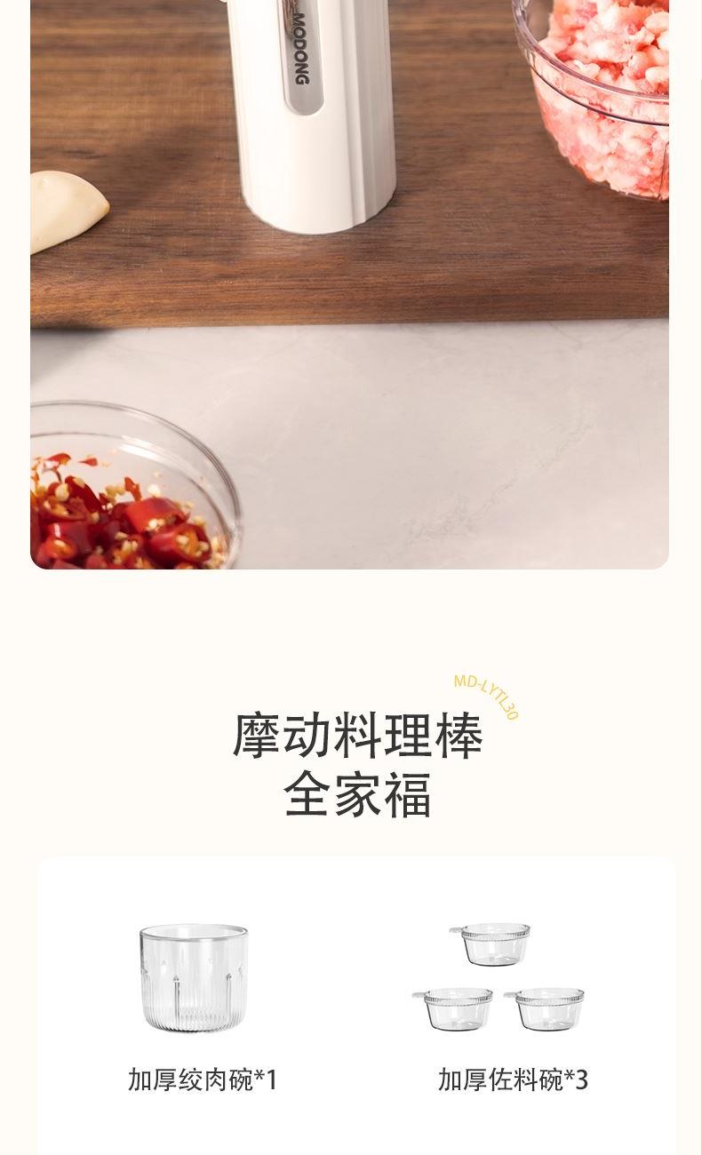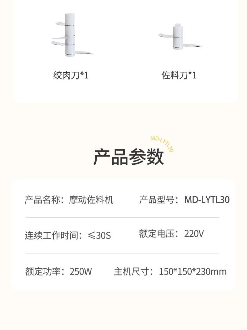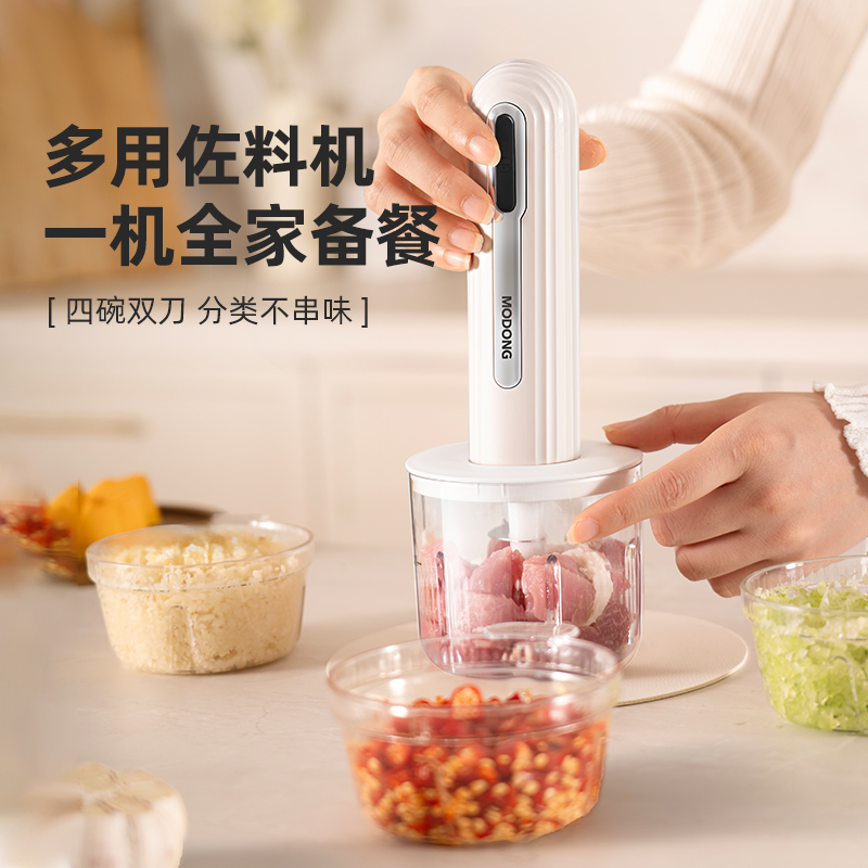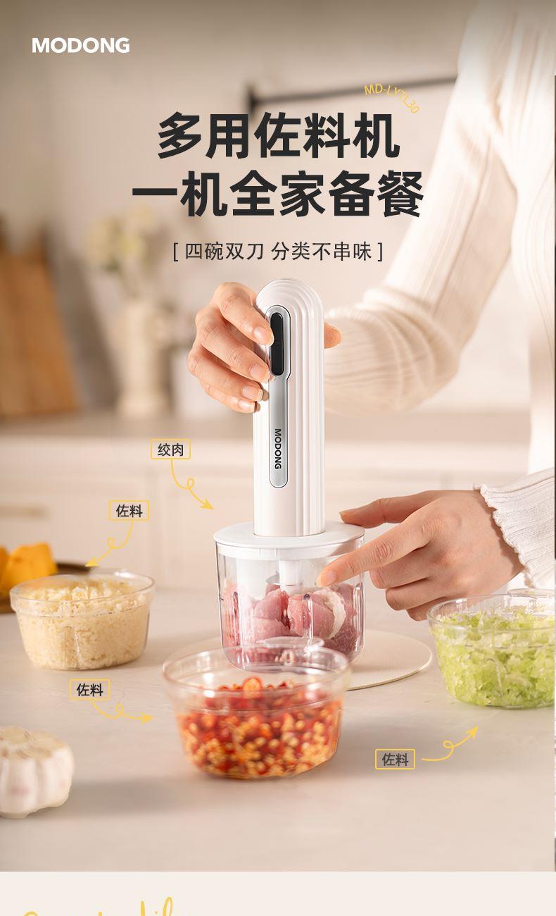 产品净重:0.46KG 产品毛重:0.71KG 额定功率:30W 输入电压:DC5V 1A 容量:PET杯400ML+PET杯200ML*3 内含:400mL搅拌碗x1、200mL搅拌碗X3/搅拌刀X2、电源线x1、说明书x1、主机x1 1.Type-C快充3-4小时,满电搅打20次; 2.大杯搅肉泥400mL,小杯200mL做果酱,四叶/两叶刀片按需切换; 3.卡刀自停+双重保护;食材过量自动断电,电压异常红灯预警,小白操作零风险; 4.极简料理逻辑30秒,点动开关一按即用,单手操作解放宝妈。