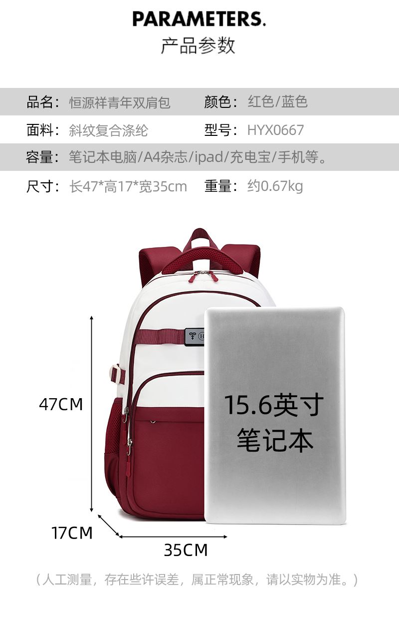 产品型号:HYX0667 产品颜色:红色、蓝色 产品材质:斜纹复合涤纶 产品尺寸:47*17*35cm 产品重量:0.67kg 外包装尺寸:45*48*65mm