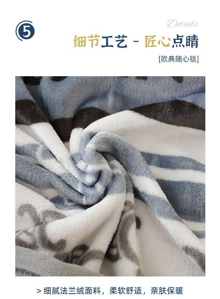 品 名:欧典随心毯 型 号:HS-T-XW17102 面 料:法兰绒印花 规 格:150*200cm/920g 产品说明: 1.朴素简约的印花活性印染,色泽靓丽,垂悬感佳,色布直角宽包边工艺,毯型线条流畅,水晶超柔面料亲肤性更强,铺盖效果更优; 2.280克平方克重,手感更密实,适用于车载、办公、家居等各空间,折叠收纳方便,为宏石家纺促销、积分爆款毯型,可作薄毯春秋被铺盖,适合一年四季使用。