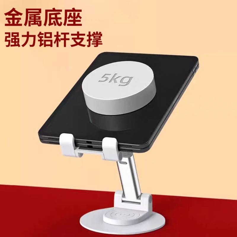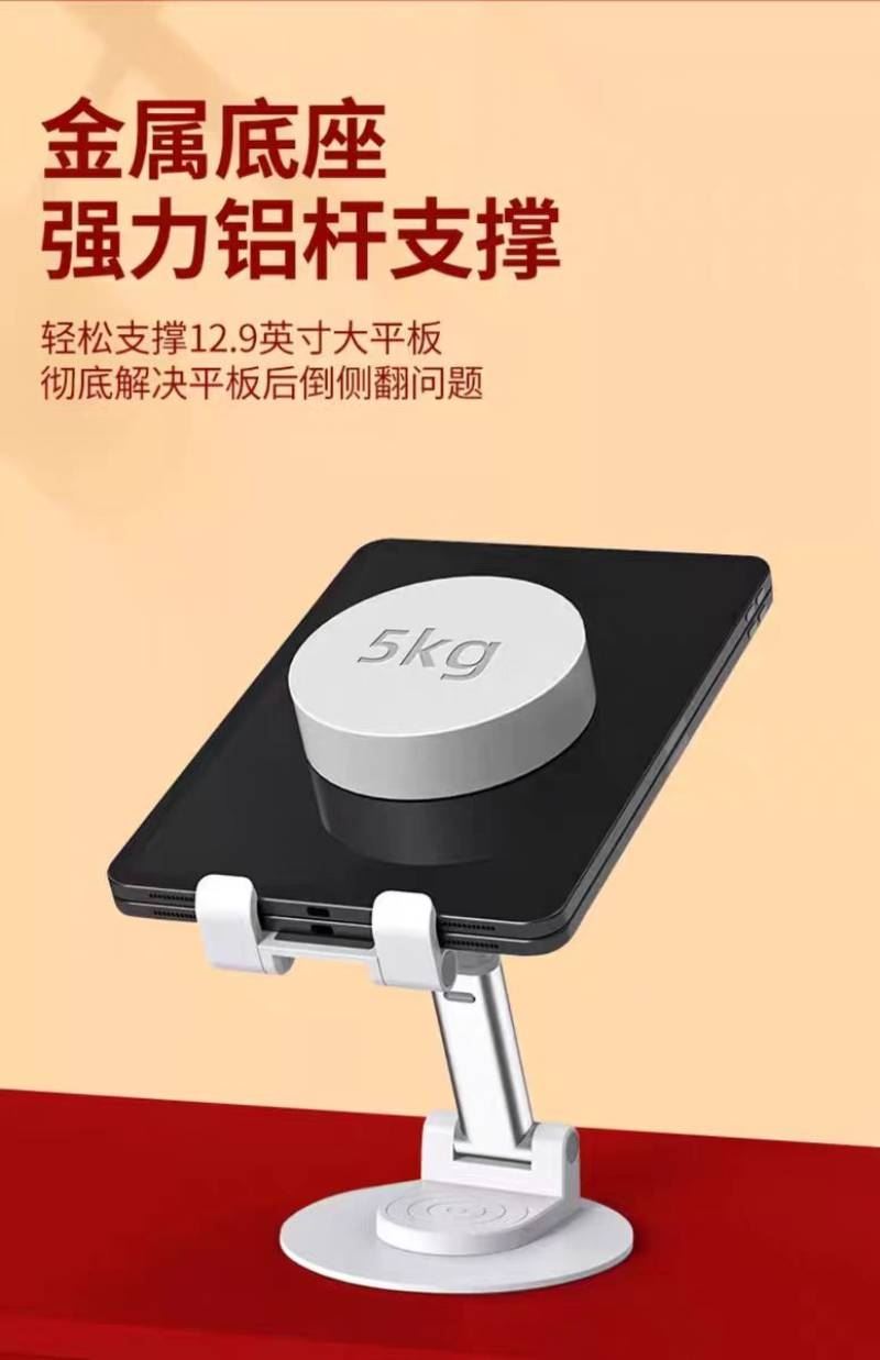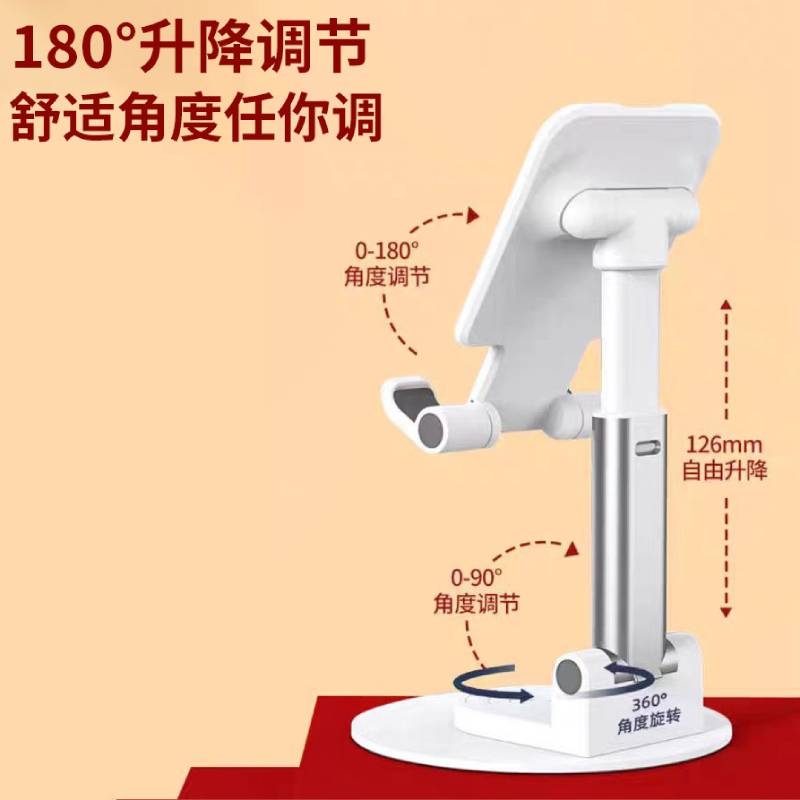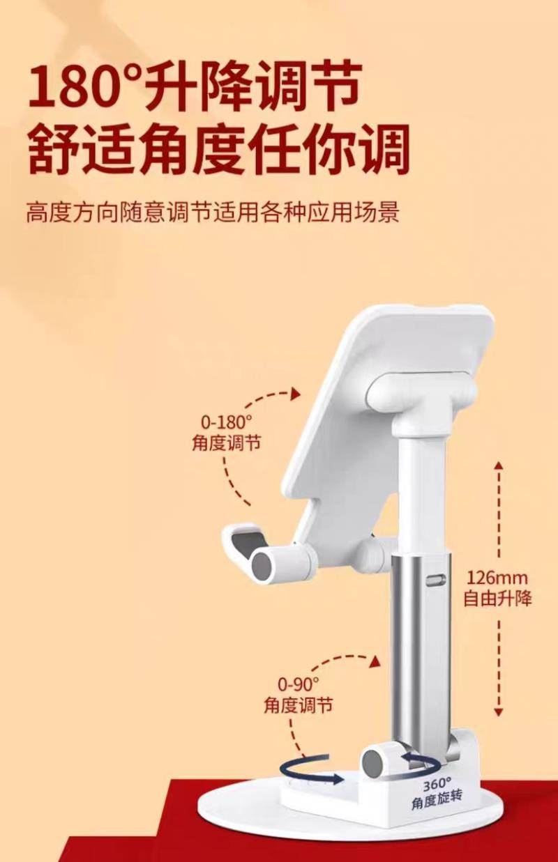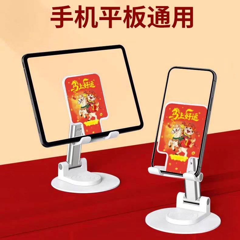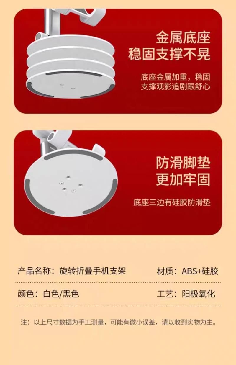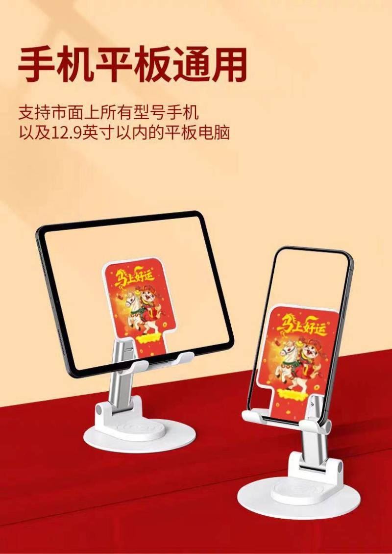 材质:PS+五金底座 颜色:白色 适用设备:手机/平板 包装尺寸:126*100*33mm 重量:195g • 财滚滚旋转折叠手机支架,手机平板都适用,可360度旋转、自由伸缩、折叠便携。 • 适用:家用/办公/直播/游戏/观影追剧等 • 可定制LOGO