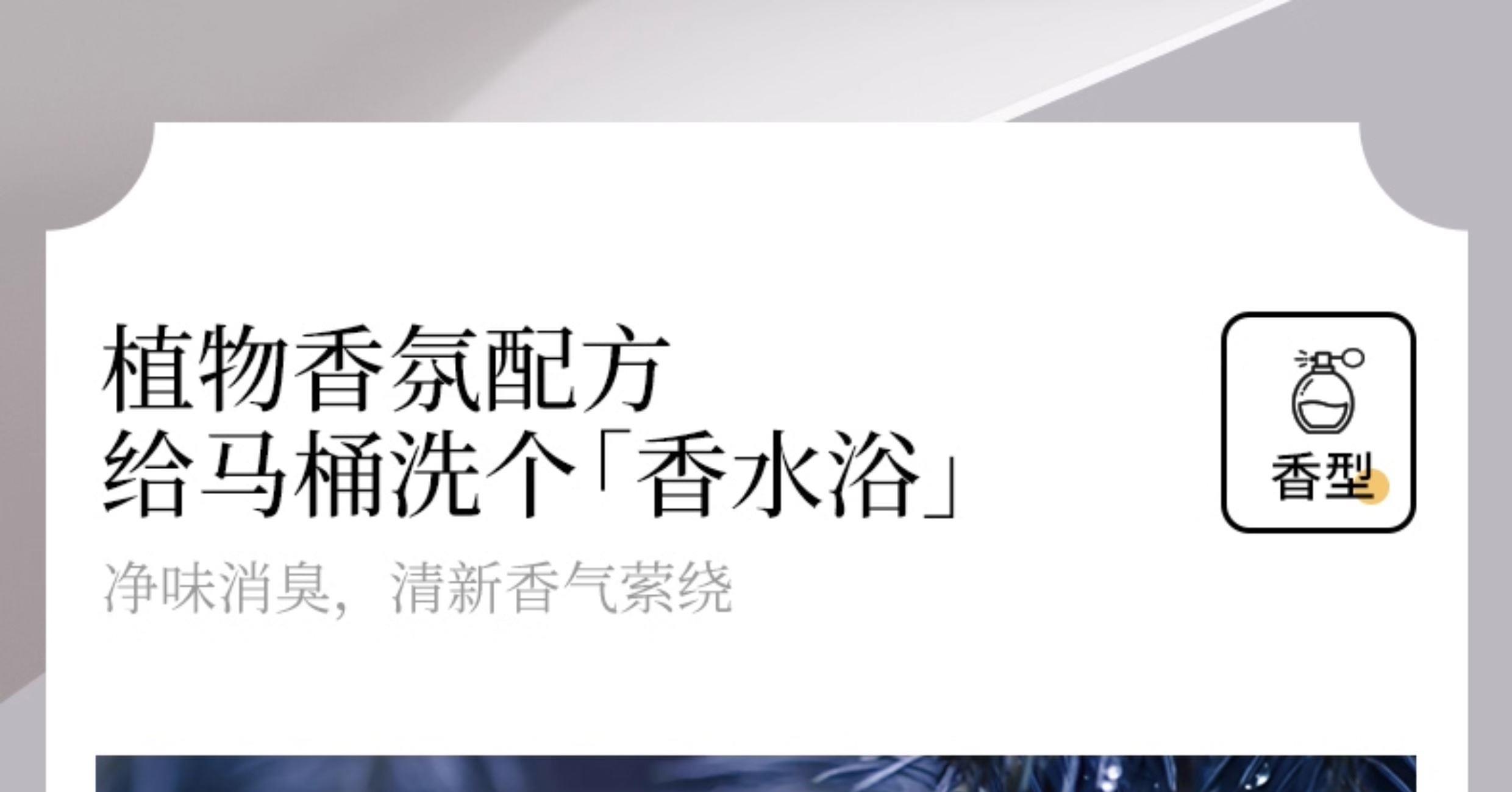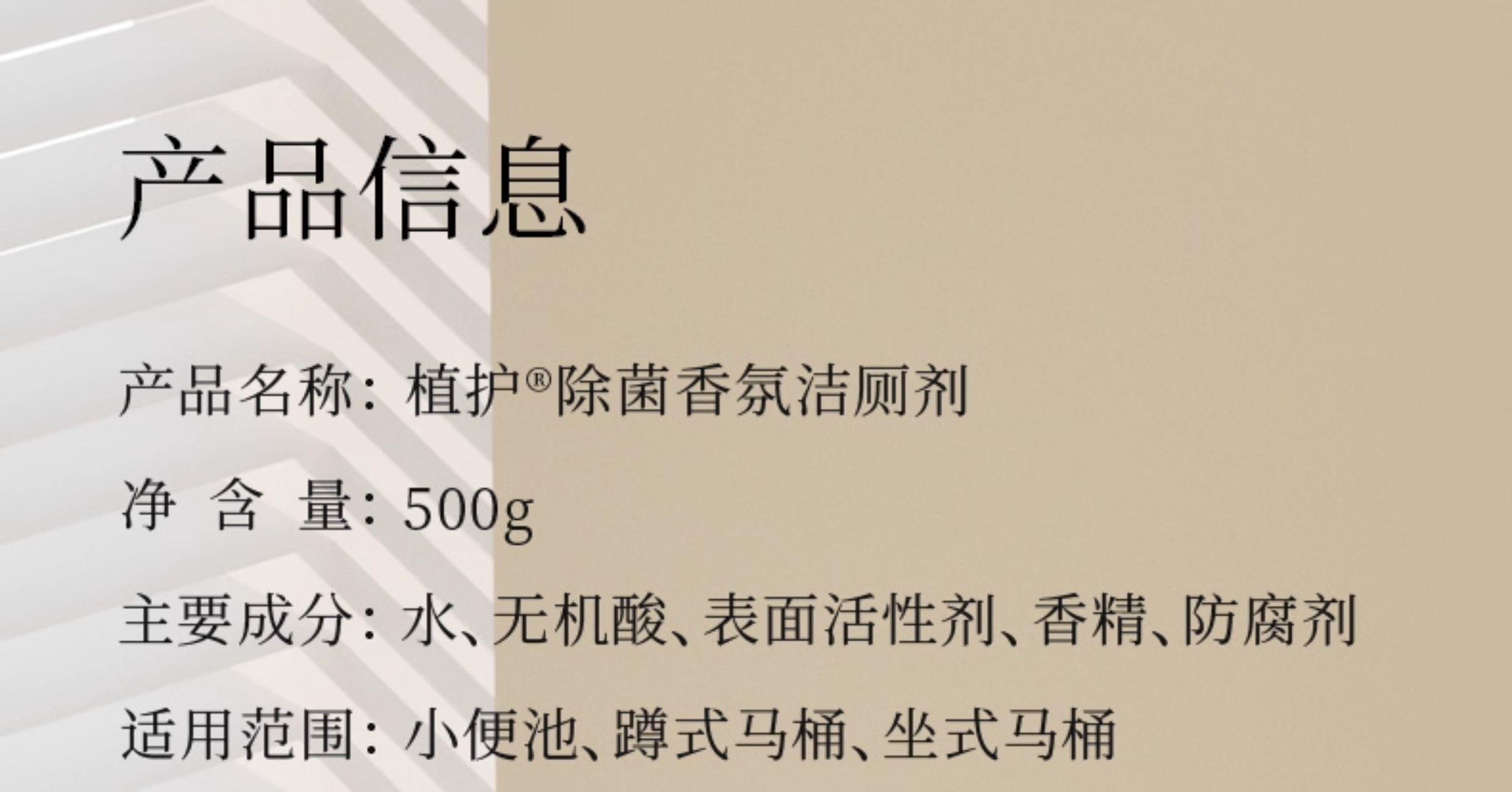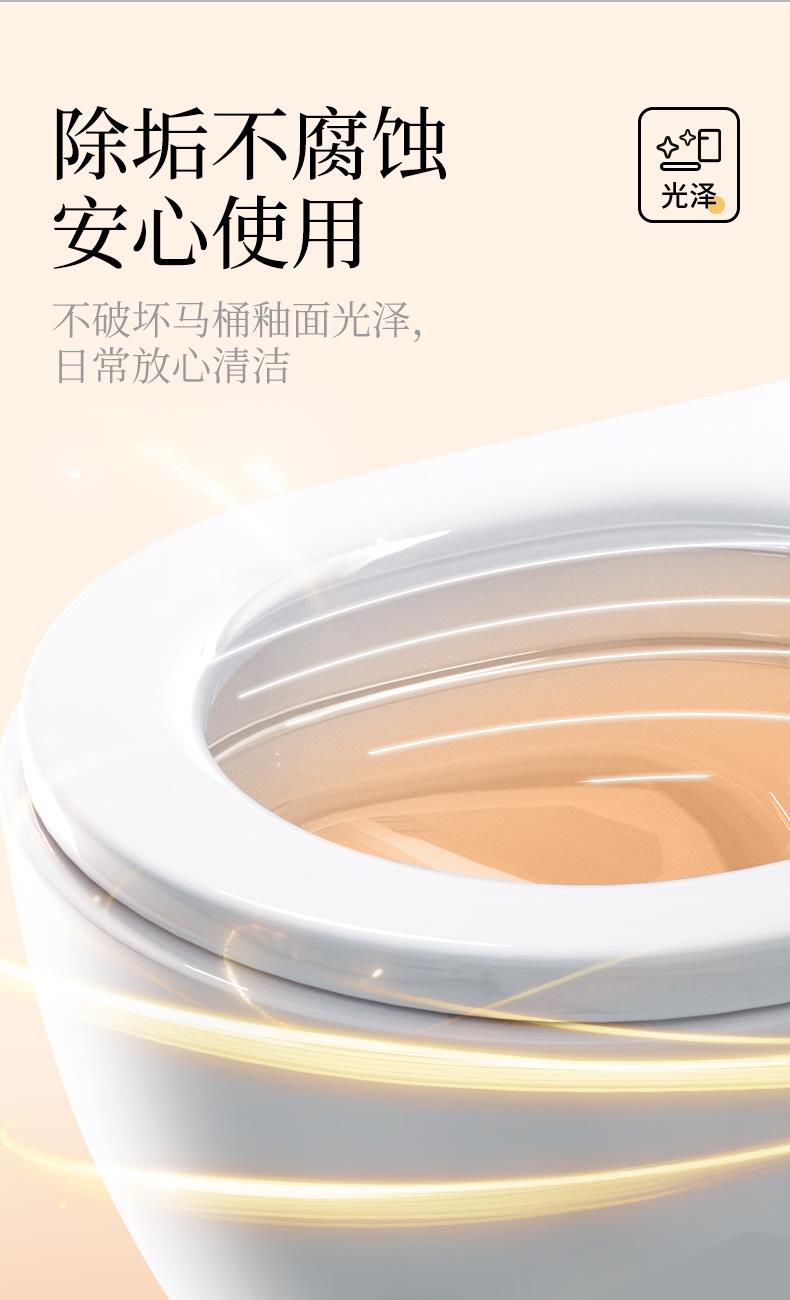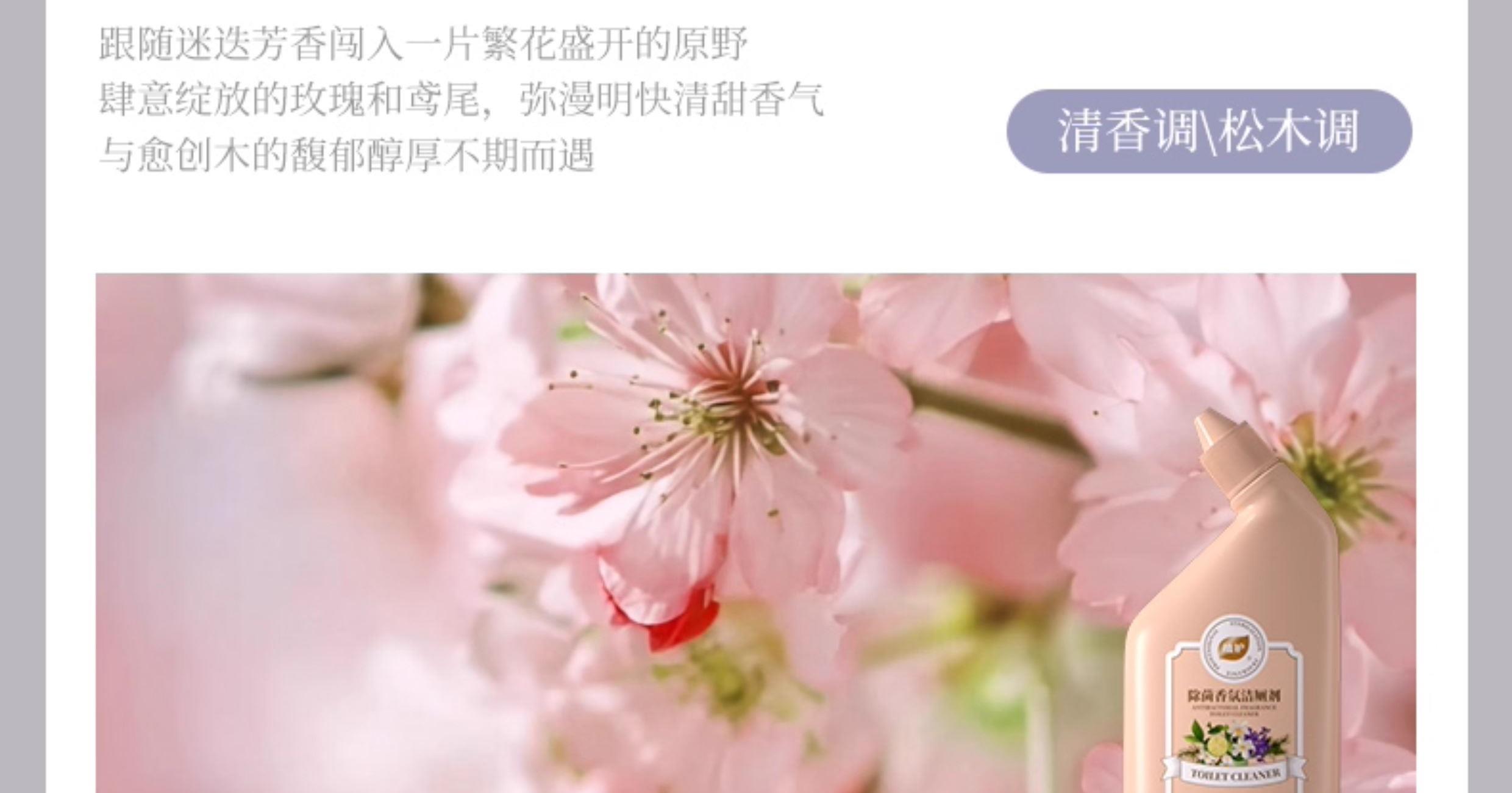 净含量:500g 香型:樱花树下、阳光松木 香型随机 主要成分:水、无机酸、表面活性剂、香精、防腐剂 适用范围:小便池、蹲式马桶、坐式马桶 注意事项: 1、请放置在几童和宠物接触不到的地方 2、请勿接触眼睛、皮肤、衣服以免灼伤,若不慎触及立即用清水冲洗 3、若有误食,请立即引用大量牛奶或清水,并立即就医 4、切勿与漂白剂或其他化学品一同使用,以免产生有害气体 1、瓶口弯嘴设计,深入马桶凹槽内壁污垢,清洁不留死角; 2、植物香氛配方,净味消臭,清新香气萦绕; 3、99.9%率,除垢,马桶干净卫生; 4、除垢不腐蚀,不破坏马桶釉面光泽,安心使用; 5、强力除垢,祛除异味,快速分解瓦解污渍。