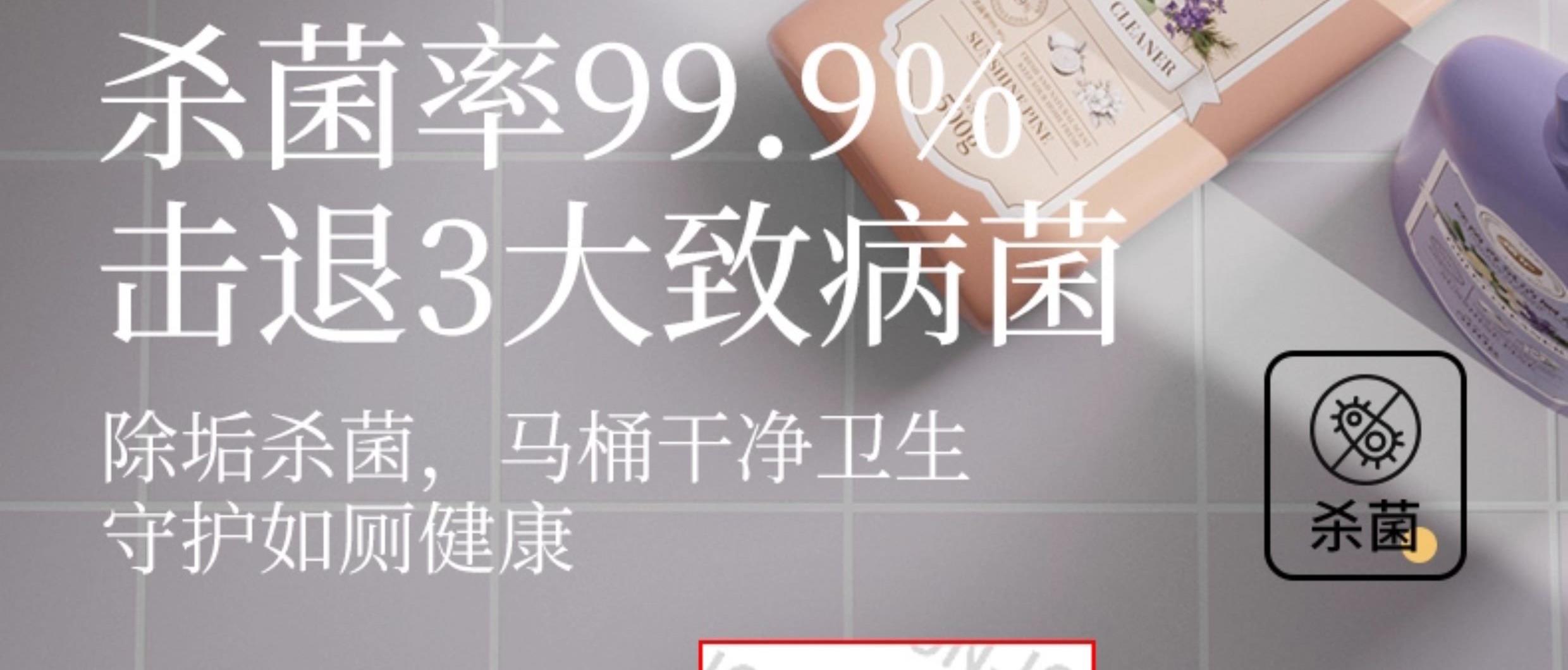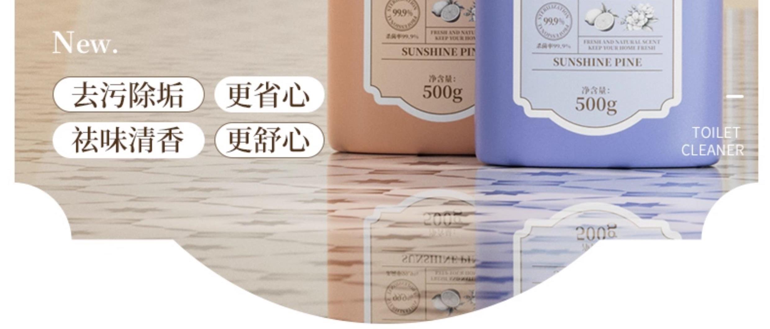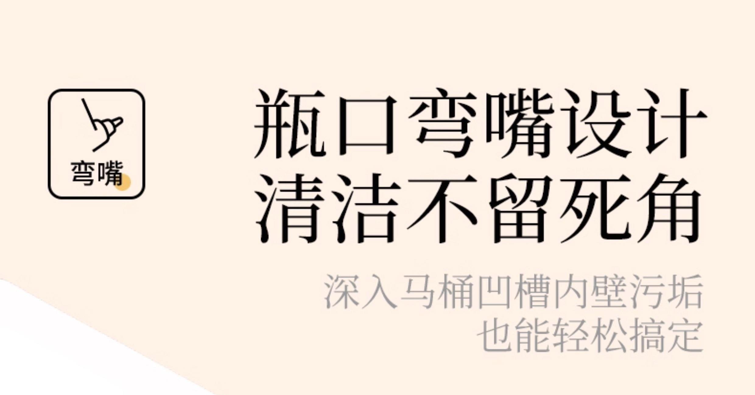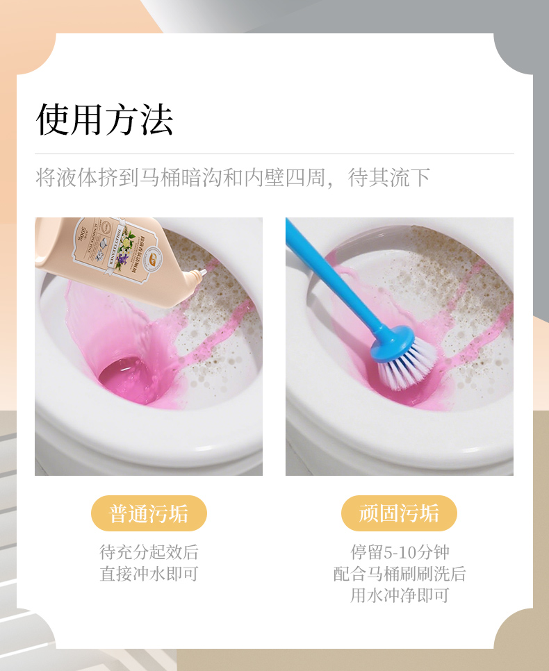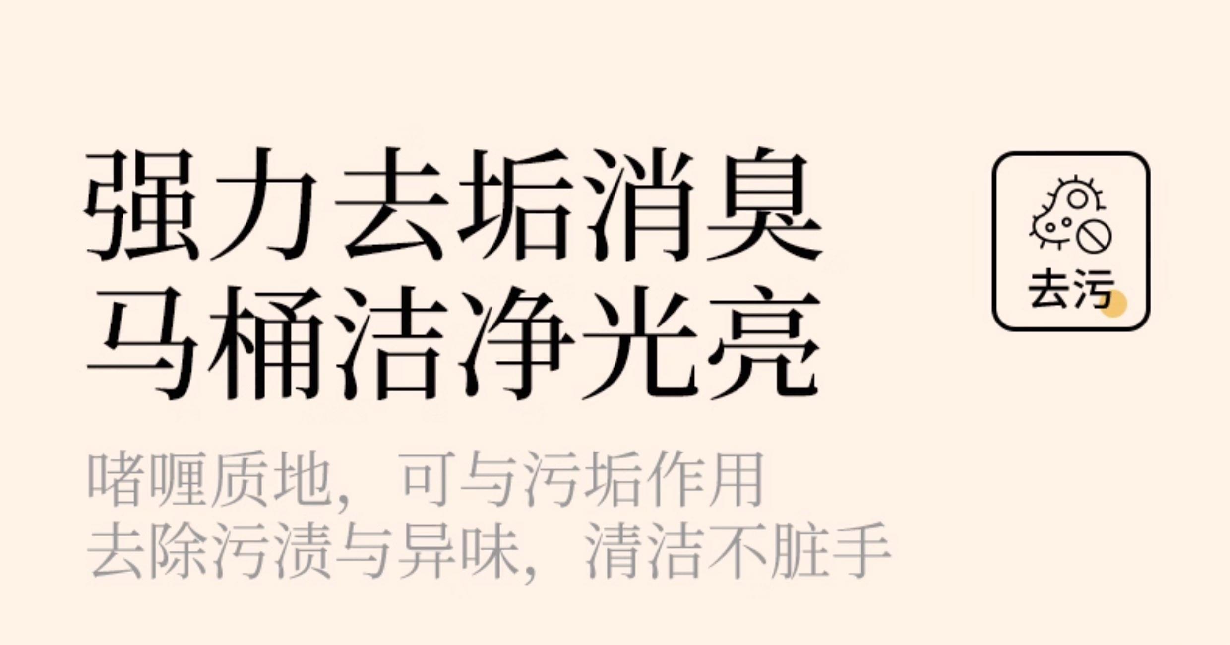 净含量:500g 香型:樱花树下、阳光松木 香型随机 主要成分:水、无机酸、表面活性剂、香精、防腐剂 适用范围:小便池、蹲式马桶、坐式马桶 注意事项: 1、请放置在几童和宠物接触不到的地方 2、请勿接触眼睛、皮肤、衣服以免灼伤,若不慎触及立即用清水冲洗 3、若有误食,请立即引用大量牛奶或清水,并立即就医 4、切勿与漂白剂或其他化学品一同使用,以免产生有害气体 1、瓶口弯嘴设计,深入马桶凹槽内壁污垢,清洁不留死角; 2、植物香氛配方,净味消臭,清新香气萦绕; 3、99.9%率,除垢,马桶干净卫生; 4、除垢不腐蚀,不破坏马桶釉面光泽,安心使用; 5、强力除垢,祛除异味,快速分解瓦解污渍。