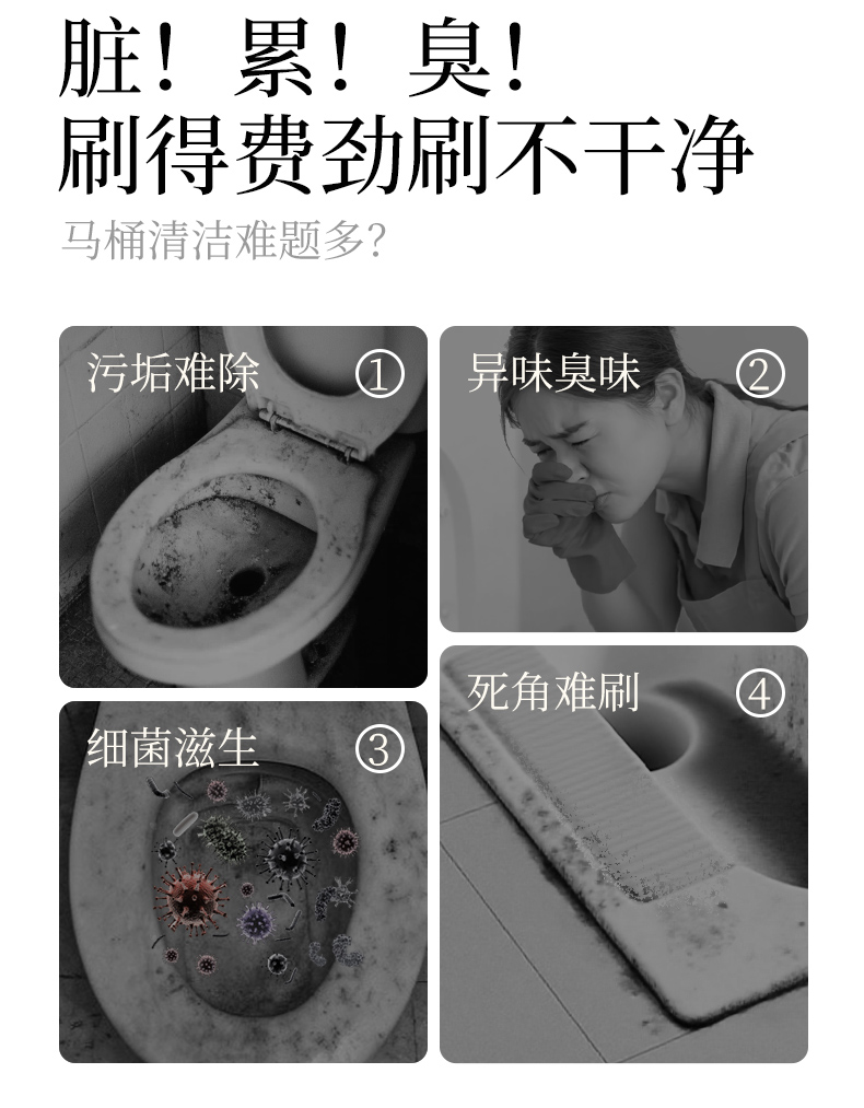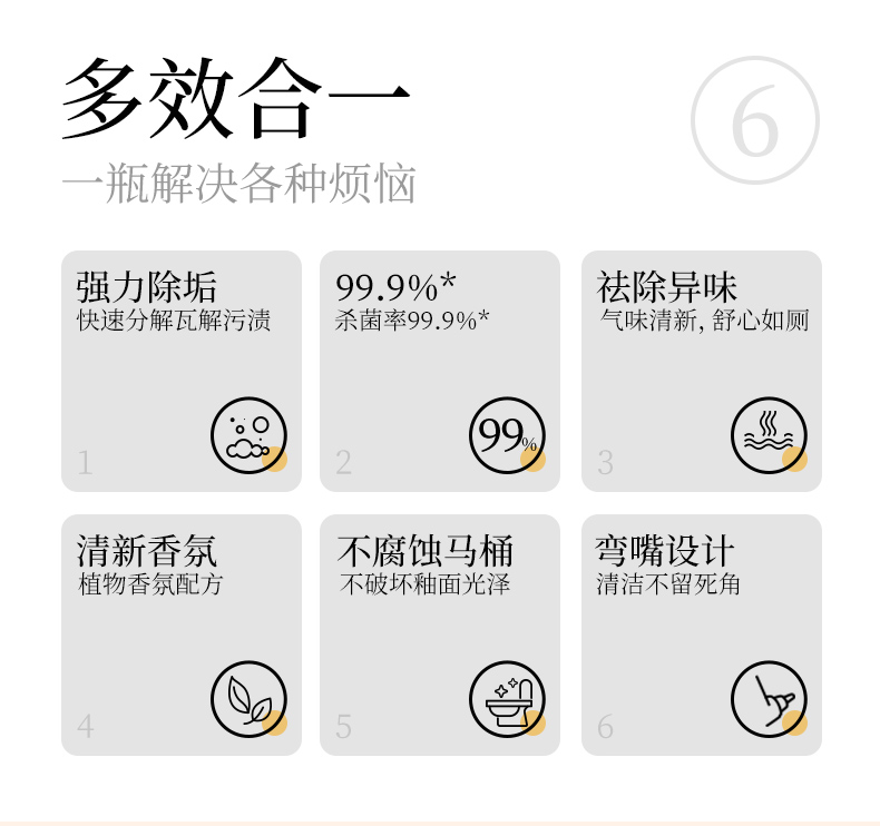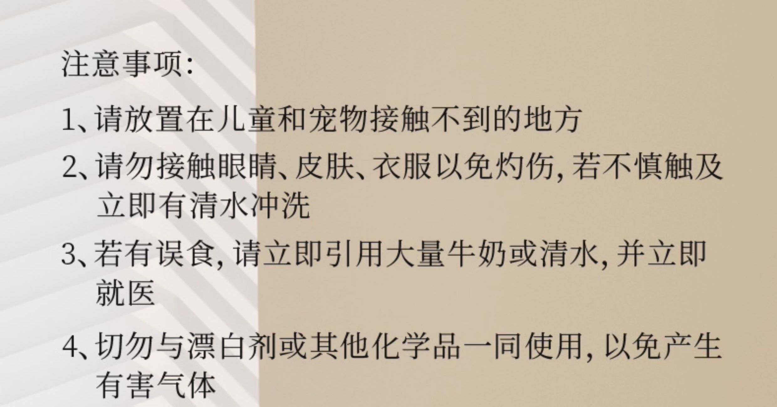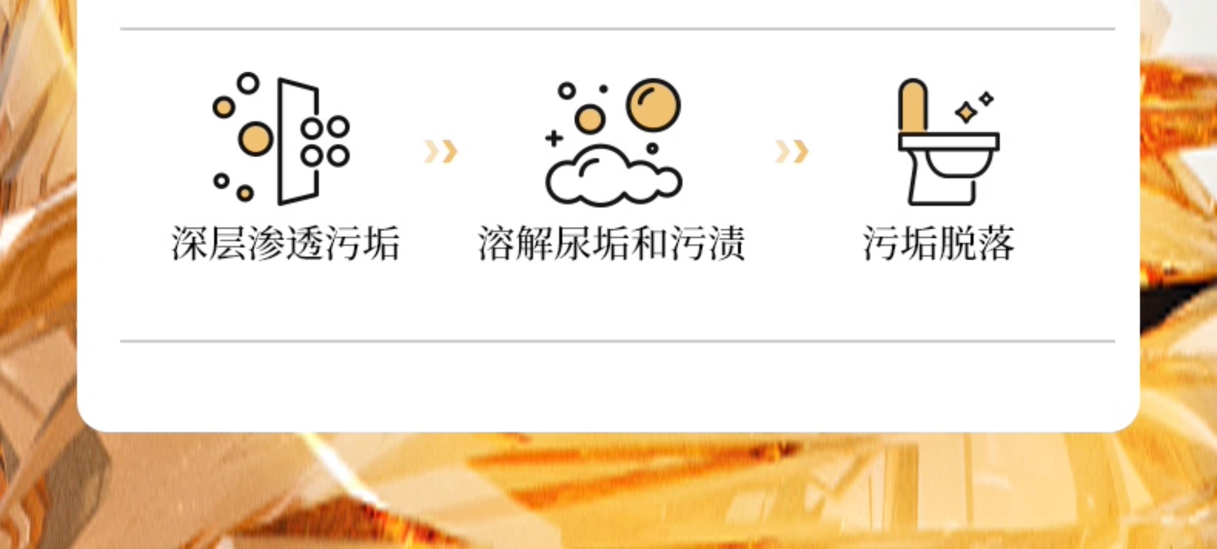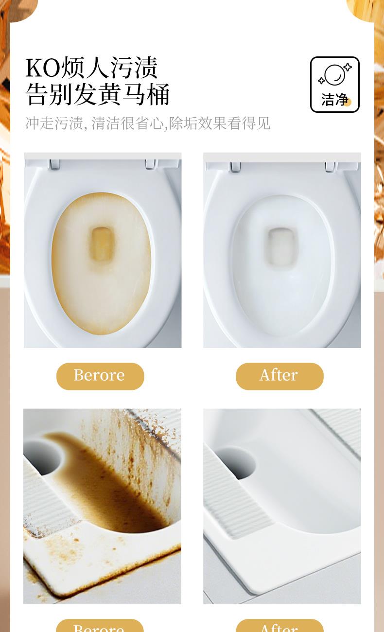 净含量:500g 香型:樱花树下、阳光松木 香型随机 主要成分:水、无机酸、表面活性剂、香精、防腐剂 适用范围:小便池、蹲式马桶、坐式马桶 注意事项: 1、请放置在几童和宠物接触不到的地方 2、请勿接触眼睛、皮肤、衣服以免灼伤,若不慎触及立即用清水冲洗 3、若有误食,请立即引用大量牛奶或清水,并立即就医 4、切勿与漂白剂或其他化学品一同使用,以免产生有害气体 1、瓶口弯嘴设计,深入马桶凹槽内壁污垢,清洁不留死角; 2、植物香氛配方,净味消臭,清新香气萦绕; 3、99.9%率,除垢,马桶干净卫生; 4、除垢不腐蚀,不破坏马桶釉面光泽,安心使用; 5、强力除垢,祛除异味,快速分解瓦解污渍。