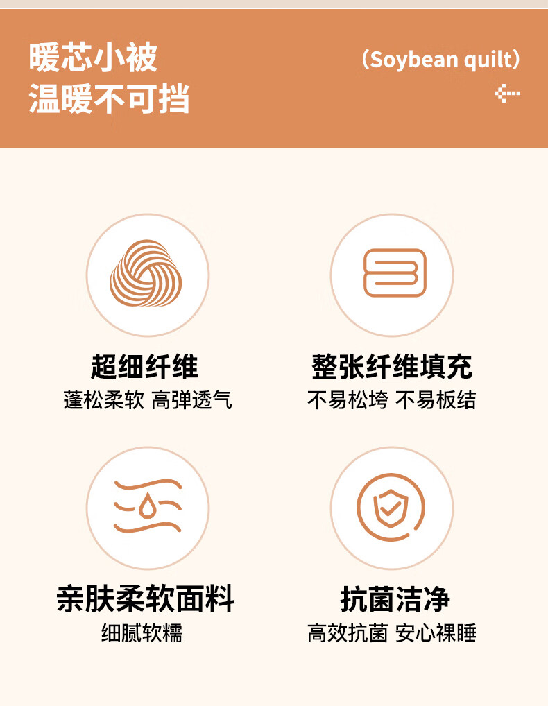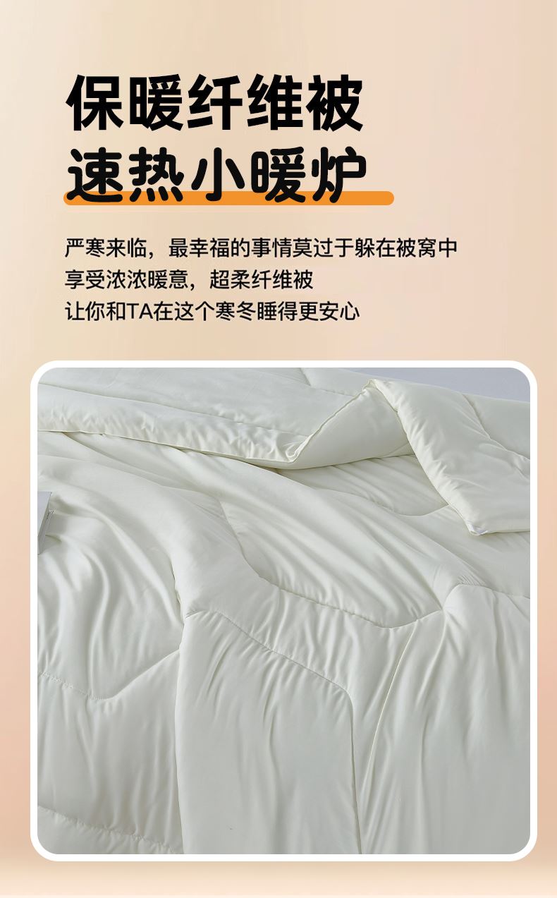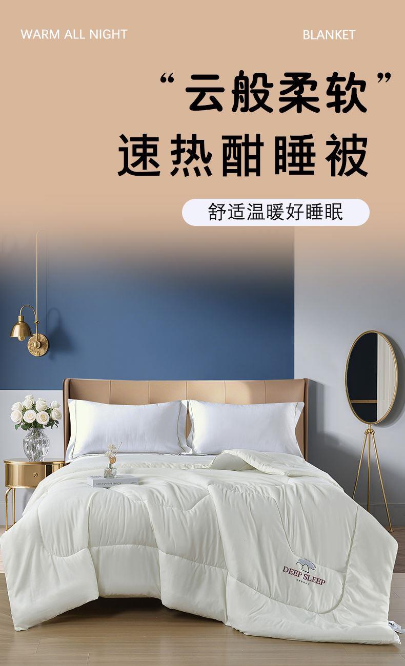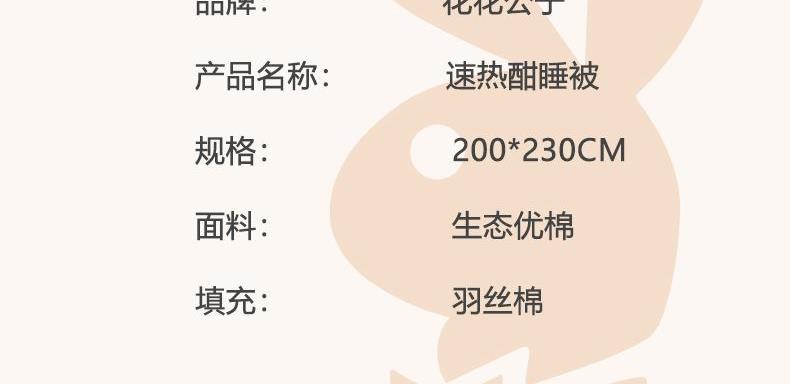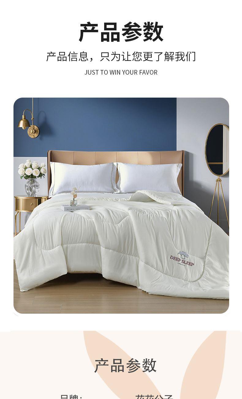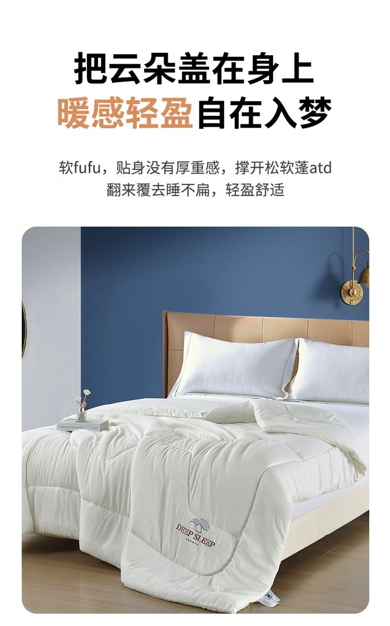 规格:200*230cm 面料: 生态优棉 填充: 羽丝棉 重量:2000g 执行标准:GB/T22796-2021 安全类别:GB18401-2010 B类 1.甄选优质生态优棉纤维面料,优棉织物是一种功能性织造方式,在保留面料原有性能的同时,通过再加工,使织物表面形成一层层细腻的短绒毛层的感觉 2.采用羽丝棉填充,柔软蓬松,亲肤性佳,回弹性优,贴身覆盖且轻盈。
