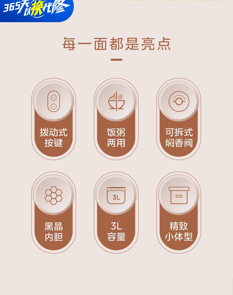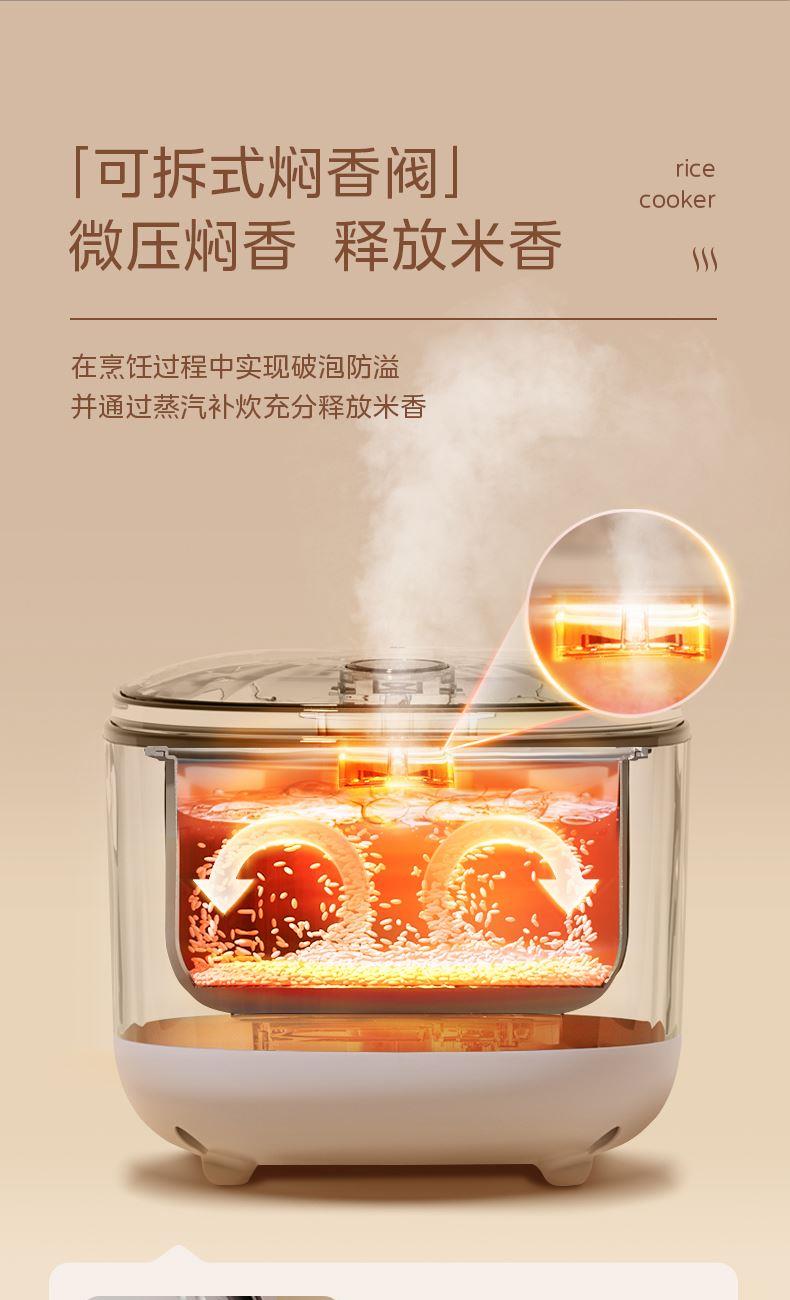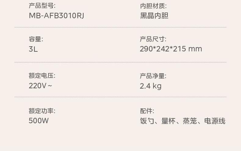 产品尺寸:290*242*215mm 产品净重:2.4kg 产品容量:3L 额定电压:220V 额定功率:500W 产品配件:饭勺、量杯、蒸笼、电源线 产品卖点 3L可视大视窗,双旋钮控制,简单易操作 金属内腔,高温烹饪无异味 轻音扇叶,低音烹饪 加深锅体,整鸡无压力 水雾嫰烤,外酥里嫩不干柴