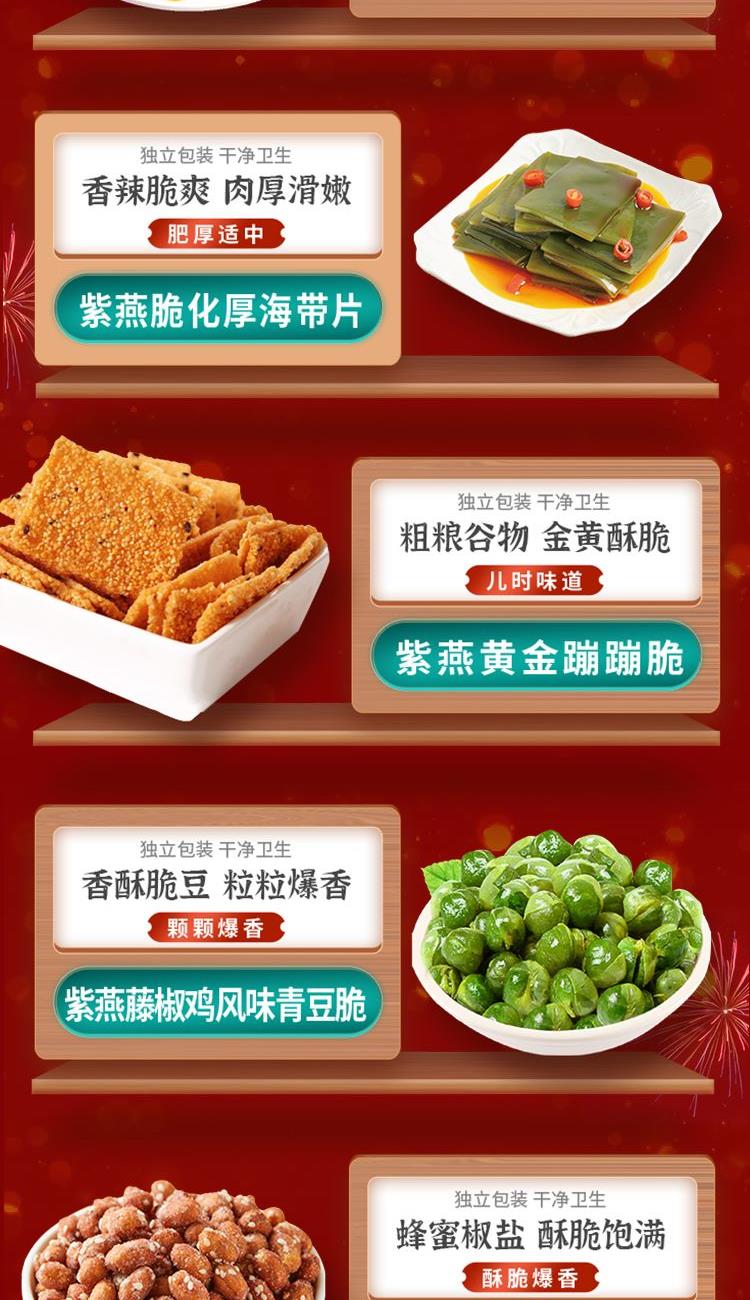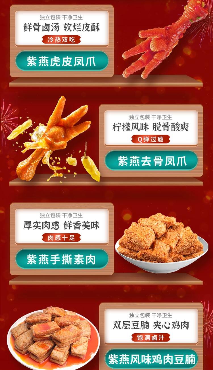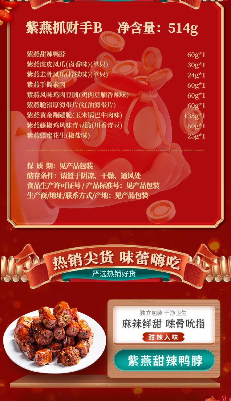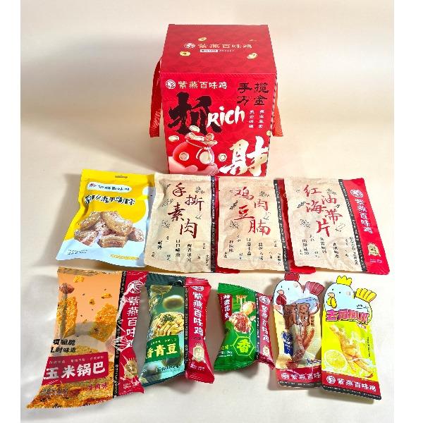 紫燕甜辣鸭脖60g*1 紫燕虎皮凤爪(卤香味)(单只)30g*1 紫燕去骨凤爪(柠檬味)(单只)24g*1 紫燕手撕素肉60g*1 紫燕风味鸡肉豆腩(鸡肉豆腩香辣味)60g*1 紫燕脆滑厚海带片(红油海带片)60g*1 紫燕黄金蹦蹦脆(玉米锅巴牛肉味)135g*1 紫燕藤椒鸡风味青豆脆(川香青豆)60g*1 紫燕蜂蜜花生(椒盐味)25g*1 礼盒+组装+外盒