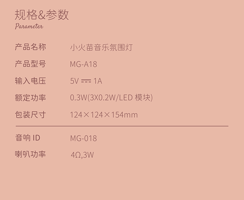 款式:蓝牙音箱款 八音盒款 材质:ABS+PC+PVC LED功率: 3*0.2W 输入电压:5V-1A 内置电池:蓝牙音箱1500MAH 八音盒 1200MAH 产品尺寸:120*120*146 包装尺寸:124*124*154 透明铃铛里跳动着温暖的小火苗 小女孩、小兔和小猫正围着光讲故事 像极了爱情里那些甜蜜的悄悄话 八音款 - 经典的旋律自动播放 蓝牙款 - 连接手机播放你们的专属BGM