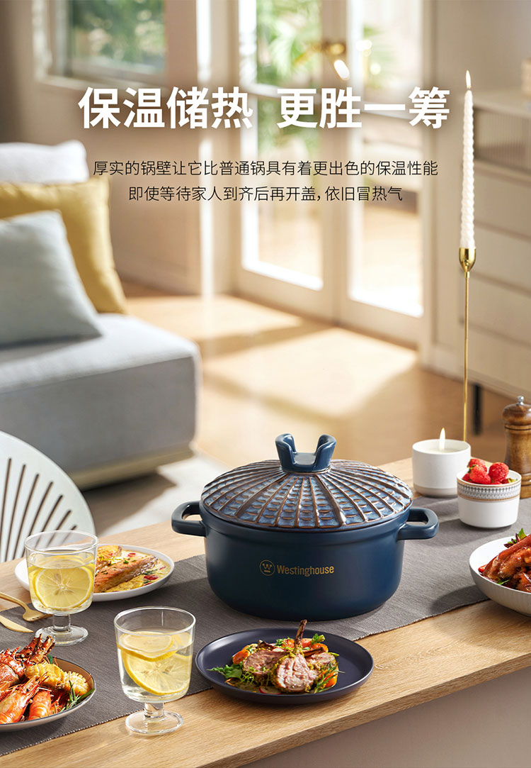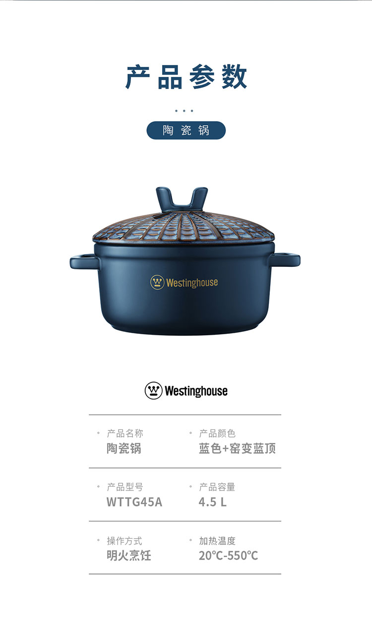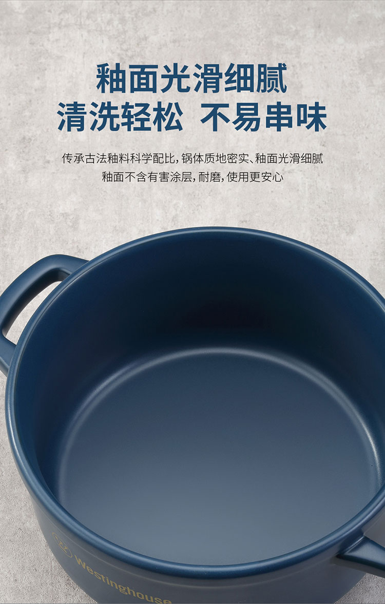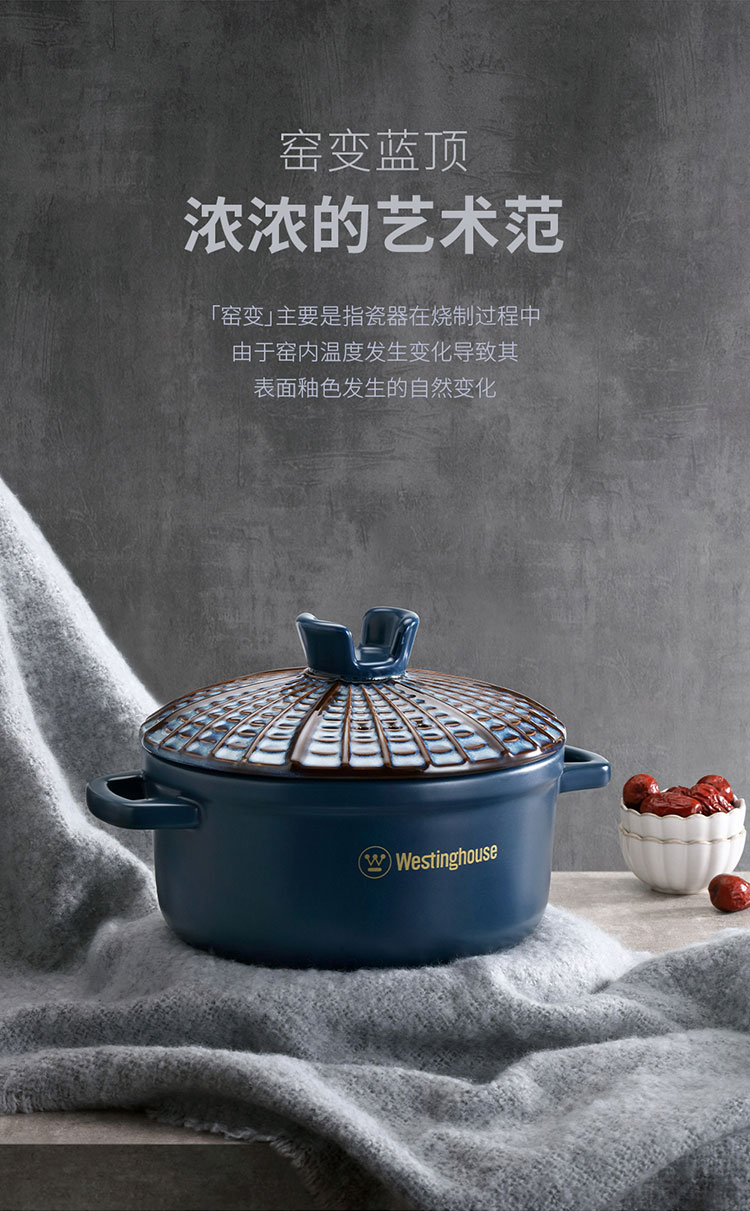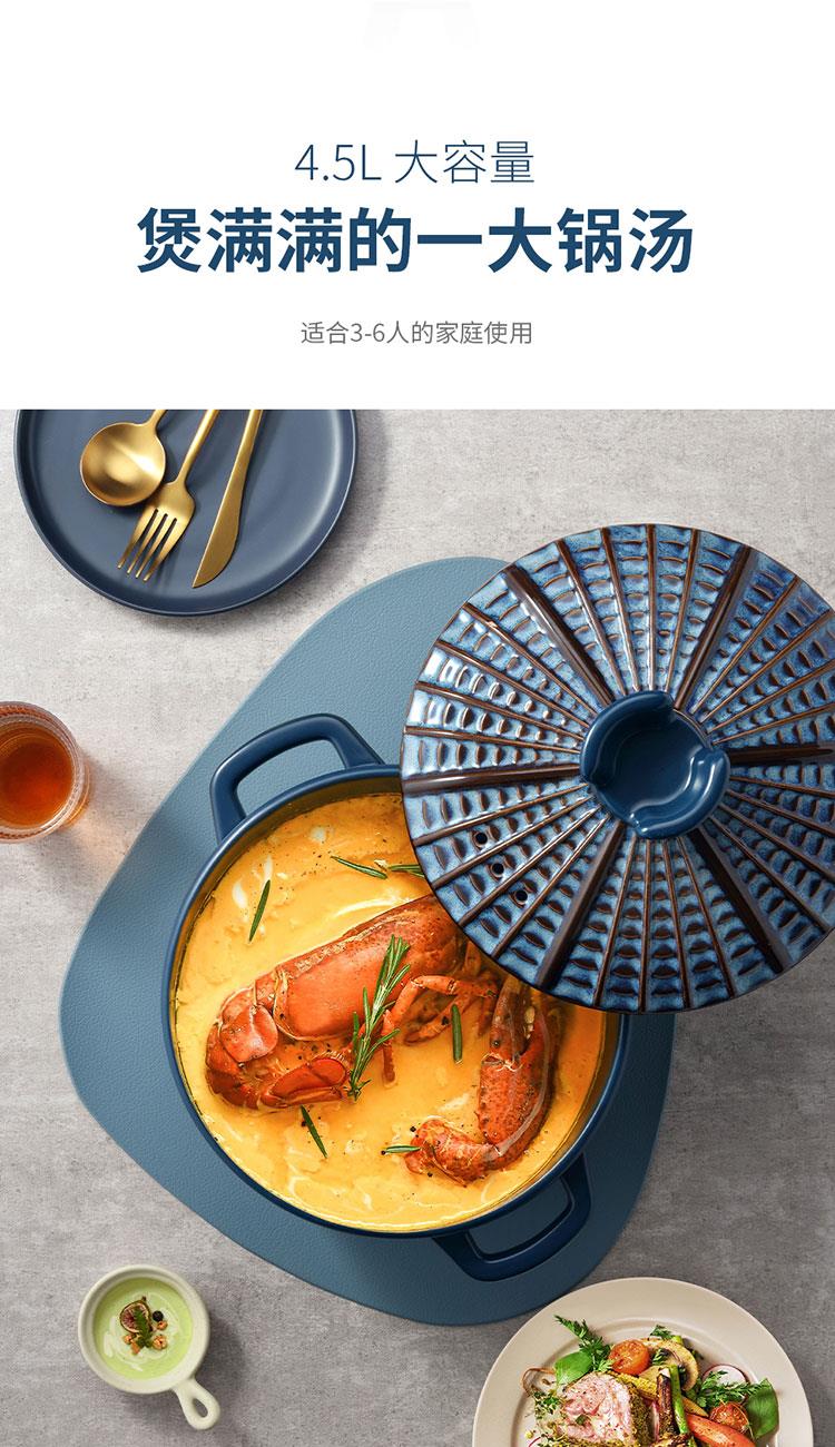 产品规格: 容量:4.5L 材质:陶瓷 颜色:蓝色+窑变蓝顶 产品重量:3.3kg 产品尺寸:25.5*12cm 产品特点: 采用天然原材料双锂配方,骤冷骤热不易开裂; 多气孔结构使锅体受热均匀,食物入味,保温更持久; 高硬度防水釉面,健康、环保 、无涂层; 古法釉科学配比,锅体质地密实、釉面光滑细腻; 1300℃高温烧制,冷热交替不开裂,热稳定性良好; 熬、煲、炖、煮、炸,样样通。