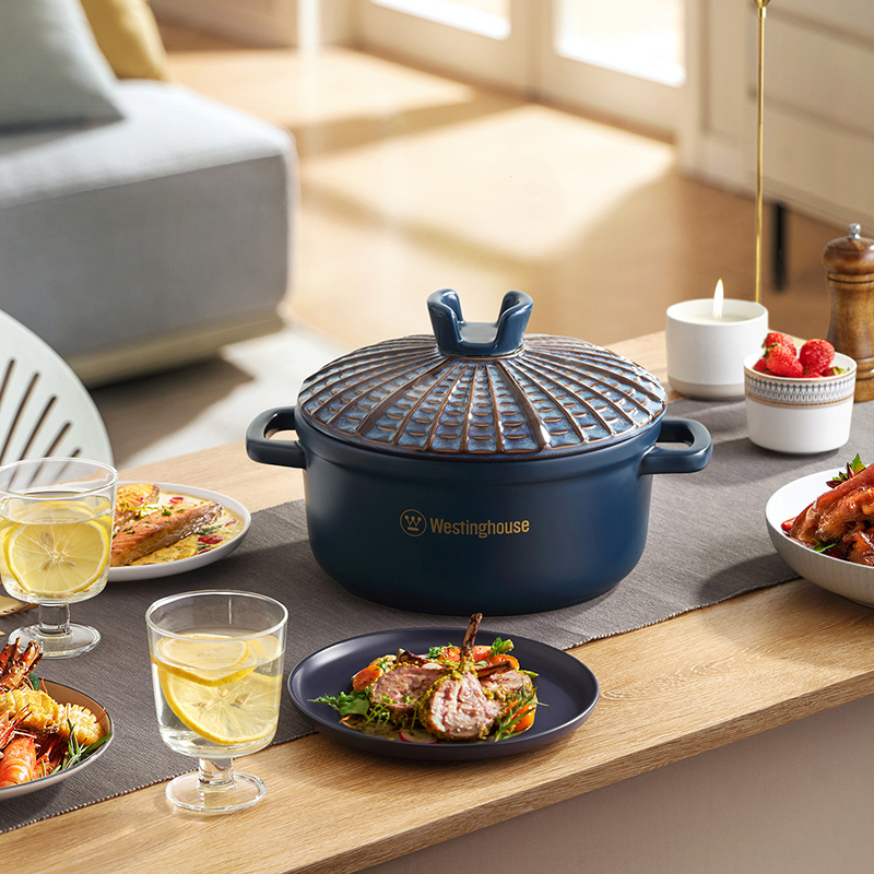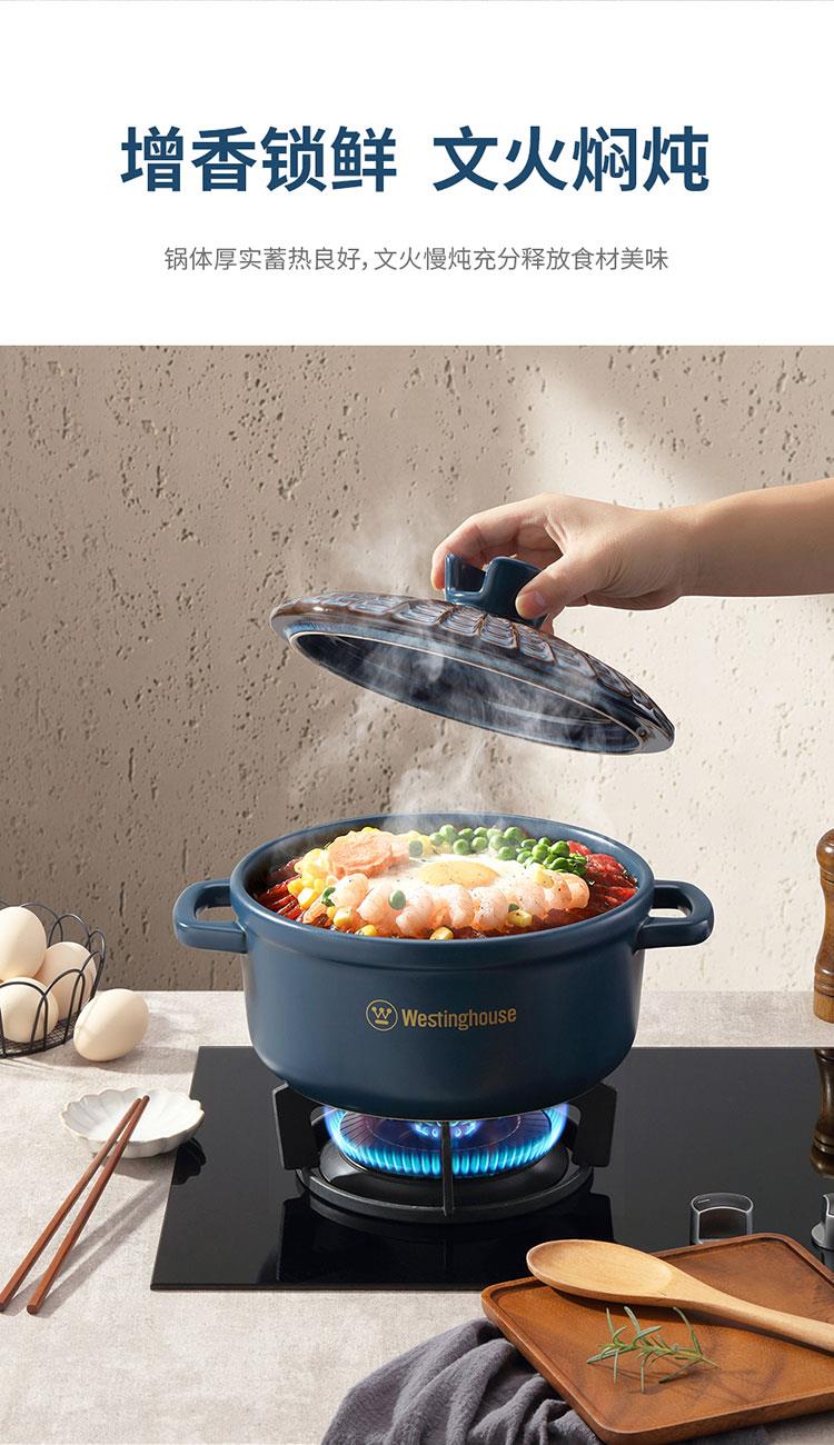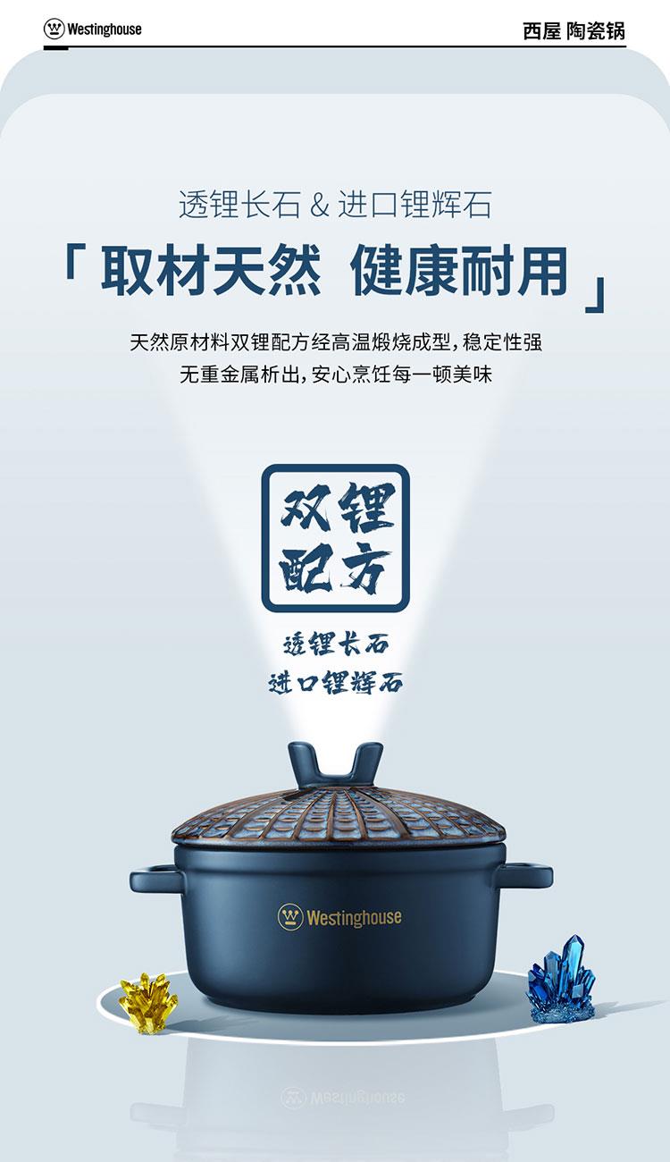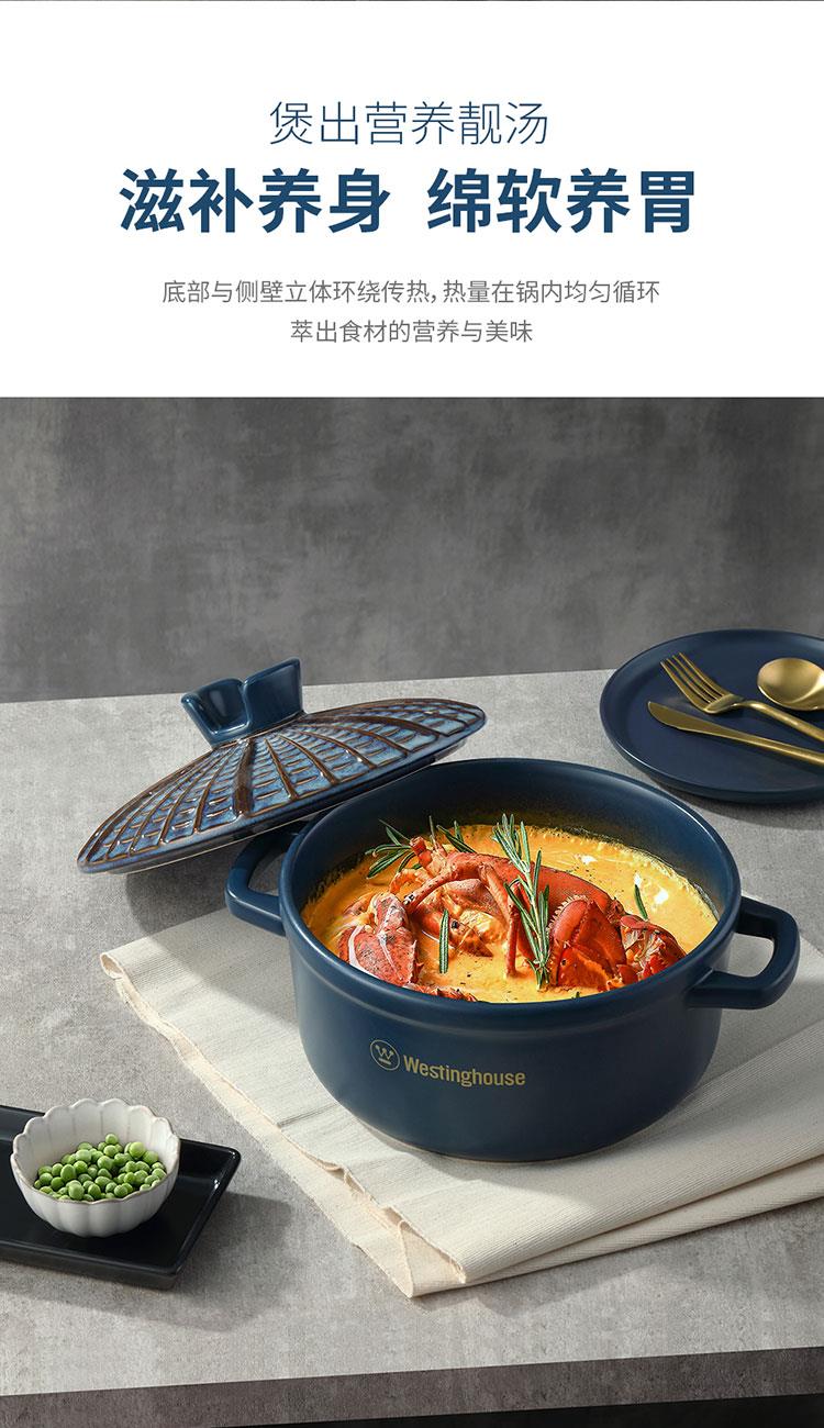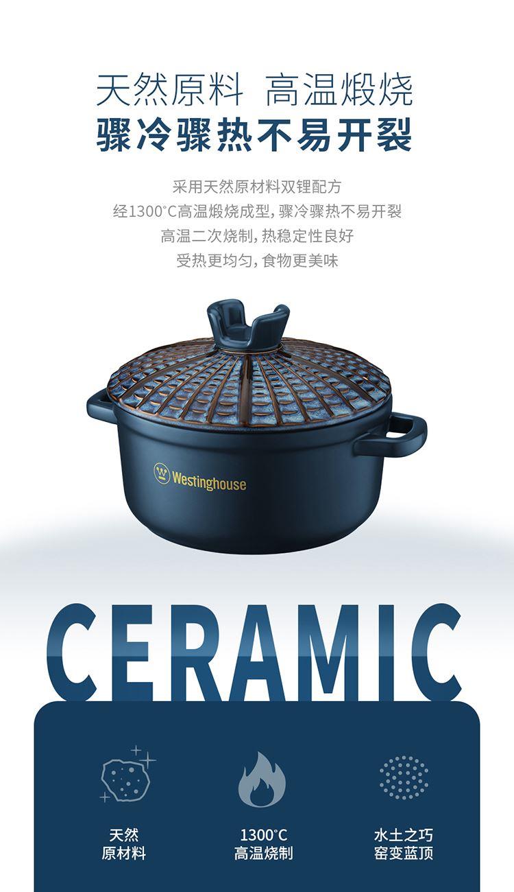 产品规格: 容量:4.5L 材质:陶瓷 颜色:蓝色+窑变蓝顶 产品重量:3.3kg 产品尺寸:25.5*12cm 产品特点: 采用天然原材料双锂配方,骤冷骤热不易开裂; 多气孔结构使锅体受热均匀,食物入味,保温更持久; 高硬度防水釉面,健康、环保 、无涂层; 古法釉科学配比,锅体质地密实、釉面光滑细腻; 1300℃高温烧制,冷热交替不开裂,热稳定性良好; 熬、煲、炖、煮、炸,样样通。
