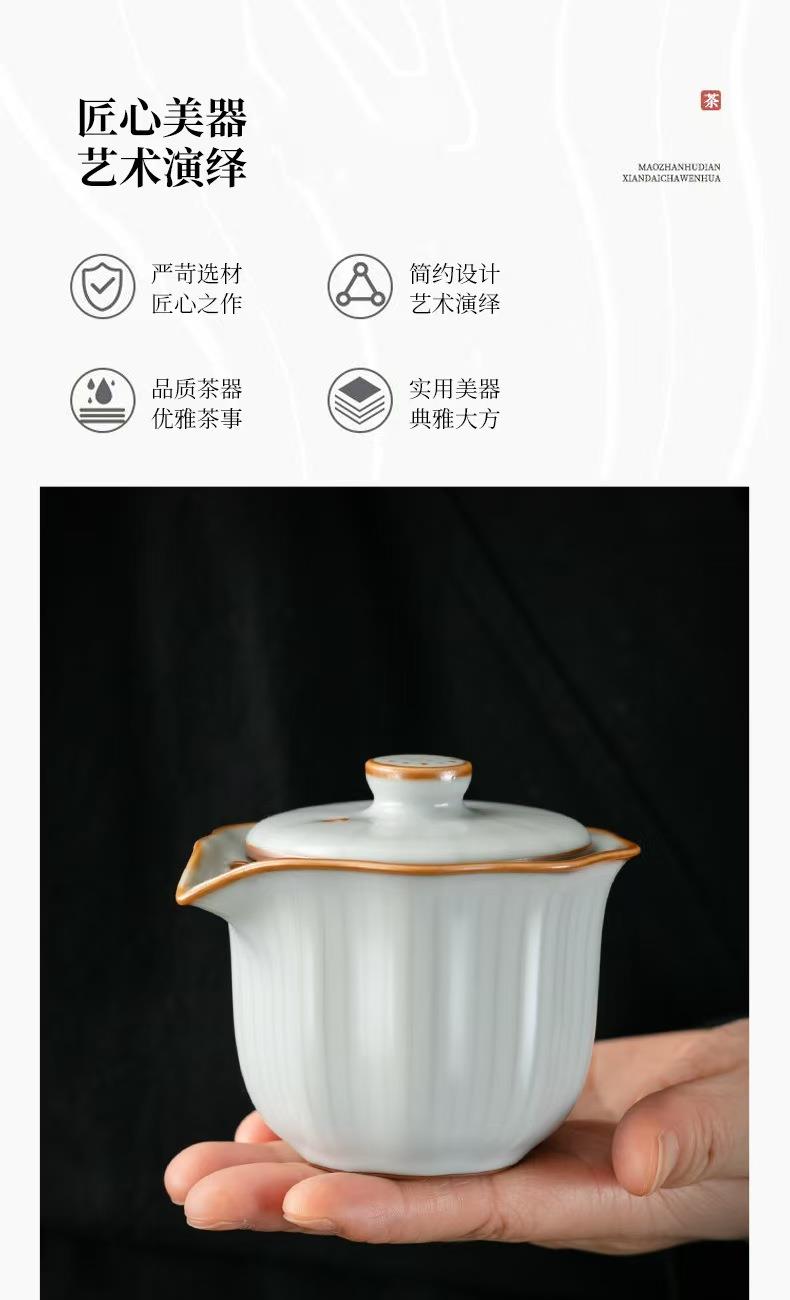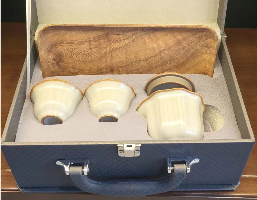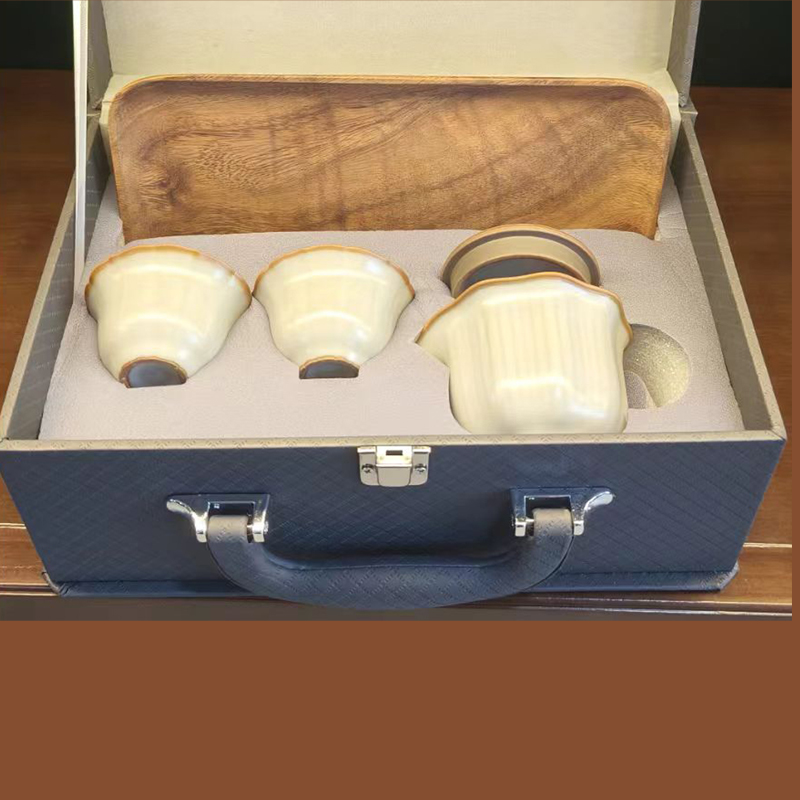 规 格:壶:9.8*8cm 杯7.1*4.2cm 配 制: 1壶2杯 1胡桃木茶盘 1手提锦盒 材质:黄汝瓷 胡桃木 皮箱 推荐说明:亚黄汝瓷,玛瑙入釉,蝉翼开片。技术新品,采用高价优质瓷土,紫口铁足。立体浮雕杯身。杯身开片,可养瓷。